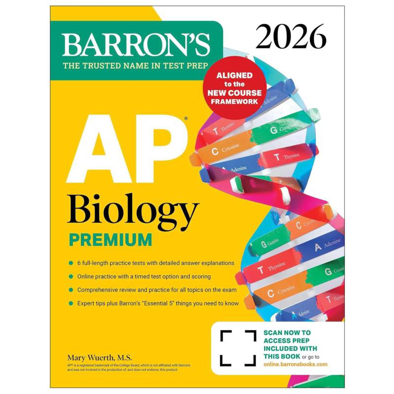 Barron’s AP Biology Premium, 2026 includes in‑depth content review and practice ALIGNED TO THE NEW COURSE FRAMEWORK. It’s the only book you’ll need to be prepared for exam day.