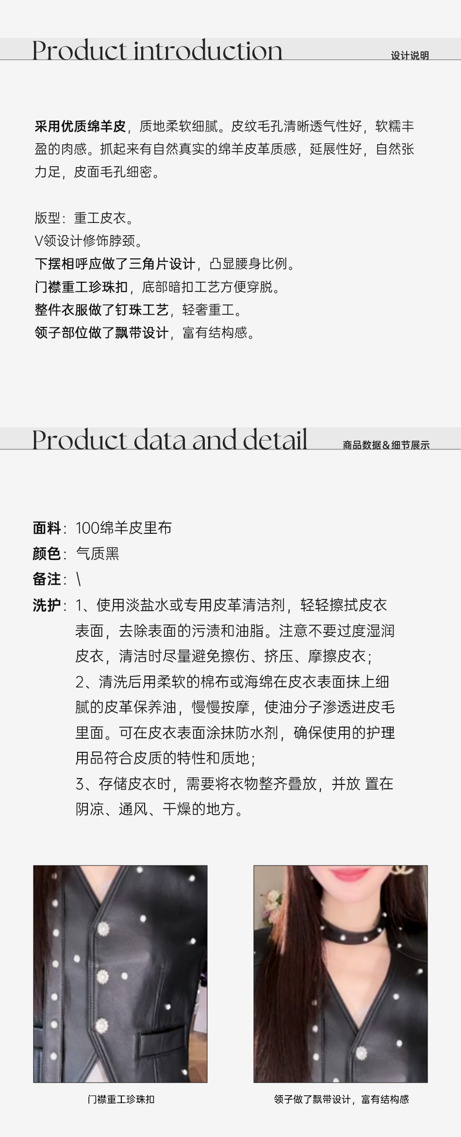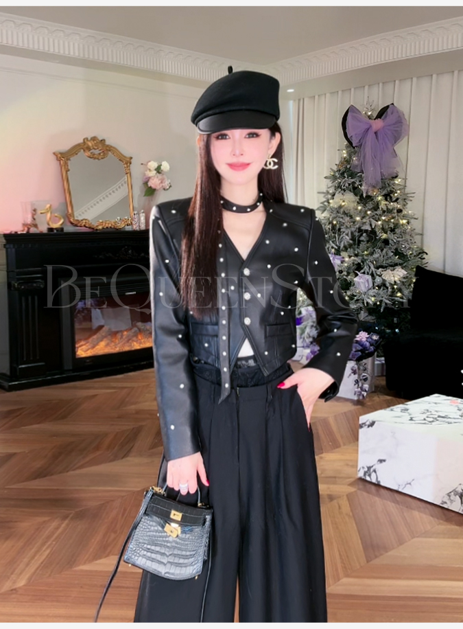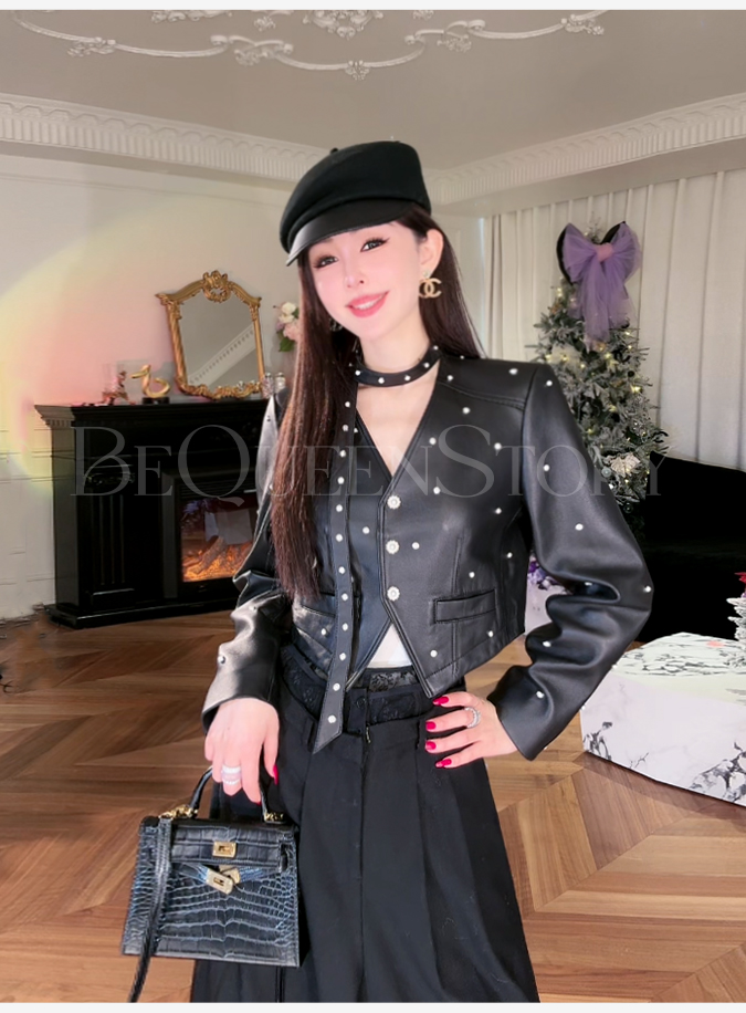 【孤品样衣,不退不换】【傲气女爵】2025春装百搭飘带优质绵羊皮钉珠V领皮衣