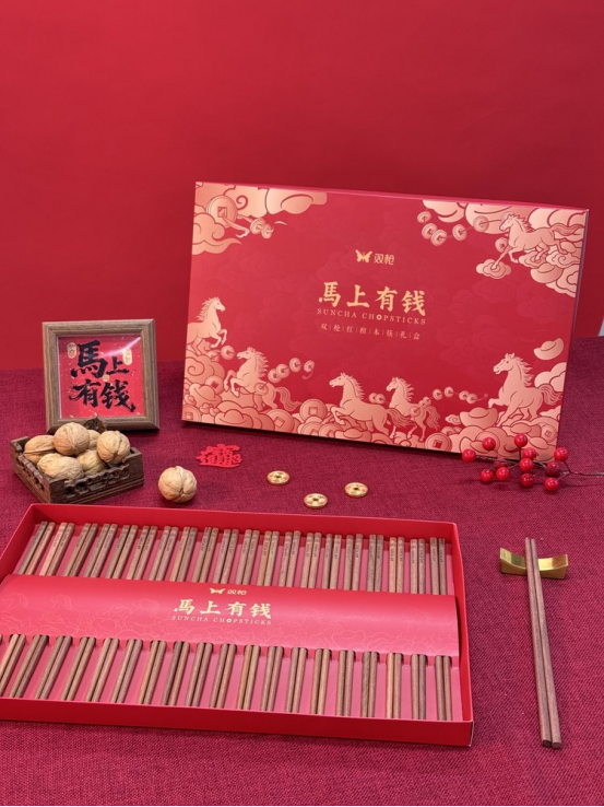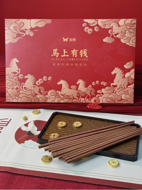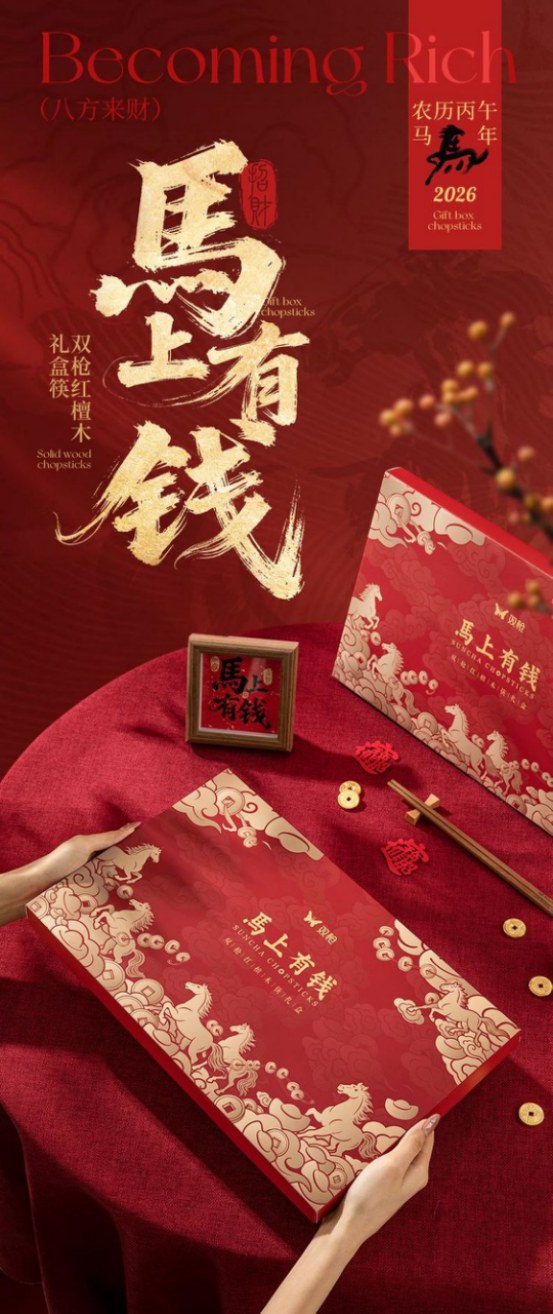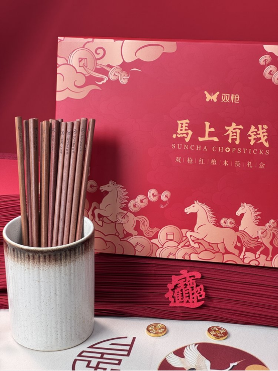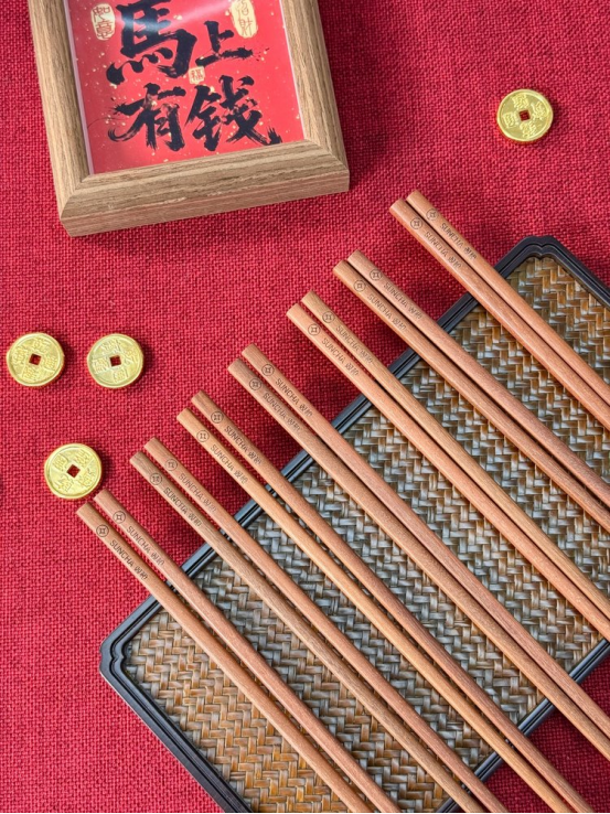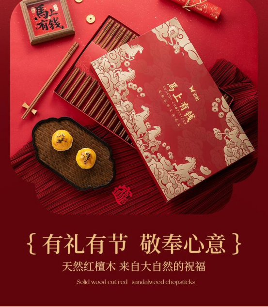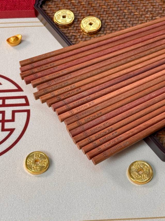 去年一团将近3w单的礼盒筷,26年全新升级! 【红檀木来财筷】 马上有钱,红檀木筷寓意财运“筷”来! 红檀木因色泽温润、纹理精美 如同皇后一般雍容华贵 受到文人雅士、贵族阶层的喜爱 是追求品质生活的首选之材