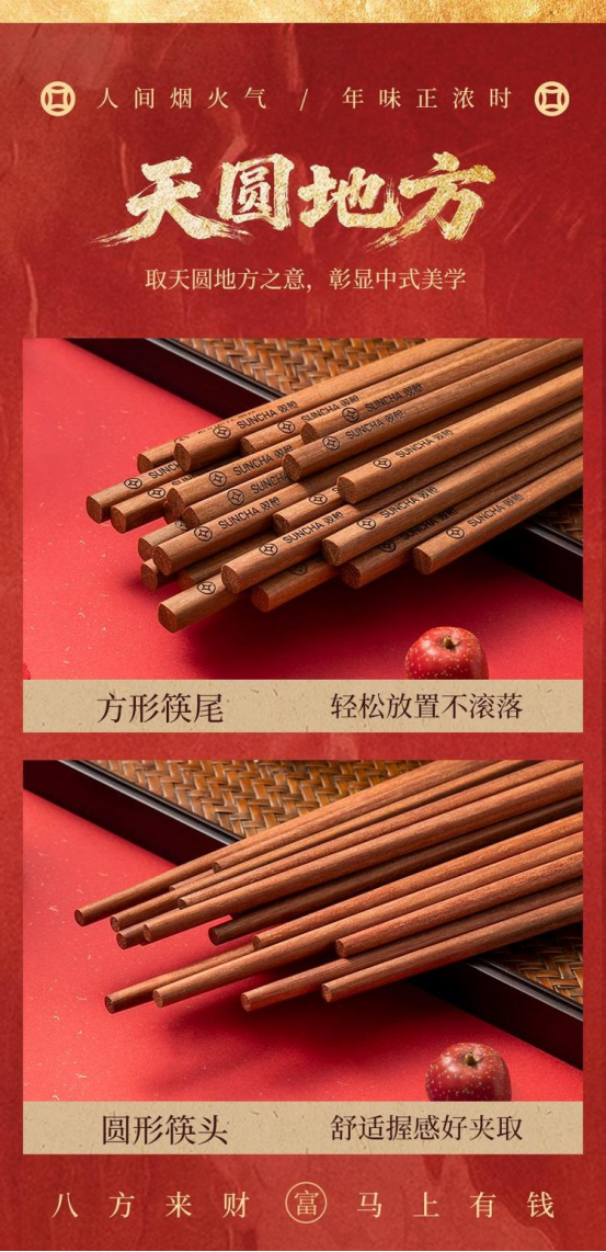 筷子作为中国传统文化的重要载体之一 其使用方式和文化内涵都深受“天圆地方”思想的影响 双枪秉承着继承中华优秀传统文化的理念 一直在坚持做中式筷,所谓中式筷 讲究“天圆地方”筷尾方形,轻松放置不滚落 筷头圆形,舒适握感好夹取,打磨光滑无毛刺