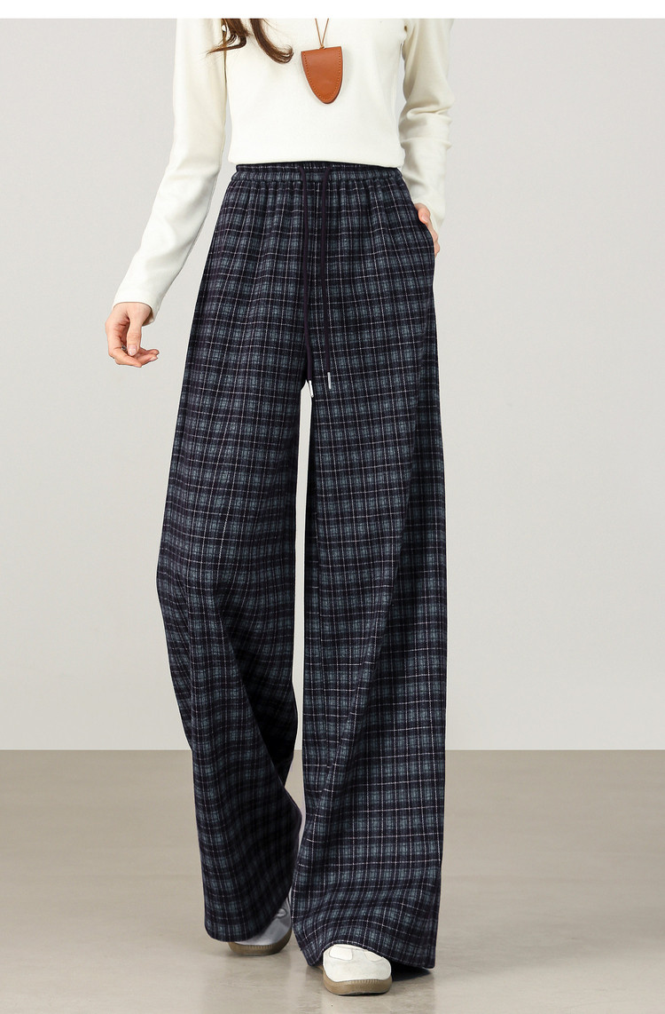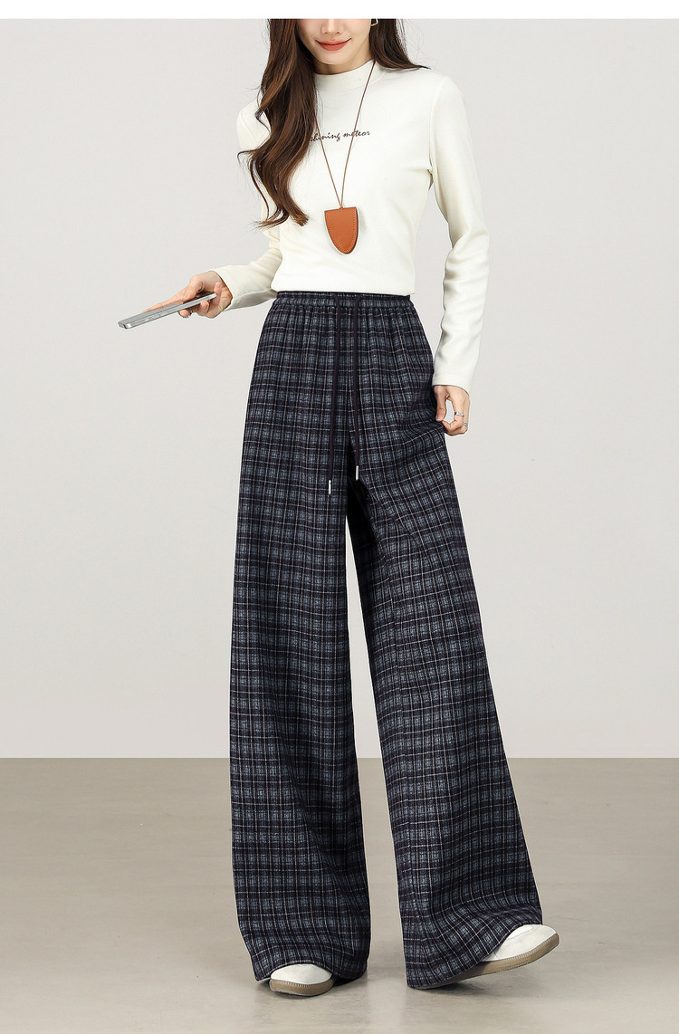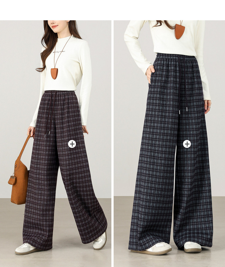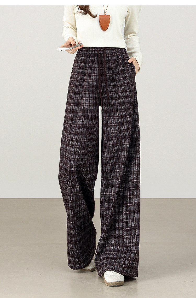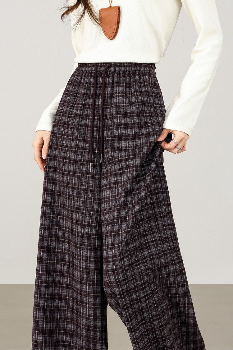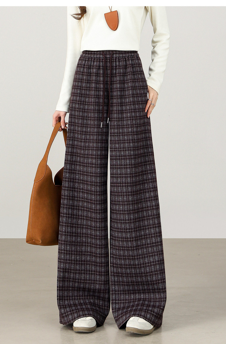 【12/31新品】熙世界美式复古格纹阔腿裤加绒加厚女秋冬慵懒休闲直筒毛呢长裤子