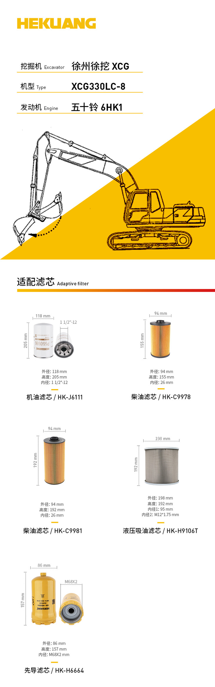 徐州徐挖XCG330LC-8(五十铃6HK1)挖掘机滤芯 机油柴油空气滤芯 液压油先导滤芯