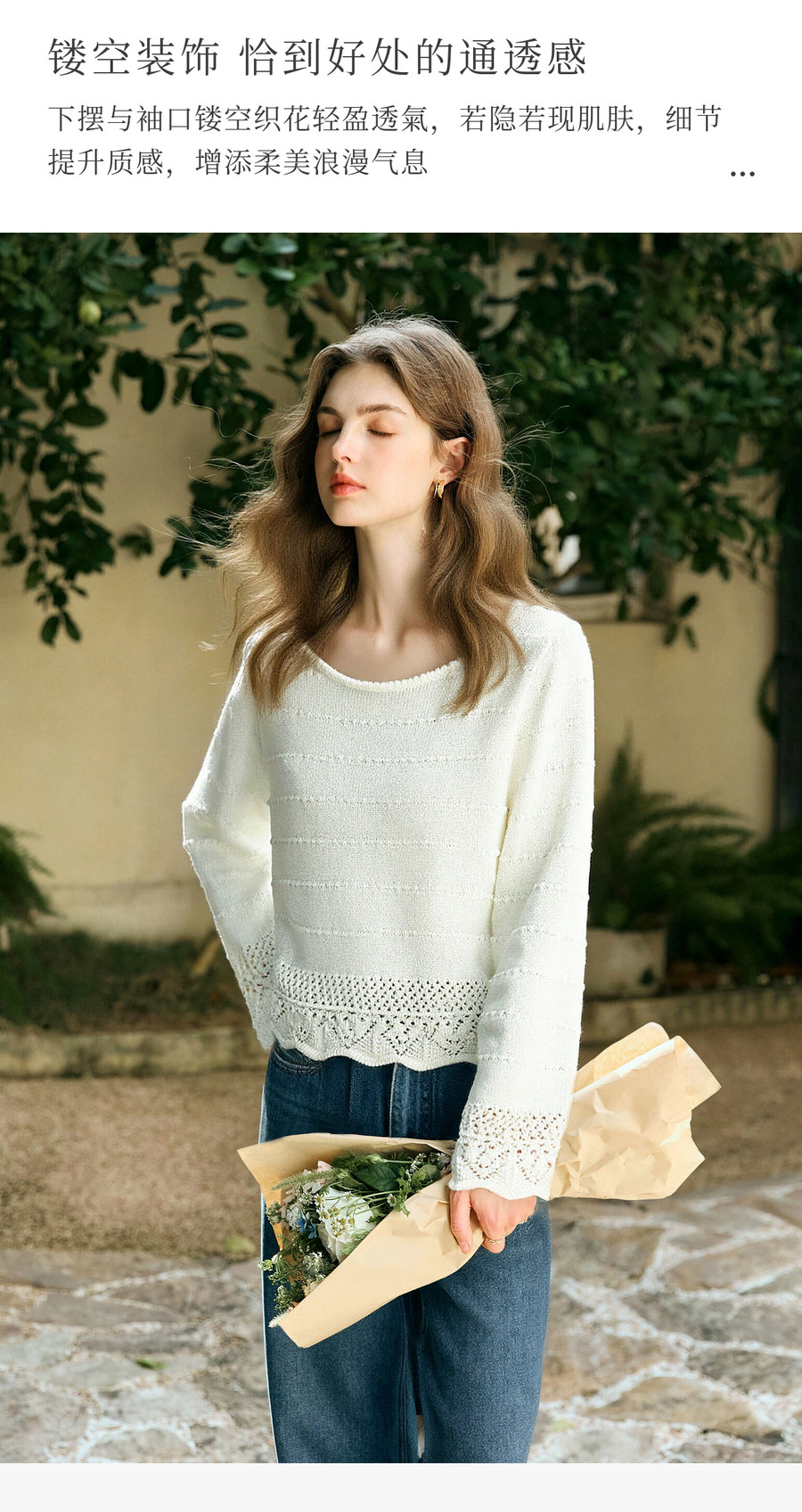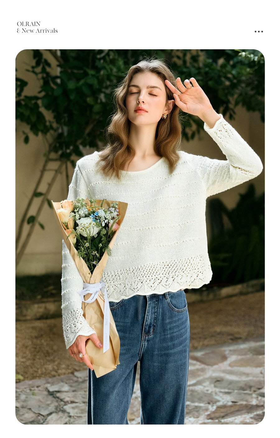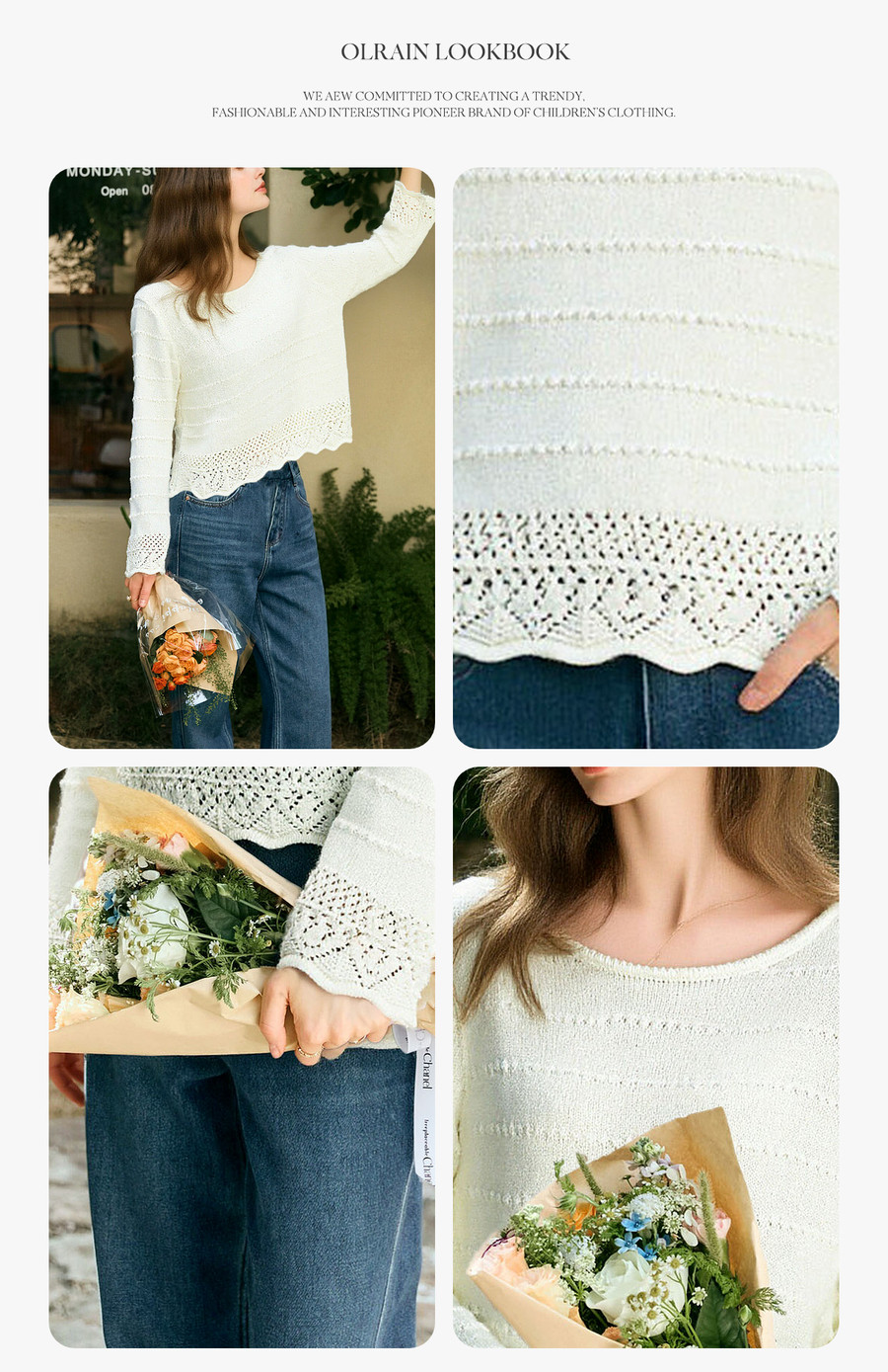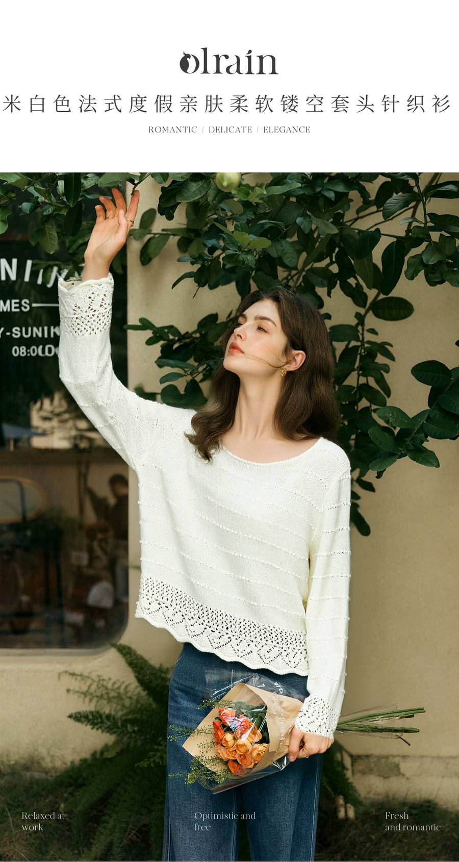 OLrain欧芮儿法式度假风镂空圆领针织衫2026新款女春季长袖套头衫