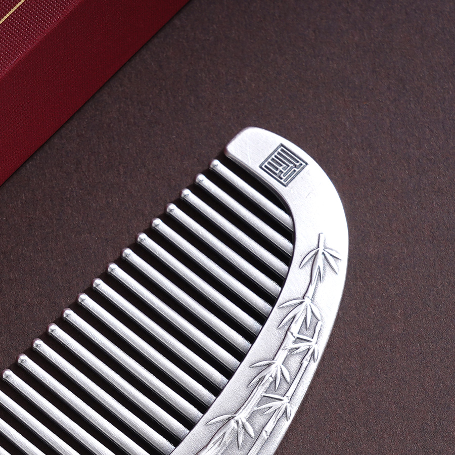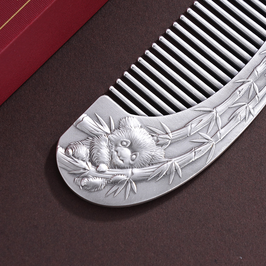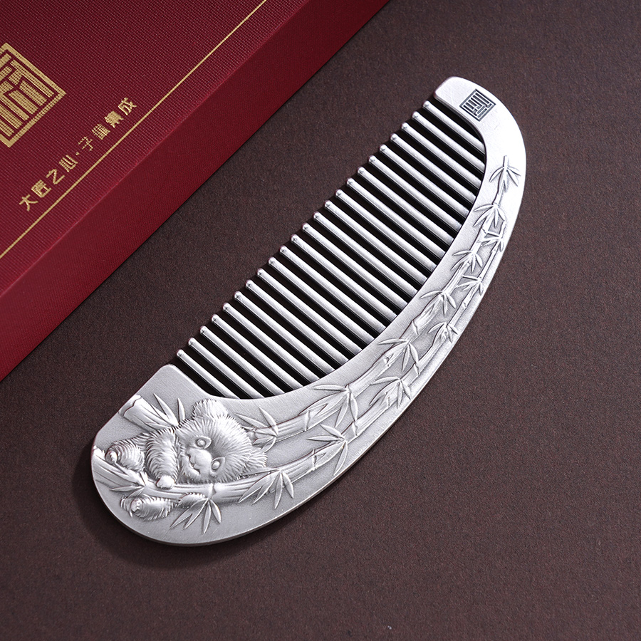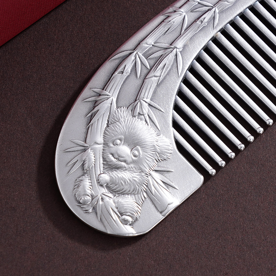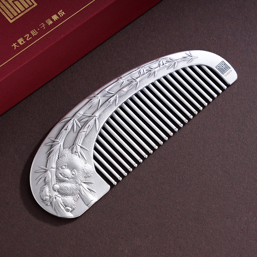 【寓意】:银梳通体精细打磨,平滑细腻,质感十足。熊猫与竹巧妙融入梳柄设计之中,为银梳增添了一抹动态之美。整体设计围绕国宝乐园展开,寓意幸福繁荣、自然和谐。