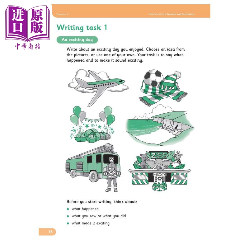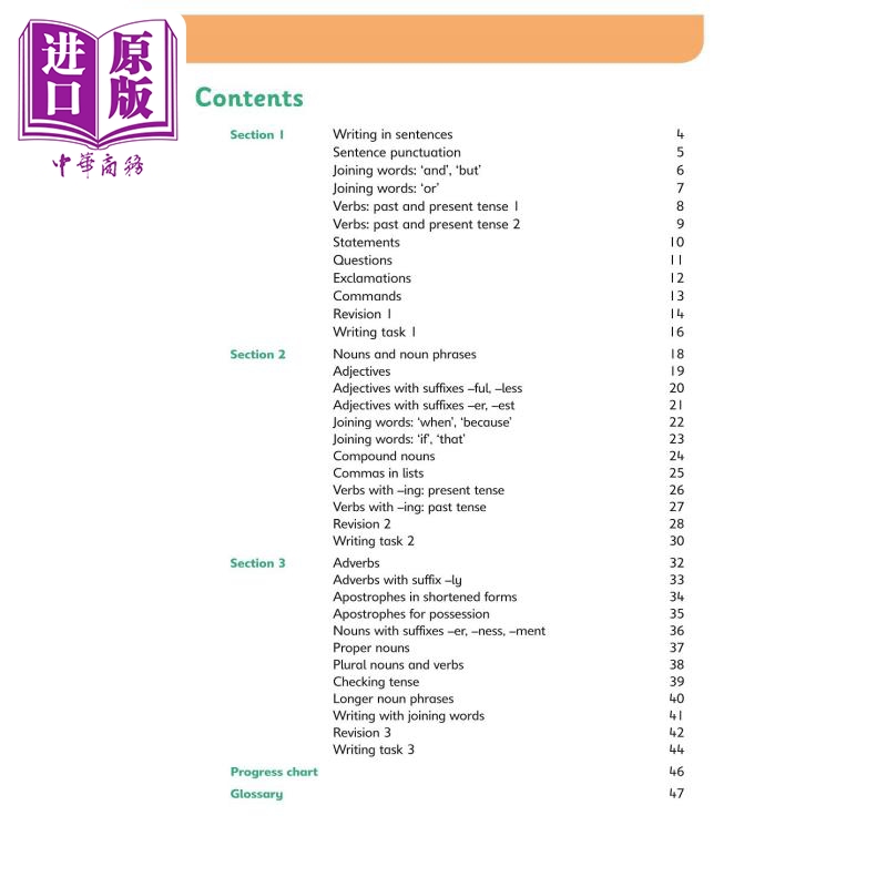 每个练习页都包含每节课关键学习点的简明摘要,后面是两个简短的“尝试”练习和一个“句子练习”活动。常规 复习 页面强化学习,而富有想象力的 写作任务 让孩子们可以在更正式的语境中“炫耀”他们的语法和标点技能。书后提供的其他功能包括 词汇表, 以支持自信地使用语法术语,以及自我评估清单,以鼓励学生评估自己的学习。