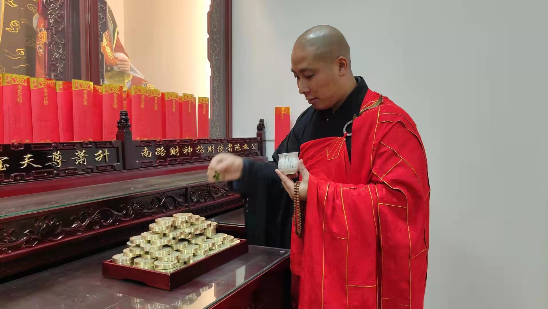 目前已经运抵达江苏马躲寺,妙智法师帅众法师为供养钱洒净开光,大年初五马躲寺五路财神开光大典,还将诵经加持!该币为马躲寺定制,