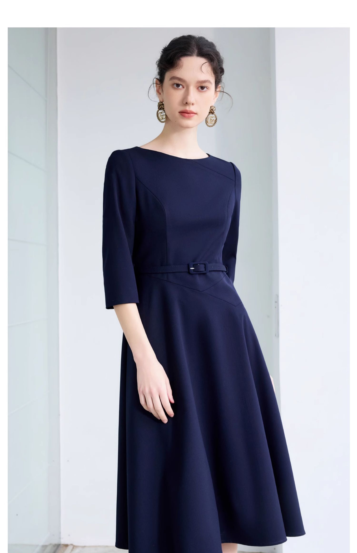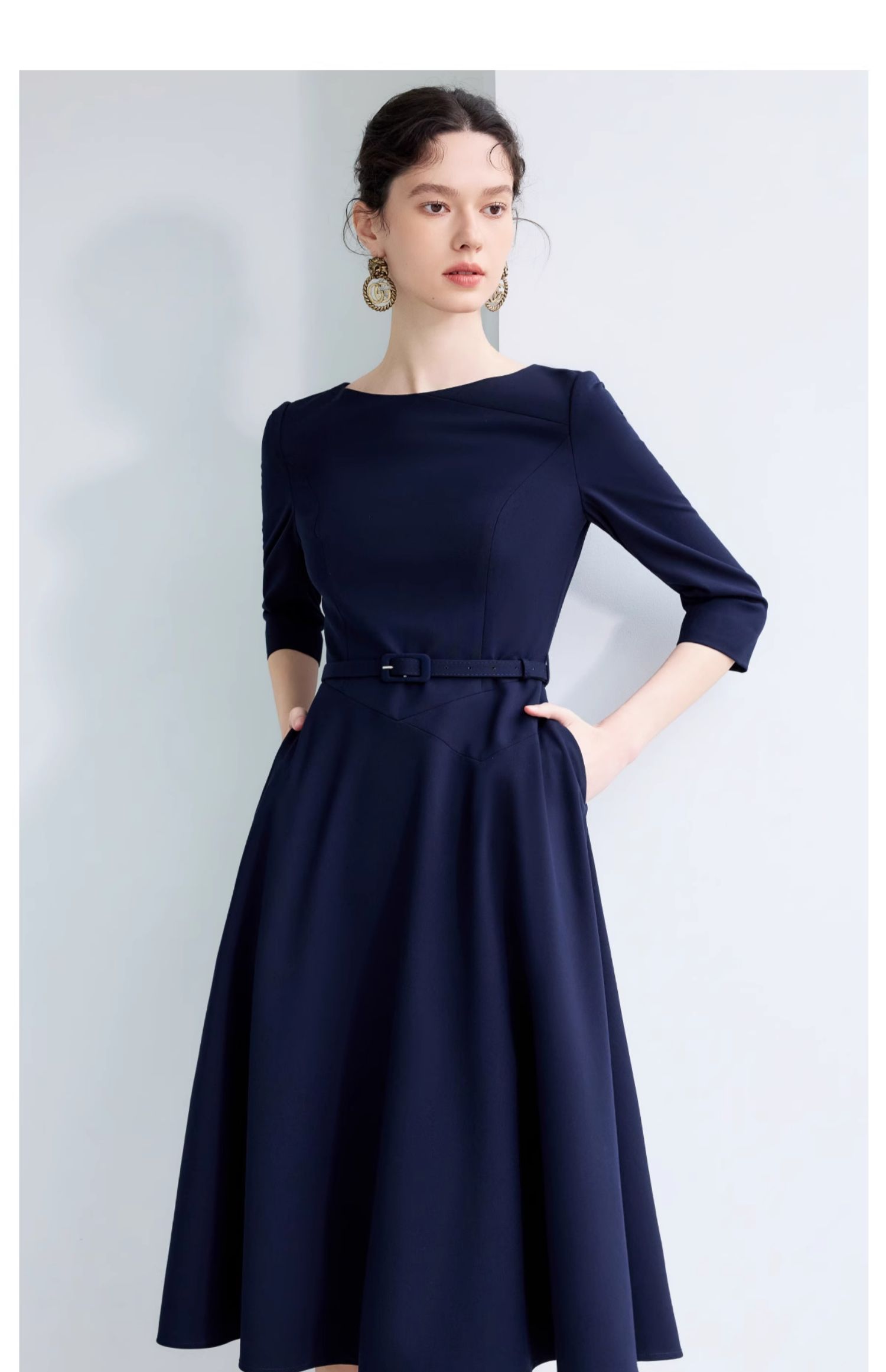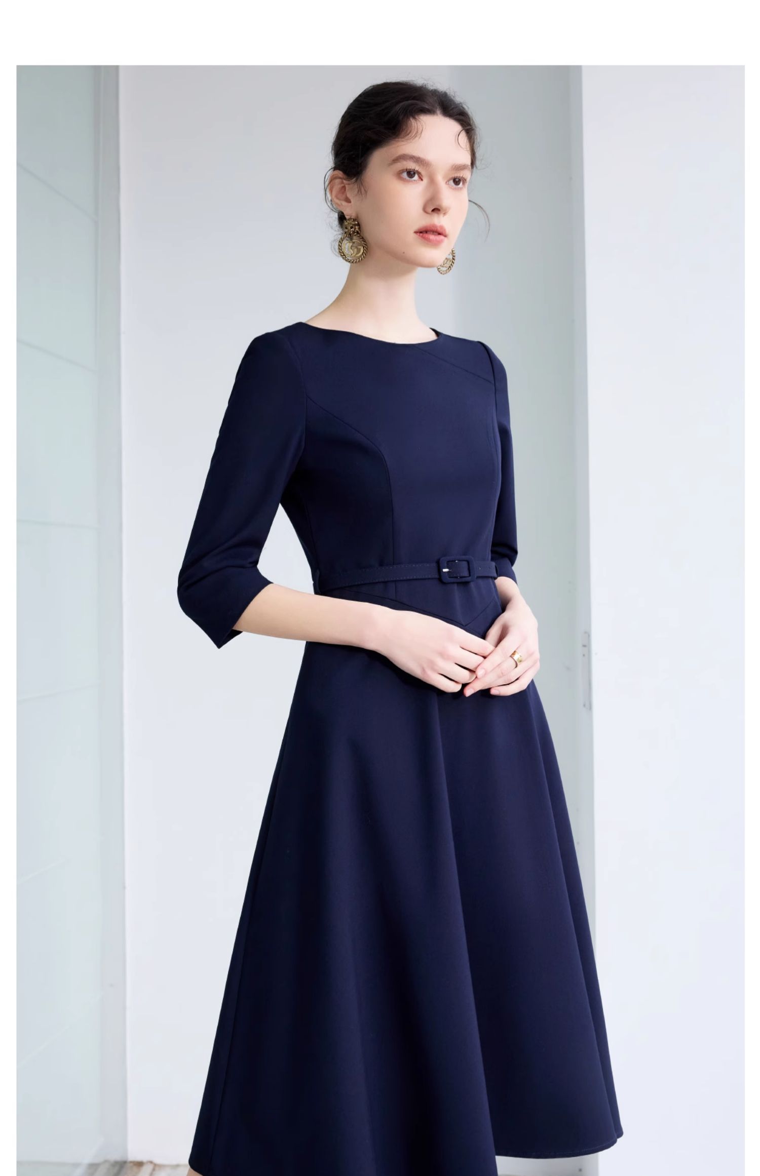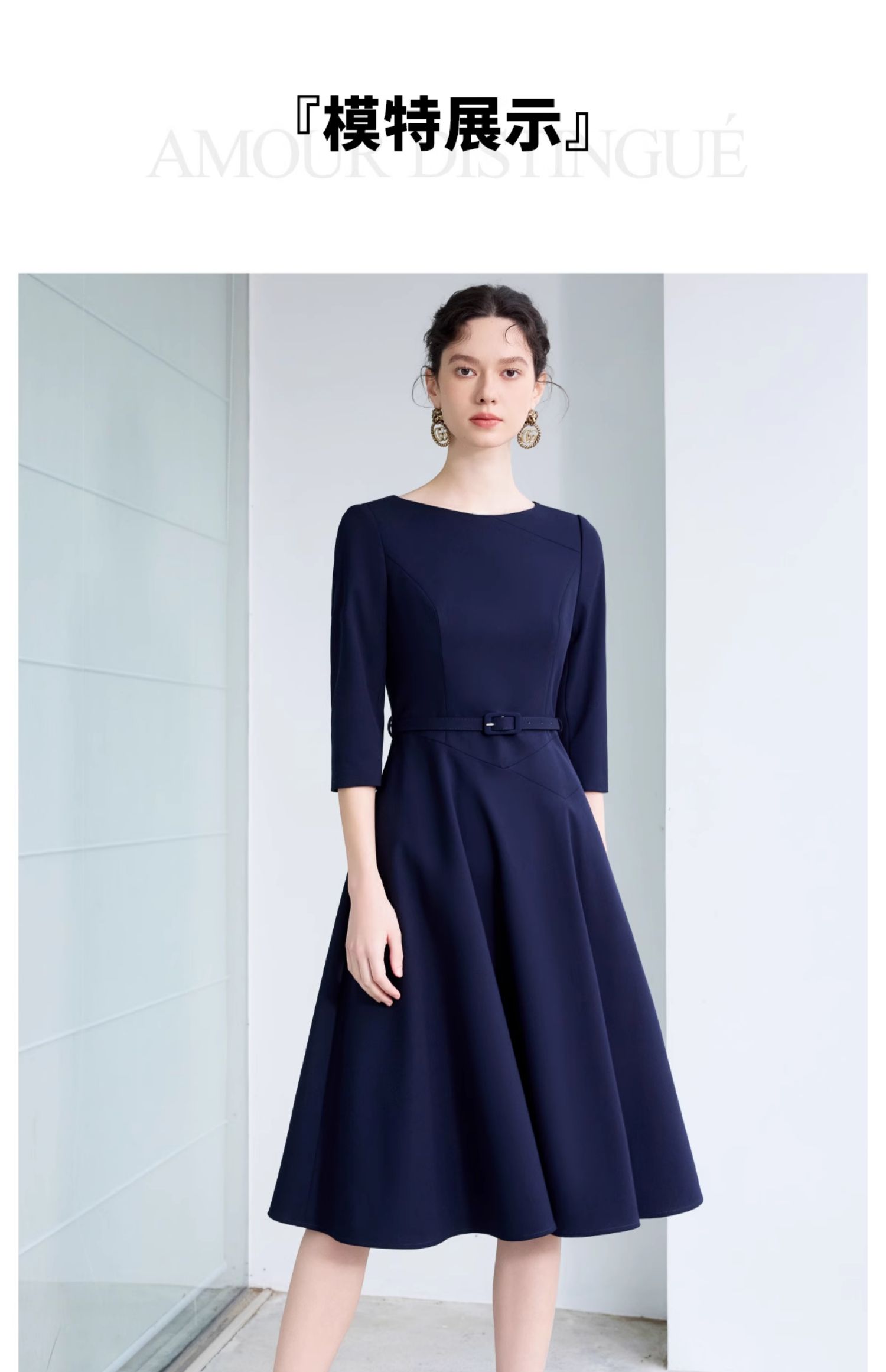 IWY/大方得体连衣裙新款今年流行爆款藏青色法式圆领中长款伞裙Q1265