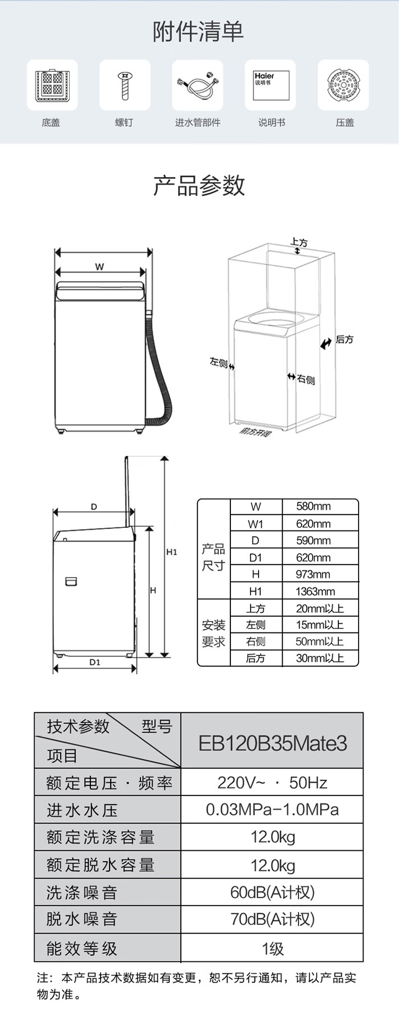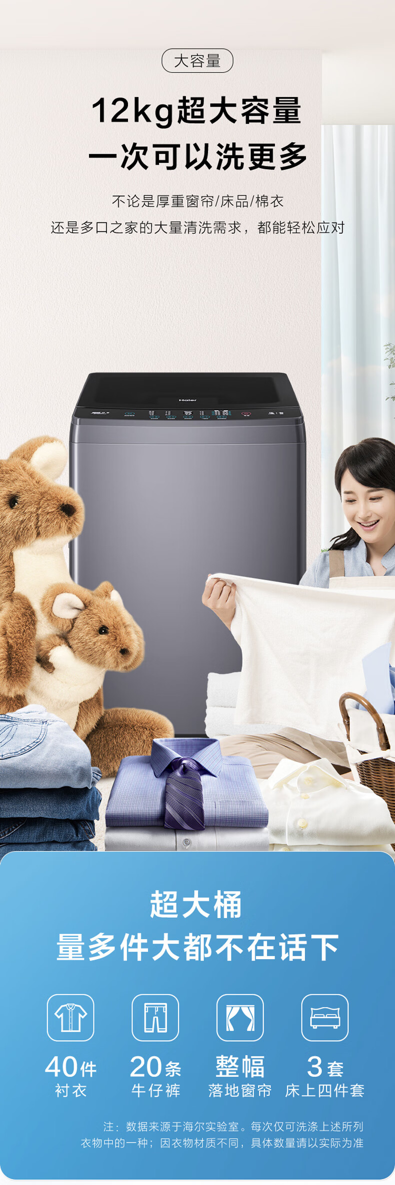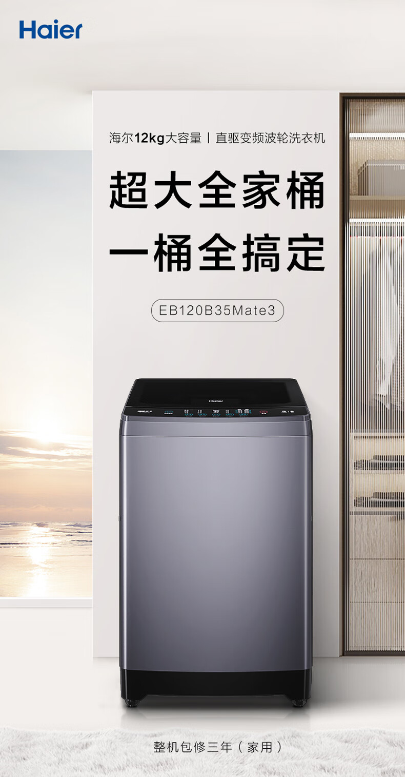 海尔(Haier)波轮洗衣机全自动家用家电 内衣除菌 直驱漩瀑洗 12公斤大容量 EB120B35Mate3