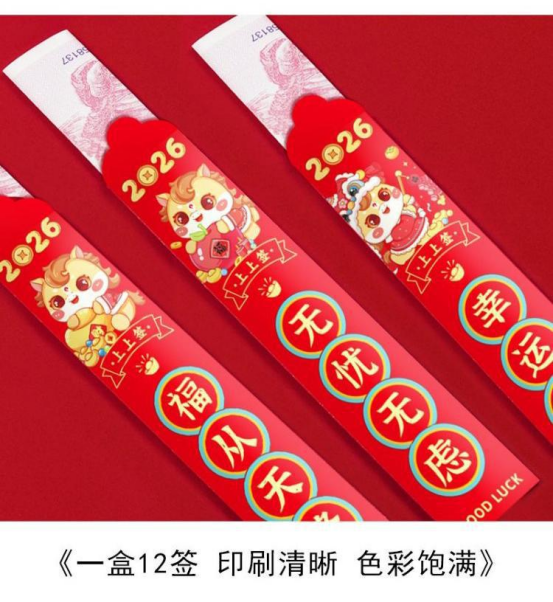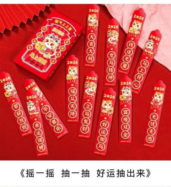 新年聚会怎么少得了氛围神器! 这波抽签道具直接把年味拉满 ——红火火的包装印着财神、瑞狮, 签语藏着“马上开心”“平安喜乐”的好彩头。 伸手一抽,笑声跟着来,轻松让聚会热热闹闹, 氛围感直接嗨翻全场!