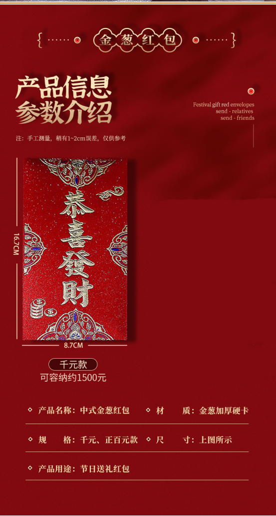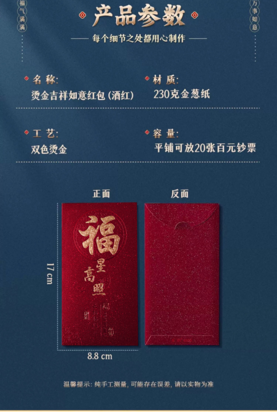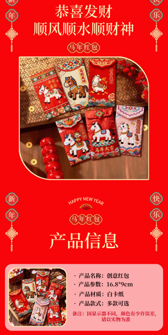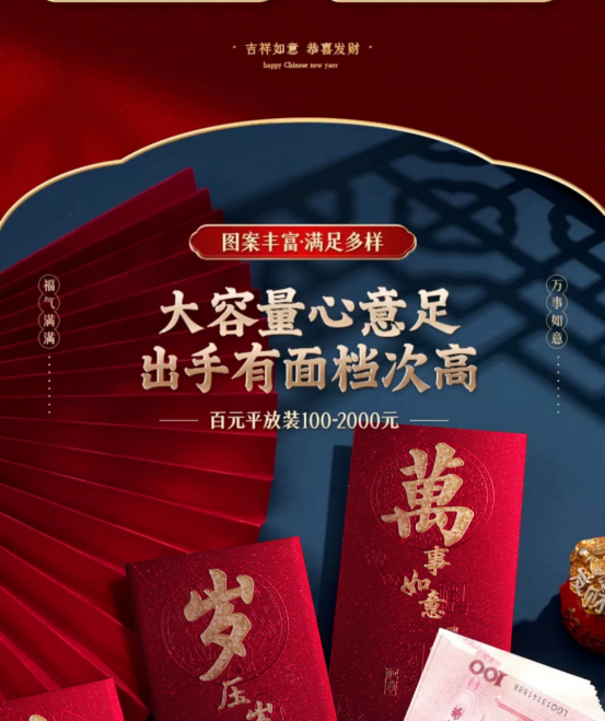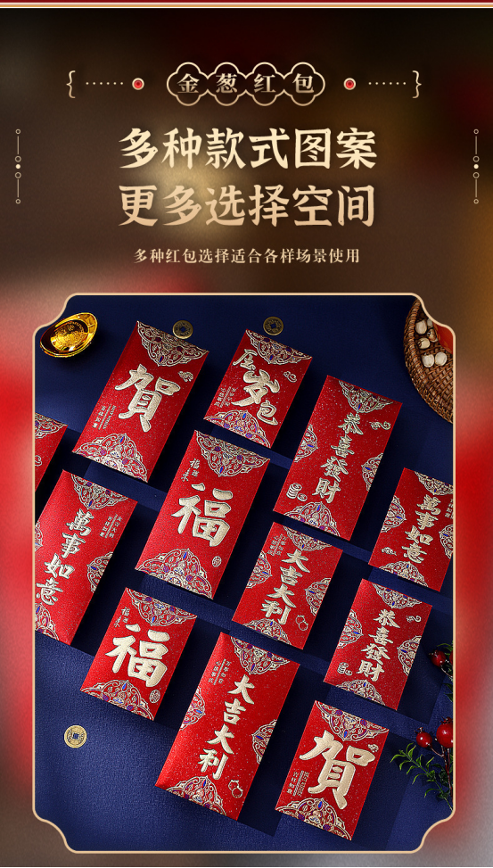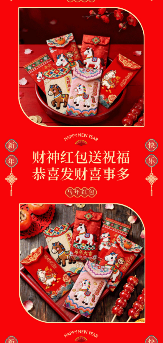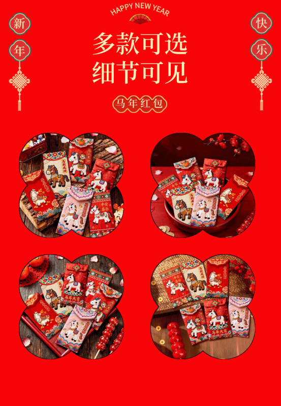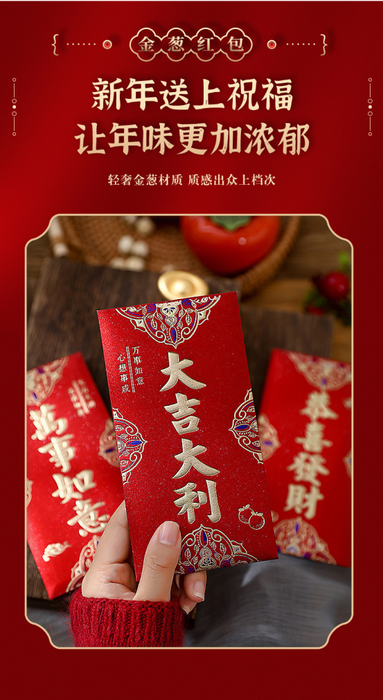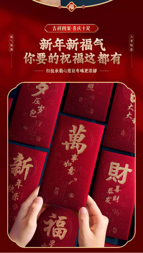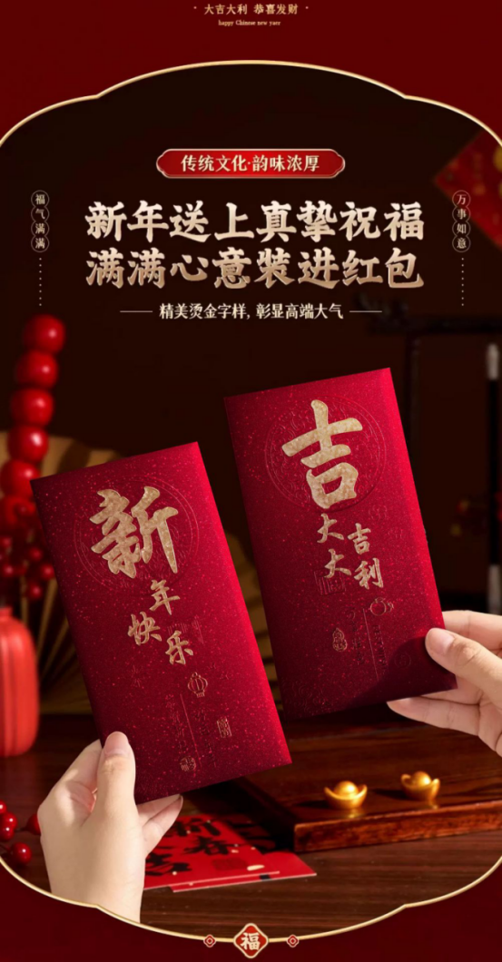 年关将至,按照我国的传统习俗 家家户户都要准备喜庆的🧧红包以示辞旧迎新 期冀度过和和睦睦的新年,迎来甜甜美美的🧨新春佳节 新年购置红包必不可少🥰寓意喜庆团圆幸福美满、万象更新、财源滚滚、春风满面、辞旧迎新~️