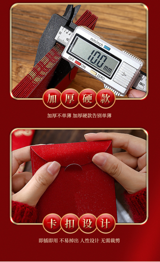 ✅厚实耐用,纸张厚实挺括,不易破损,颜色是正红色不发暗,装现金也不会透底。 大小适中,不管是百元大钞还是零钱,都能轻松容纳,颜值和实用性狠狠拿捏~
