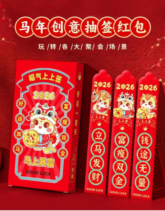 ④ 创意趣味加厚抽签聚会红包 —— 12个/组*3 袋 到手36个 马年抽签红包 过年仪式感满满 今年春节这样发红包,也太有意思了吧! 抽签红包,过年红包这样玩,超有趣! 伸手一抽,笑声跟着来,轻松让聚会热热闹闹,氛围感直接嗨翻全场! ✅ 过年仪式感满满!马年抽签盲盒直接把年味拉满 ✅红签裹着“福至财来”“好运常在”的吉语,财神印花衬得年味更浓 ✅所求皆如愿的欢喜直接漫开...❤️