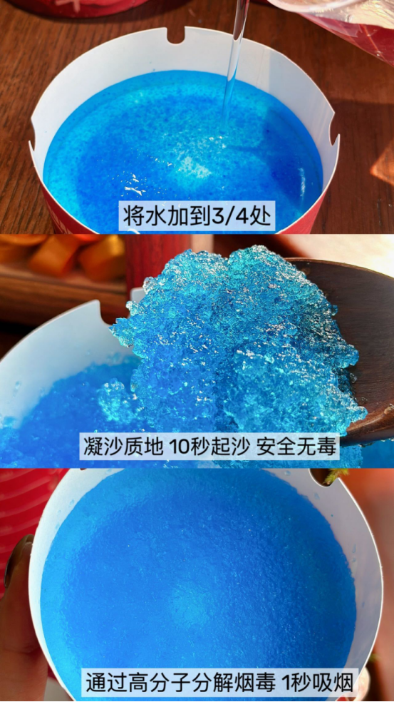 使用起来特别简单! 凝胶质地!安全无毒! 遇水就会膨胀起来,安全成分 对人体无害,能够高效吸附烟灰 净化空气!家里无论有没有吸烟者,大家都应该囤一波!! 万一家里来客人了也能用得上!!