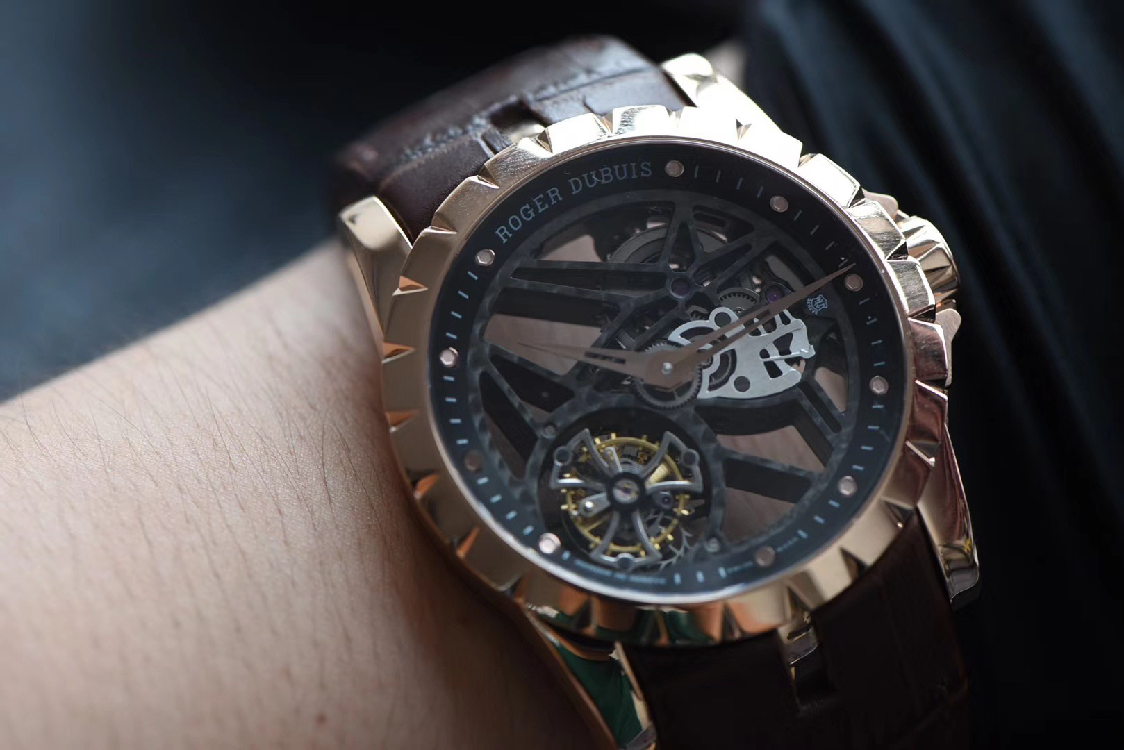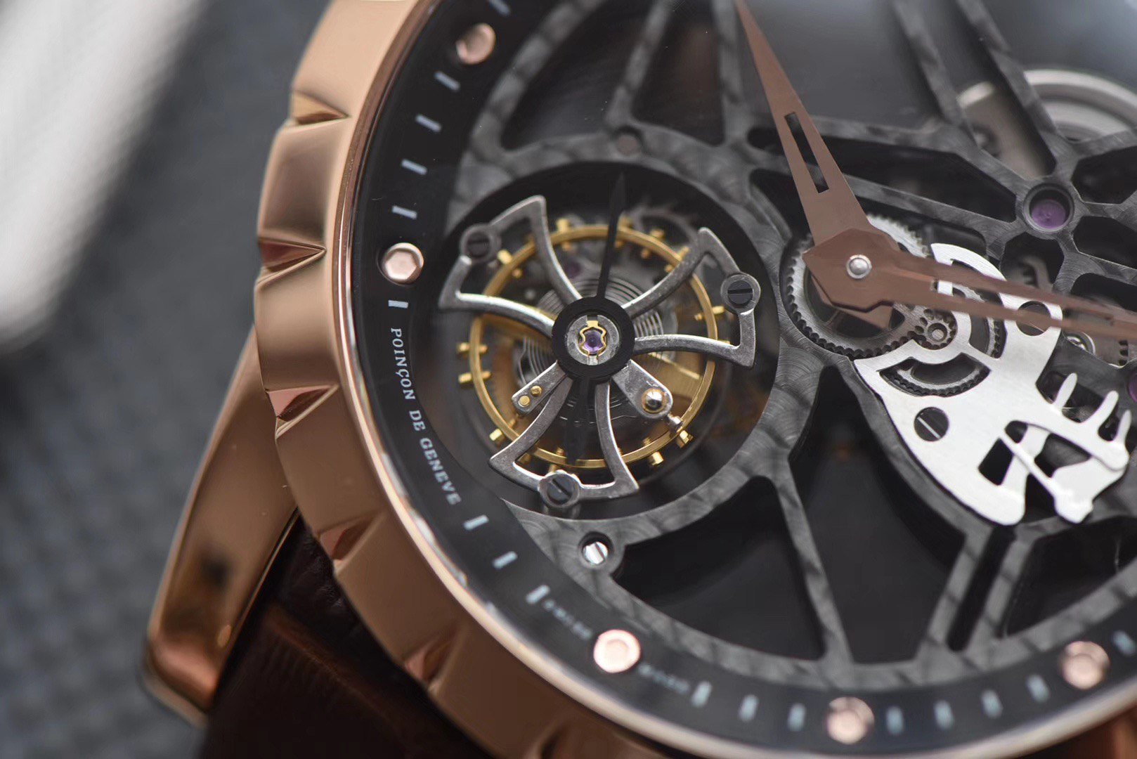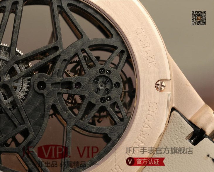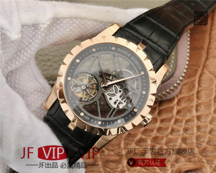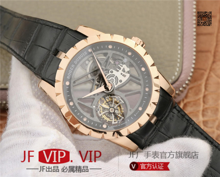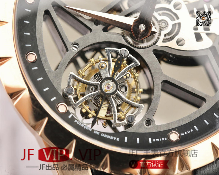 JB罗杰杜彼王者系列玫瑰金壳RDDBEX0392(白壳RDDBEX0393),真的镂空陀飞轮腕表。
