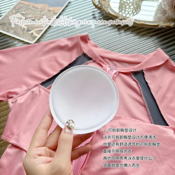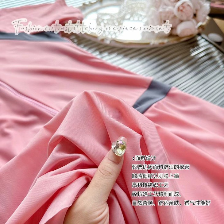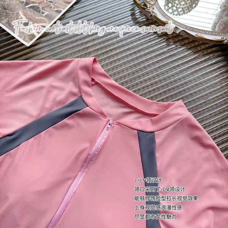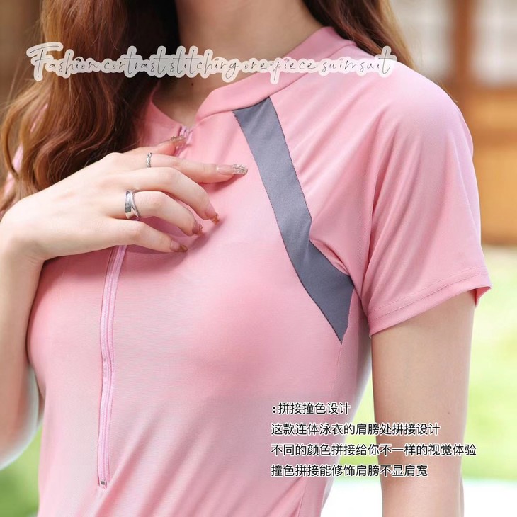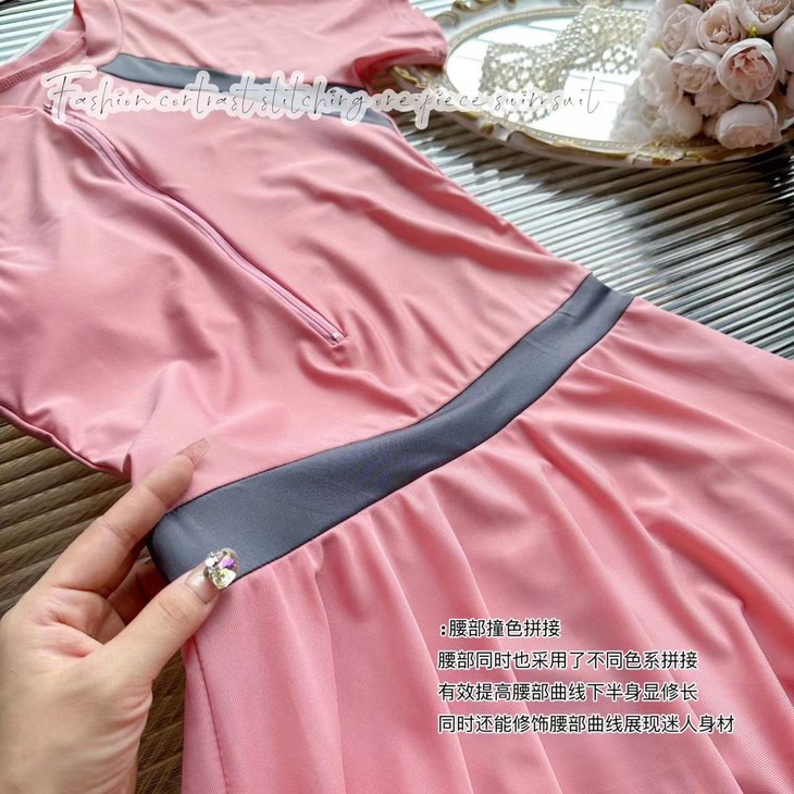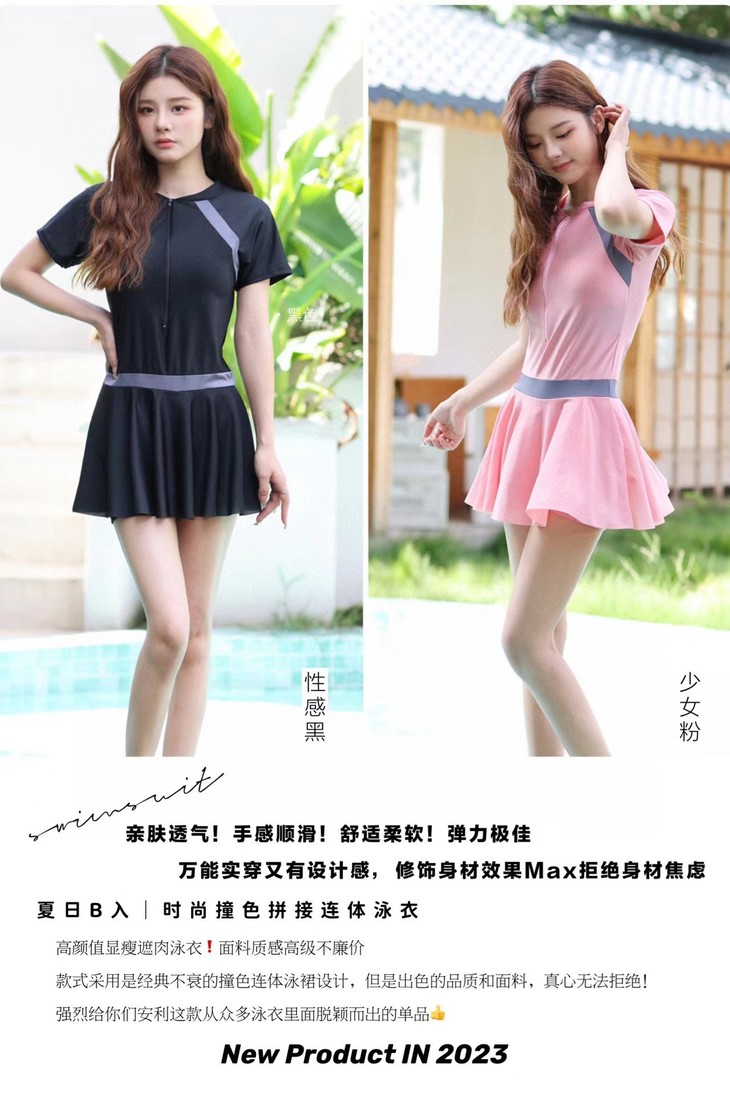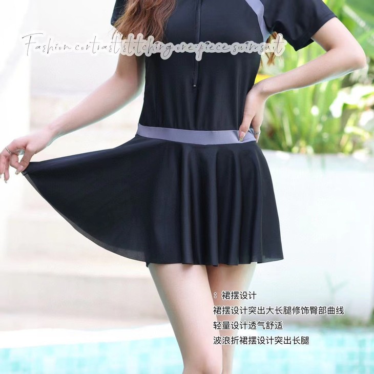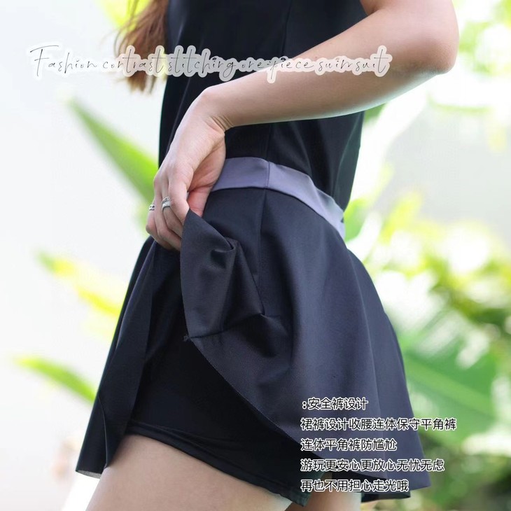 【撞色拼接连体泳衣女】 遮肚时尚显瘦保守修身裙式游泳户外防晒泳装