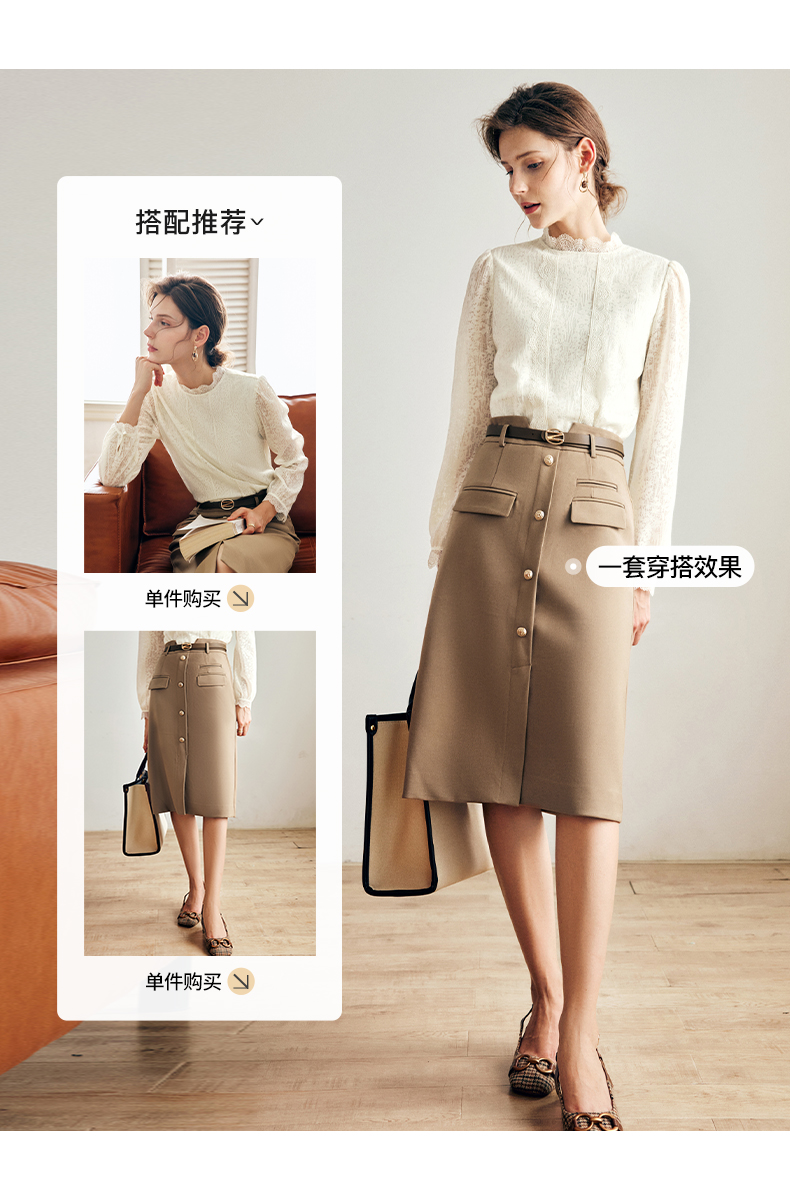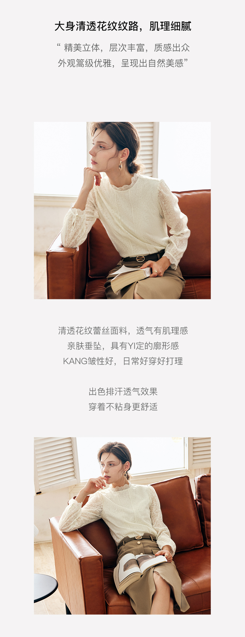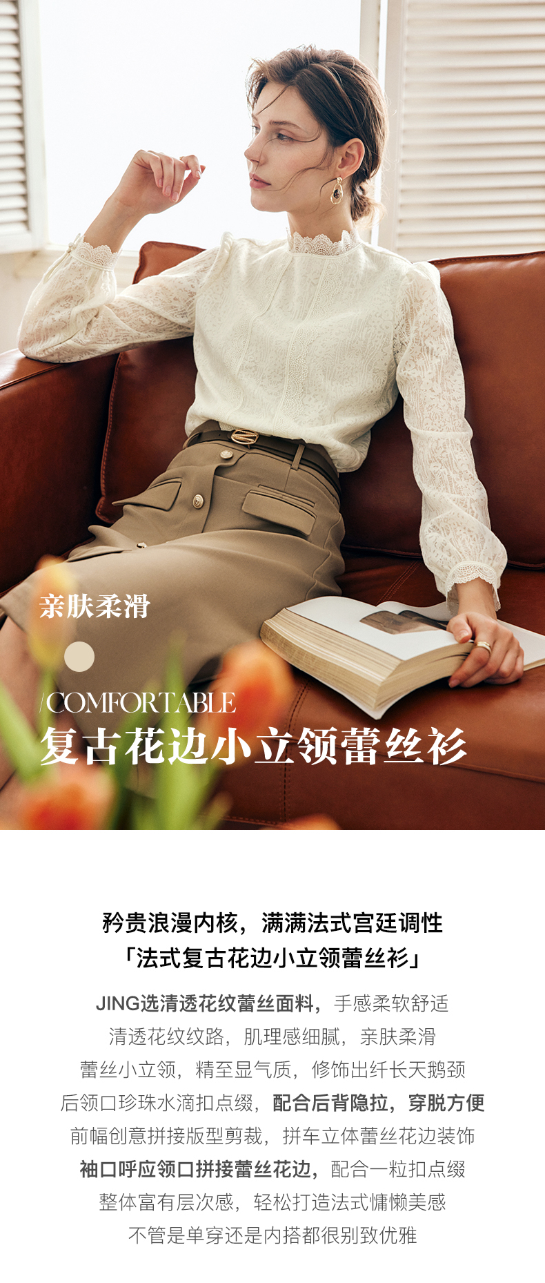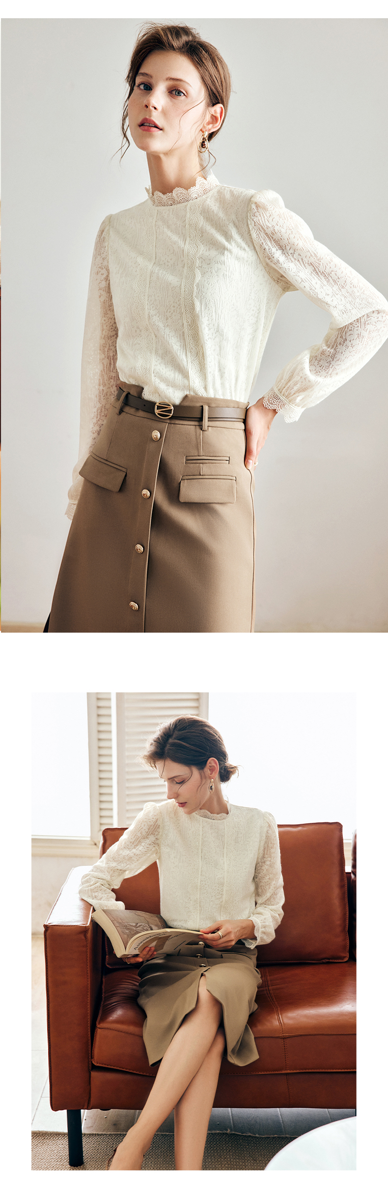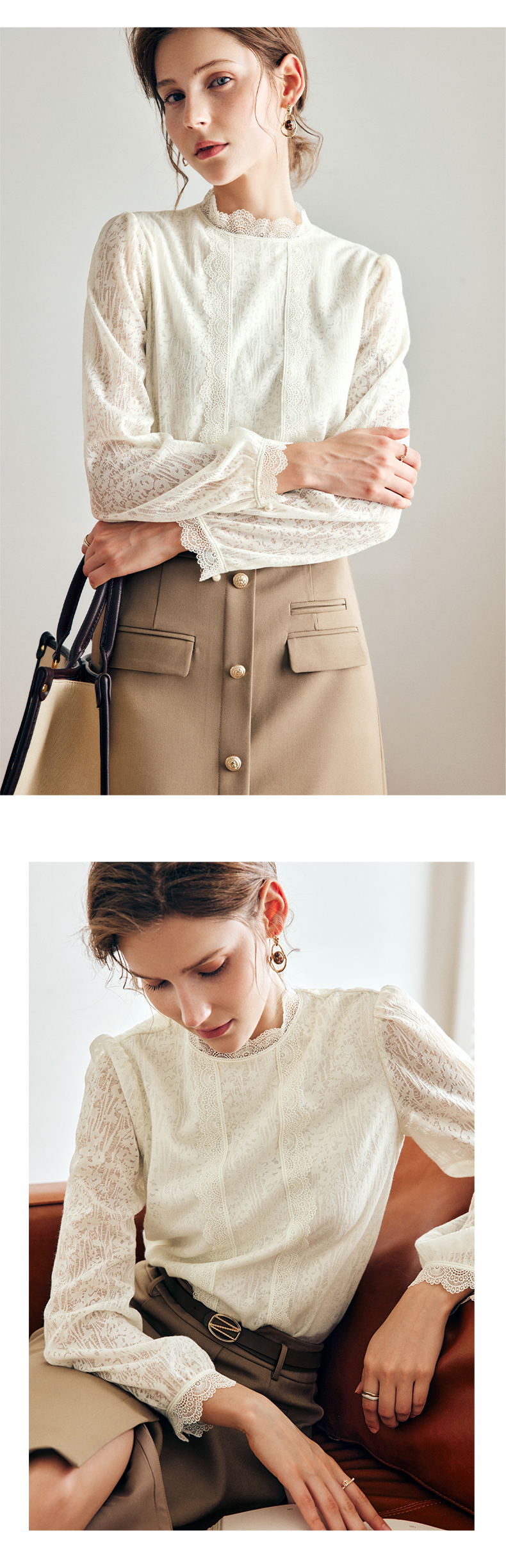 OLrain法式米杏色雪纺蕾丝衫女早秋2022年新款淑女花边小立领上衣