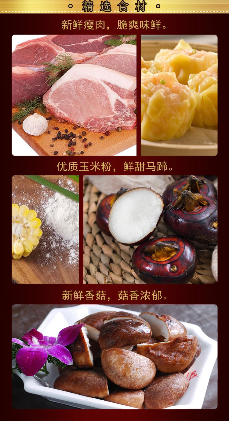 精选面粉、新鲜瘦肉、马蹄、香菇等,科学配比,传统工艺制作;