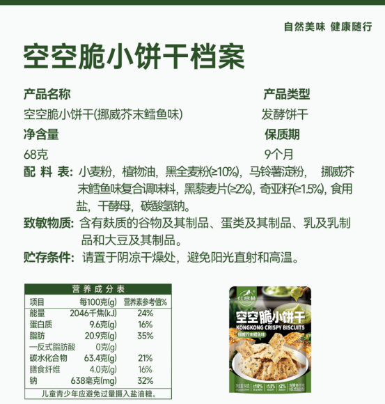 【红谷林· 空空脆小饼干双口味(安格斯照烧牛肉味/挪威芥末鳕鱼味】 24H恒温慢发酵+进口挪威芥末鳕鱼粉🧀咔嚓酥脆越吃越上头~ 双风味👉安格斯照烧牛肉浓郁💕挪威芥末鳕鱼鲜辣交织😍咸香奶韵层层叠❗️ 🍪24小时恒温慢发酵:恒温发酵锁住麦香 🍪黑全麦粉添加量≥10%,添加黑藜麦片和奇亚籽,含膳食纤维,饱腹感强 🍪没有添加蔗糖+配料干净没有乱七八糟的添加 🍪密封口包装新鲜解锁随时炫,双口味酥脆又解馋