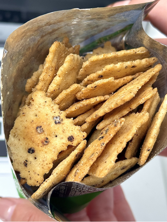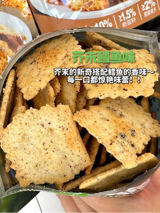 芥末味超级超级推荐~~我们办公室坠爱的口味! 松脆的口感融合香香的谷物~ 一口下去芥末鳕鱼味的,还真挺上头! 不辛辣,不刺鼻!芥末的口感刚刚好真的给我香迷糊了!! 越嚼越香!越吃越上头!!!太太太满足了!! - 整个饼干轻薄酥脆,添加了黑藜麦片和奇亚籽,谷物+苏打饼干的融合 就是一直吃都不会腻,完全不会踩雷,大家放心冲! 配料表也超级超级干净 ~ 家里有小朋友,孕妈妈的也可以放心吃哦