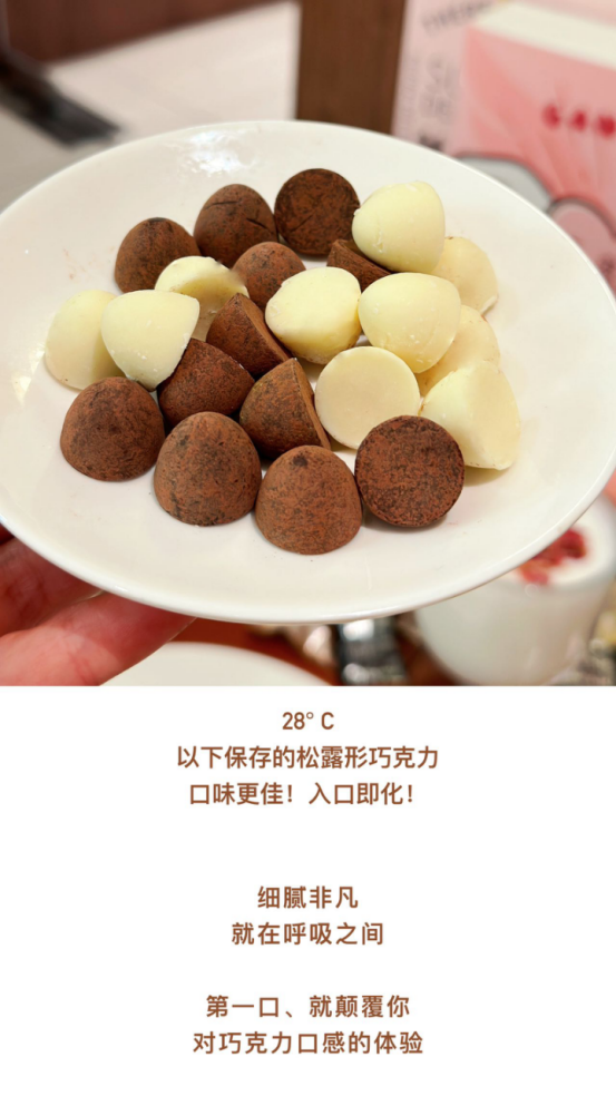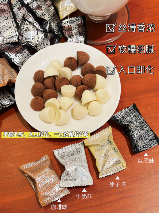 很多人都无法抗拒甜食,因为它能让人心情瞬间被治愈 尤其是巧克力,香甜浓郁,一口直击灵魂 ✅打开就是浓郁的巧克力香气,外面裹了一抹可可粉 ✅28℃超低熔点的独特性,更造就了它入口即化的口感 ✅一颗入口,绵密细腻的巧克力在舌尖融化,满满的幸福感,从舌尖流淌至心底