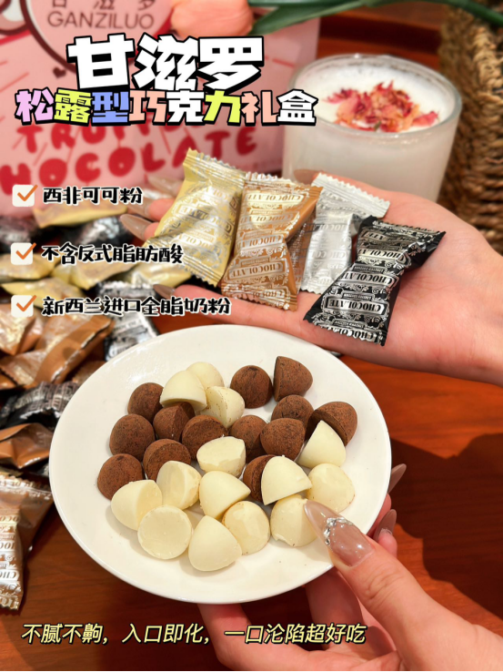✅采用先进控温工艺 精准把控巧克力融点在 25 - 28℃,确保入口即化 巧克力表面还有一层可可粉 入口非常饱满有层次感 再加上选取纯天然原料 整体口感细腻香醇、香浓丝滑 新的一年,快来试试甘滋罗·松露型巧克力礼盒 让甜蜜和好运常伴你左右