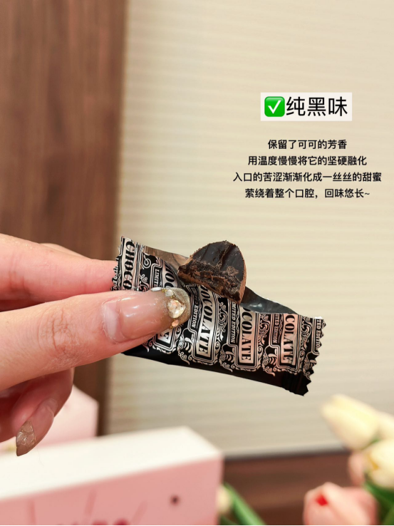 ✅纯黑味 保留了可可的芳香,用温度慢慢将它的坚硬融化 入口的苦涩渐渐化成一丝丝的甜蜜萦绕着整个口腔,回味悠长~