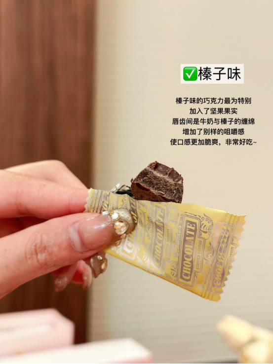✅榛子味 榛子味的巧克力最为特别,加入了坚果果实 唇齿间是牛奶与榛子的缠绵 增加了别样的咀嚼感,使口感更加脆爽,非常好吃