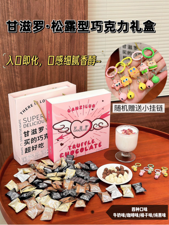 “你无法拒绝巧克力 就像你无法拒绝爱情。” 入口即化,吃起来好满足~ 开启2025年,从甘滋罗·松露型巧克力礼盒开始吧 毫无疑问今年情人节必拿c位 现在下单就随机赠送可爱的情侣小挂件哦