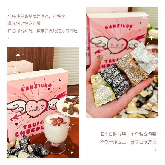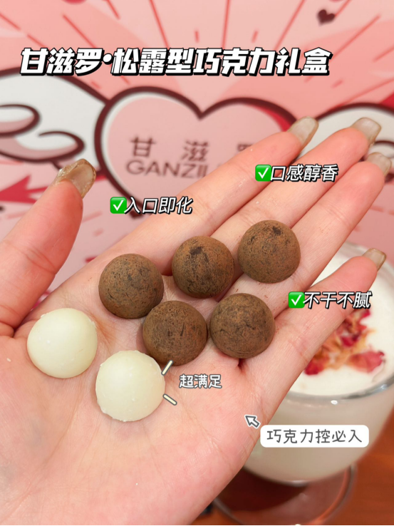 每个人都有自己喜欢巧克力的理由 当巧克力在你的口中融化的时候 美妙幸福的滋味就延展而来 巧克力融合了香~甜~苦~浓郁的口感 使每一位享用者能够在不同的时期 体验到独特的感受 甘滋罗·松露型巧克力礼盒,香甜浓郁,一口直击灵魂!