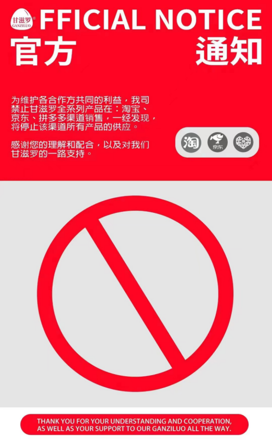 为维护各合作方共同的利益,我司禁止甘滋罗全系列产品在:淘宝、京东、拼多多渠道销售,一经发现,将停止该渠道所有产品的供应。 感谢您的理解和配合,以及对我们甘滋罗的一路支持!