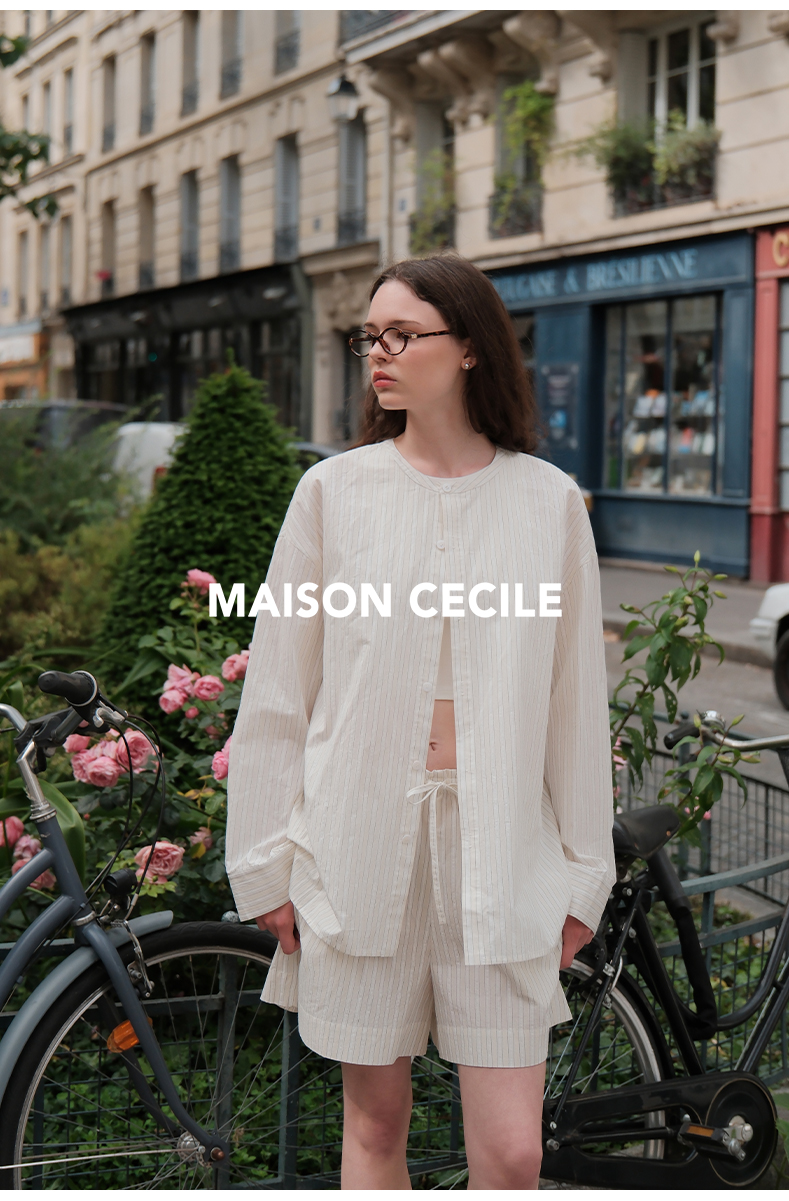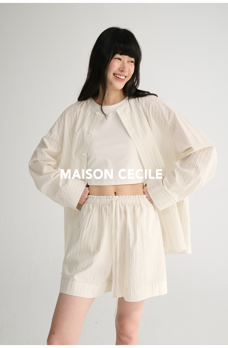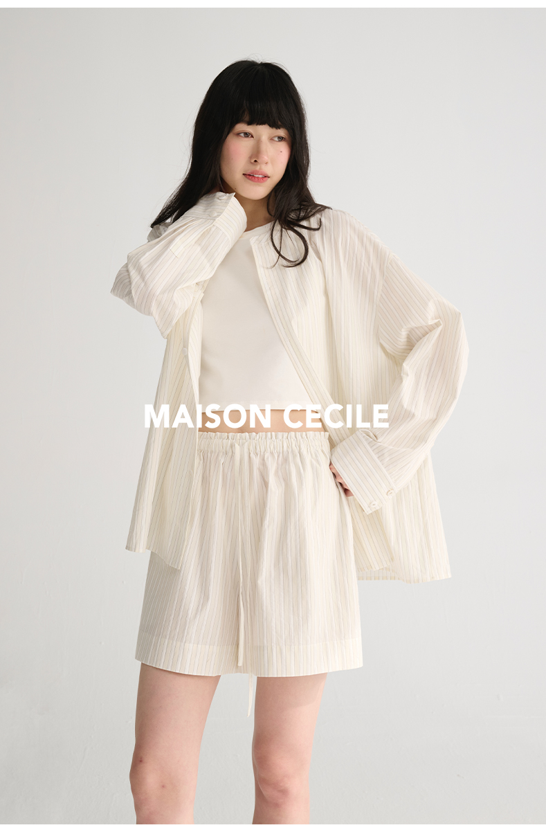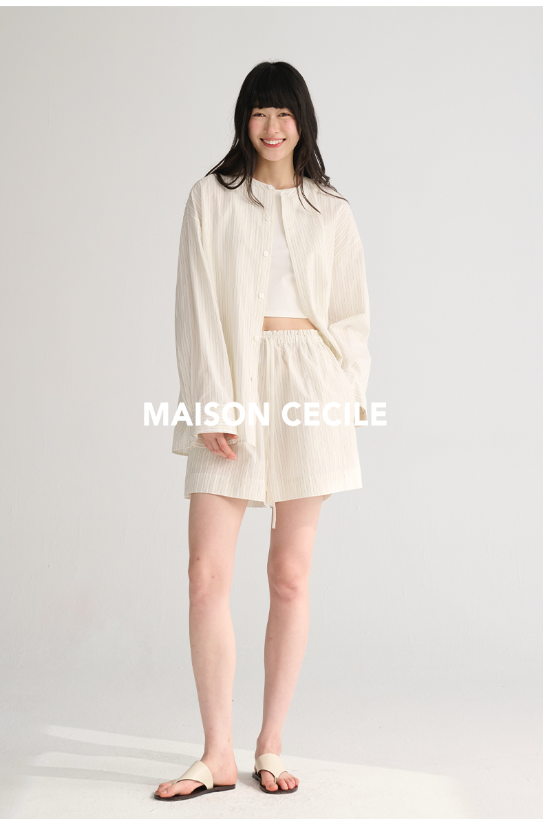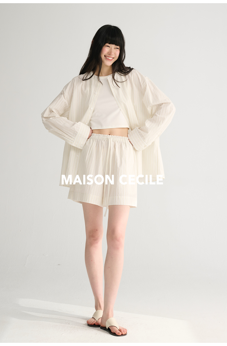 MAISON CECILE 松弛立体条纹肌理感圆领廓形衬衫/松紧腰短裤/长裤