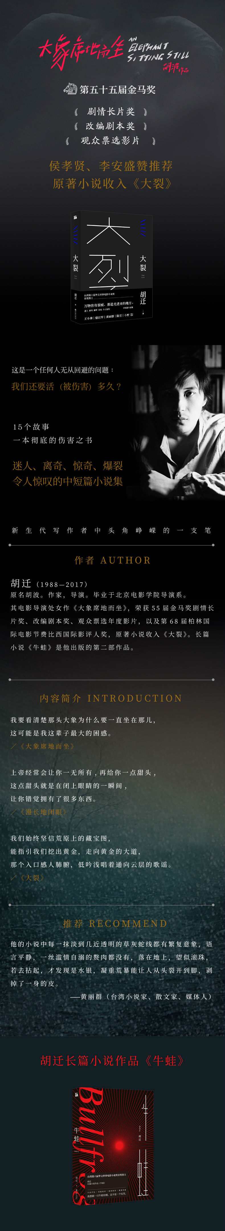 毕业于北京电影学院导演系。其电影导演处女作《大象席地而坐》,荣获第55届金马奖剧情长片奖、改编剧本奖、观众票选影片奖,以及第68届柏林电影节费比西国际影评人奖,原著小说收入《大裂》。长篇小说《牛蛙》是他出版的第二部作品。