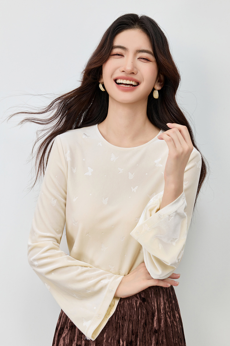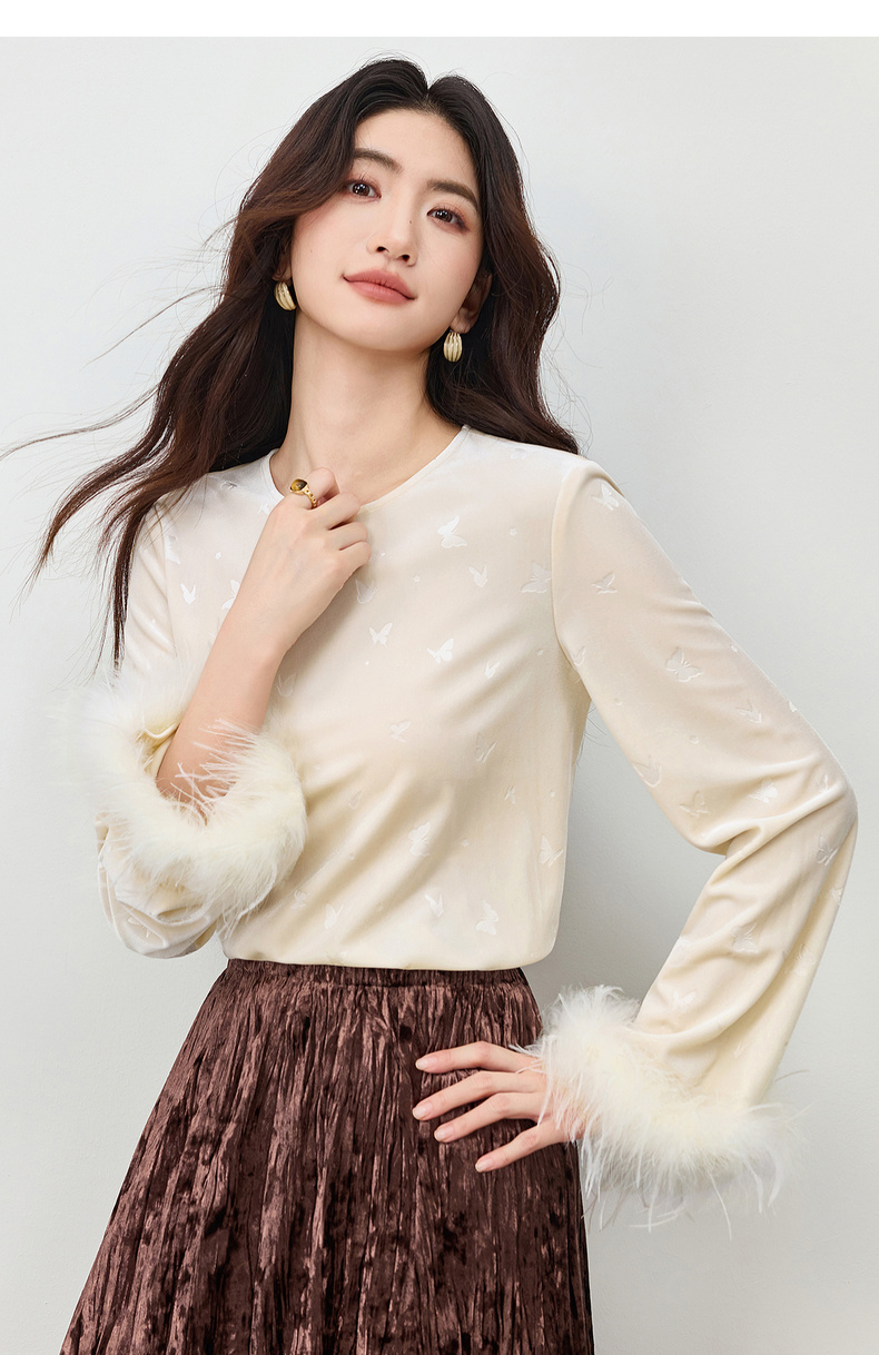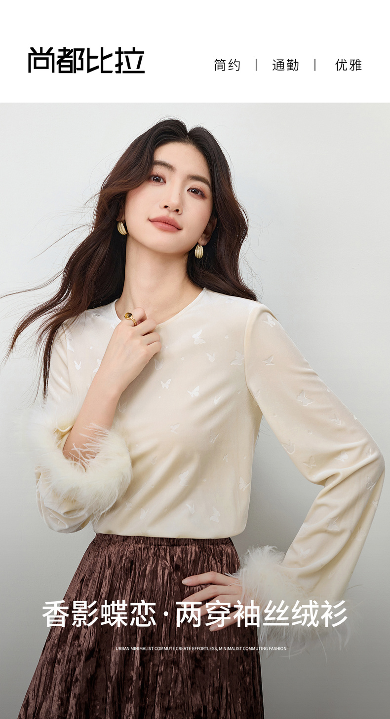 【内购】【两穿造型】可拆卸毛绒边喇叭袖蝴蝶肌理弹力丝绒外穿内搭打底衫-154SF3889