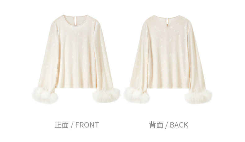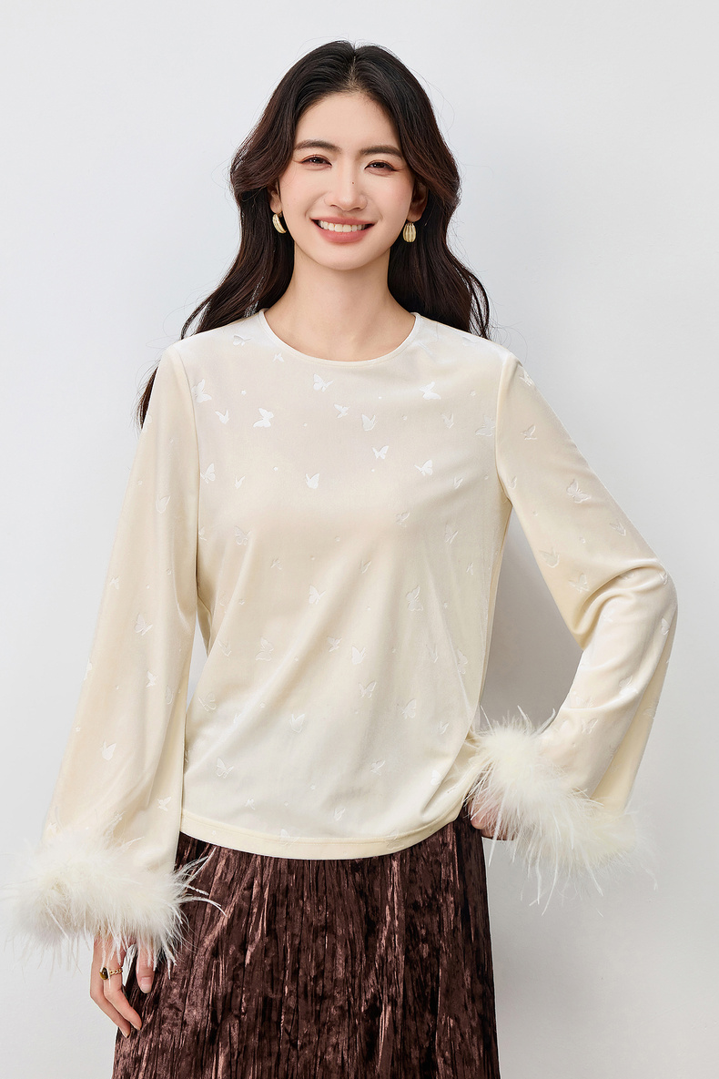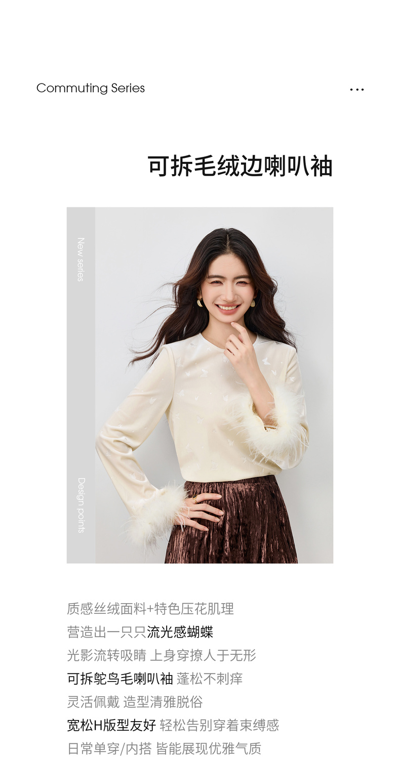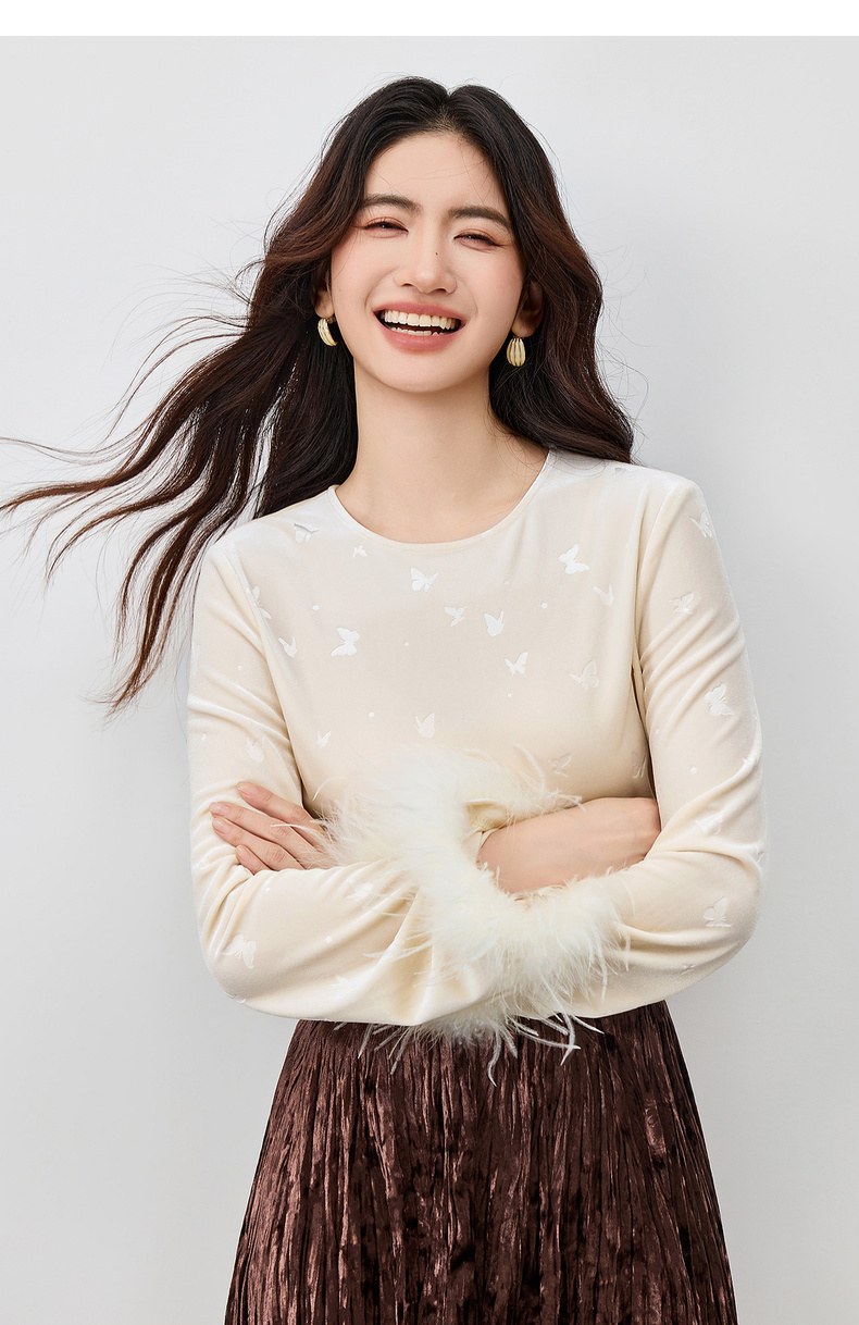 【内购】【两穿造型】可拆卸毛绒边喇叭袖蝴蝶肌理弹力丝绒外穿内搭打底衫-154SF3889