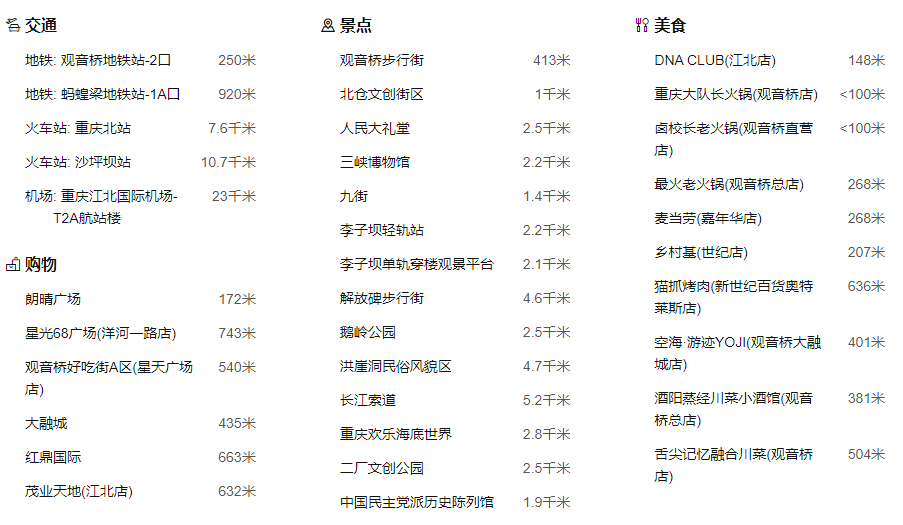 地处观音桥商圈,紧邻地铁 3 号线 2 号出口和 9 号线 7 号出口,步行 5 分钟即可到达,出行便捷。