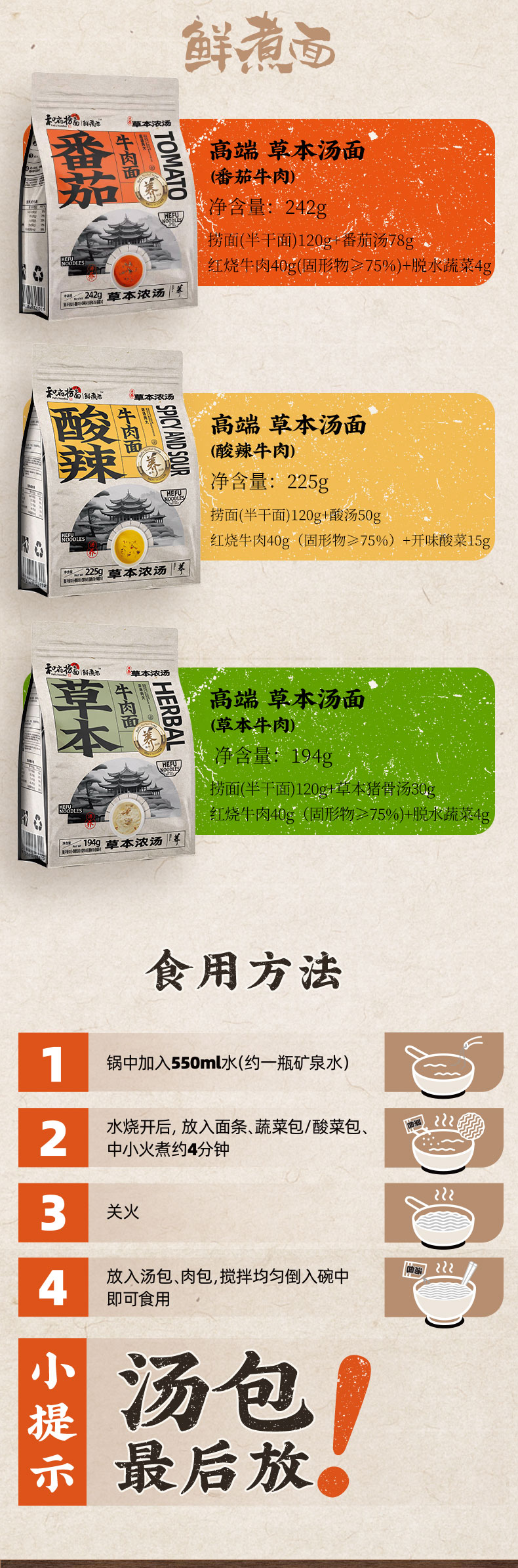 【门店同款】和府捞面 鲜煮面 番茄牛肉/草本牛肉/酸辣牛肉