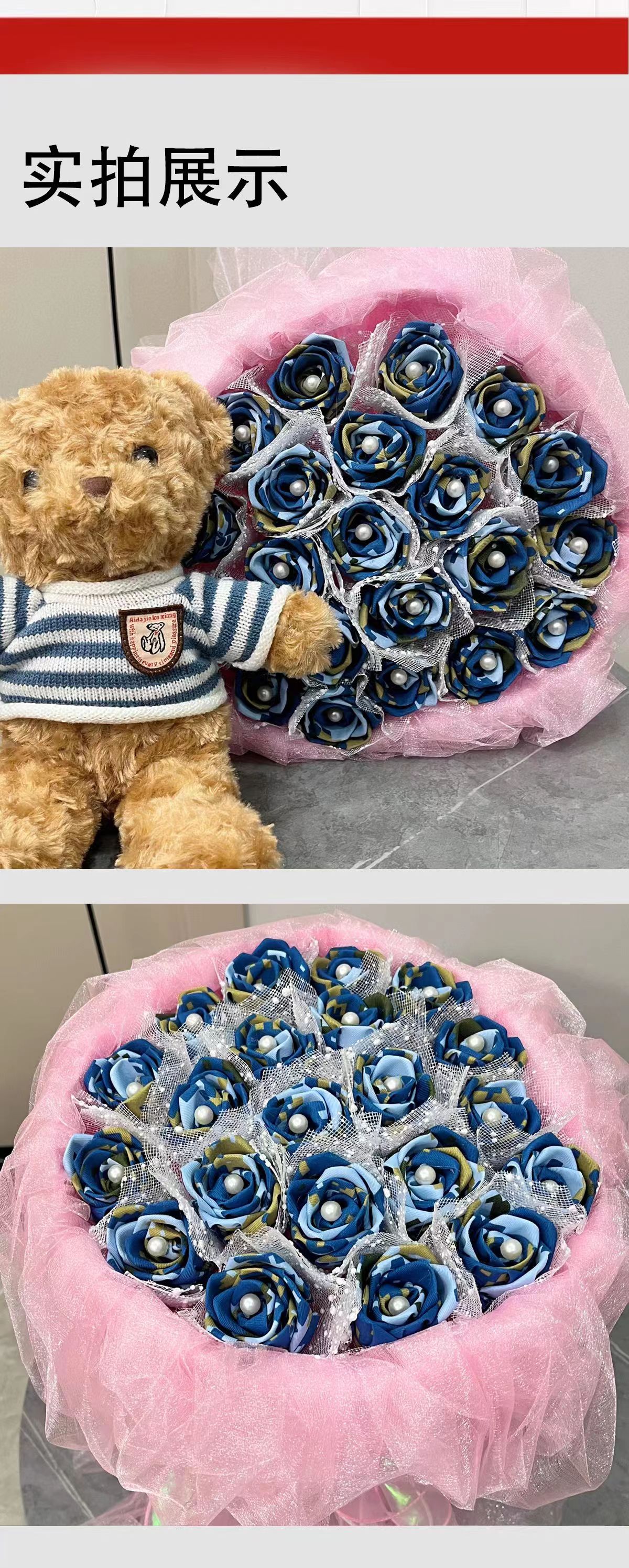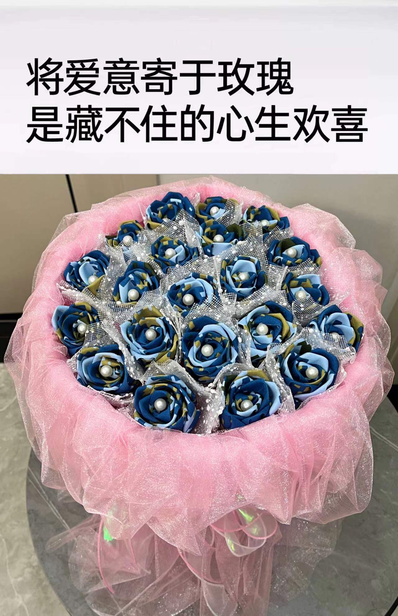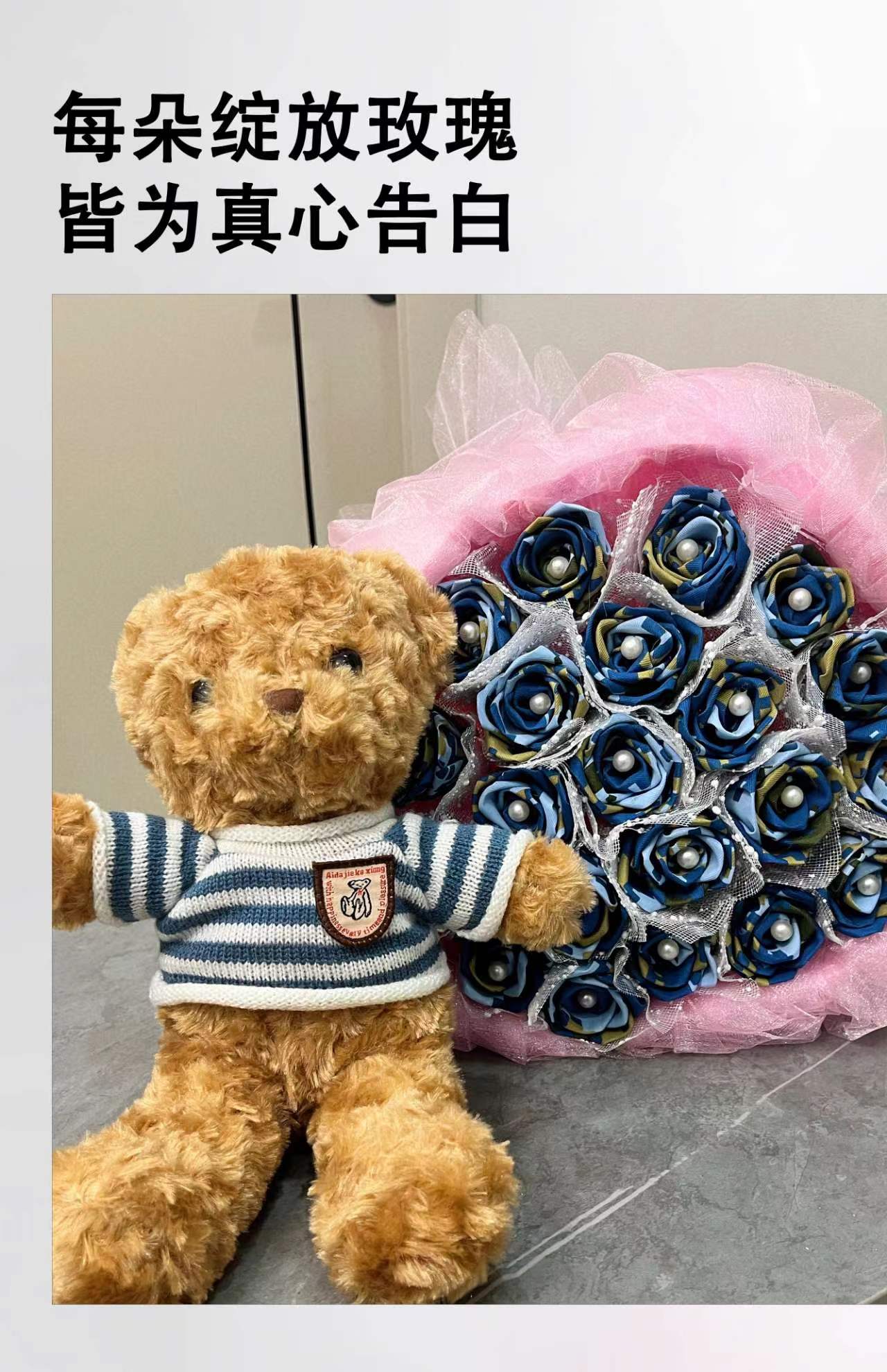 《戎花》立体布艺蓝色玫瑰花束 欧根纱装饰包装搭配可爱熊 懂你的可可爱爱 做你的欢欢喜喜