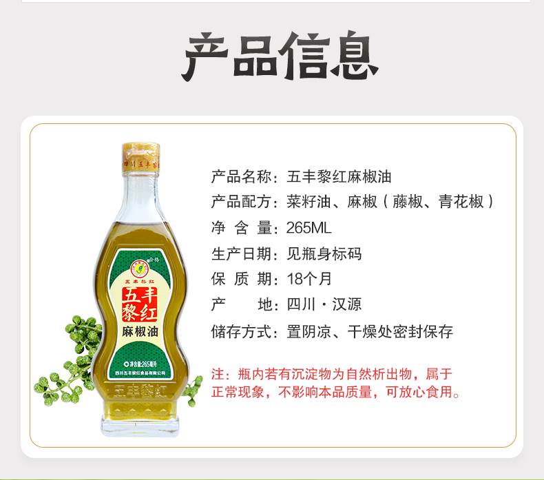 五丰黎红四川正宗麻椒油特麻特香265ml花椒油藤椒油家用小瓶麻油LY