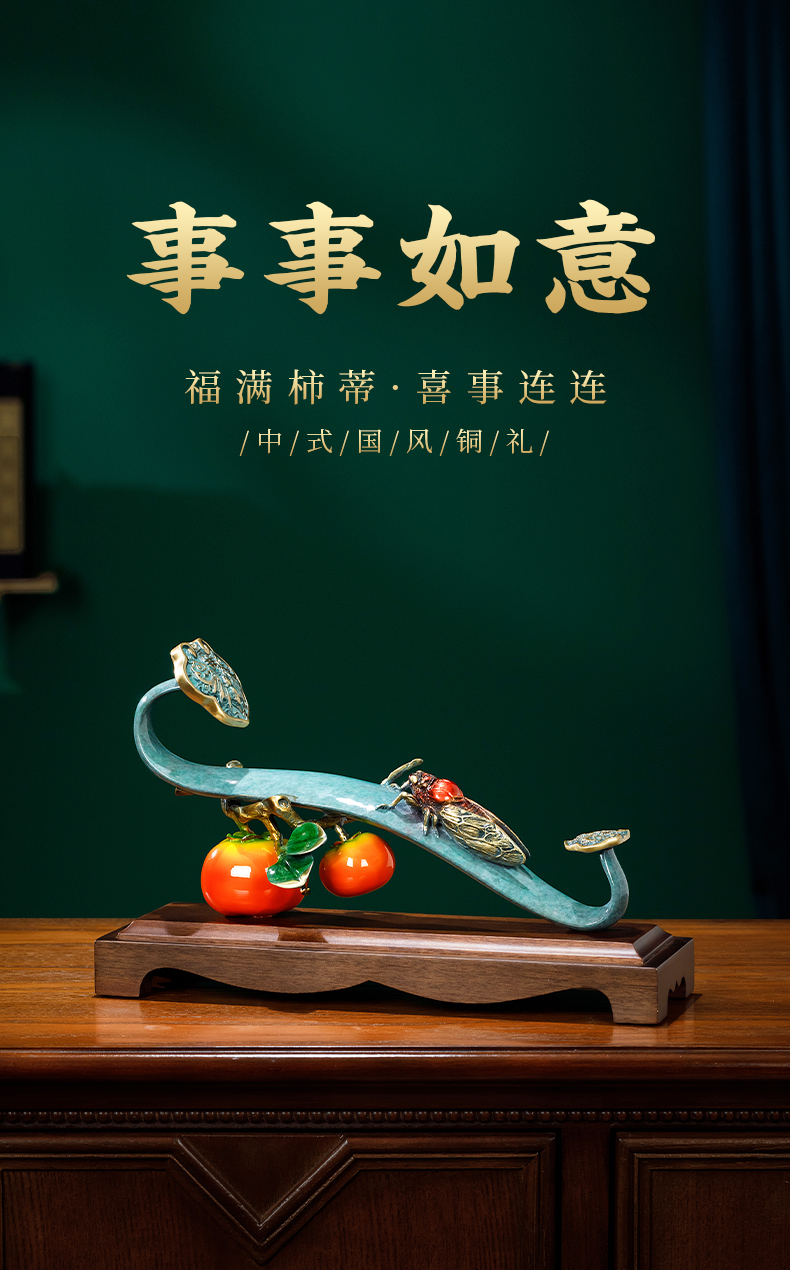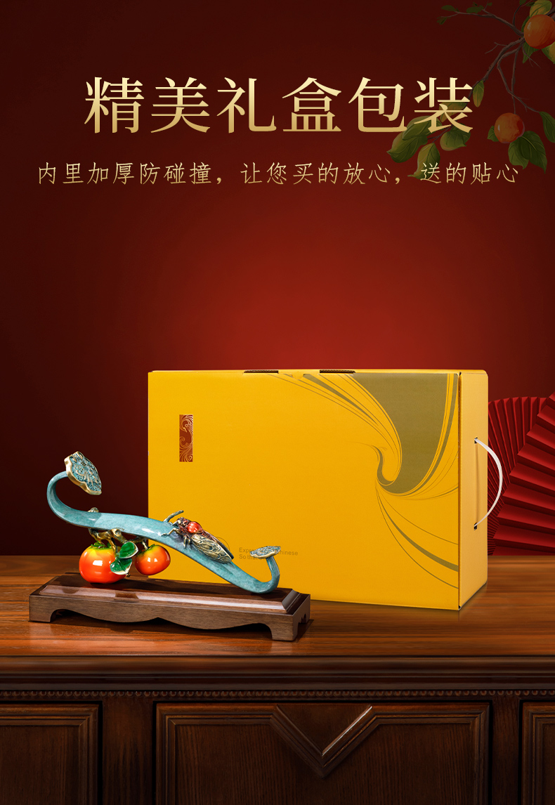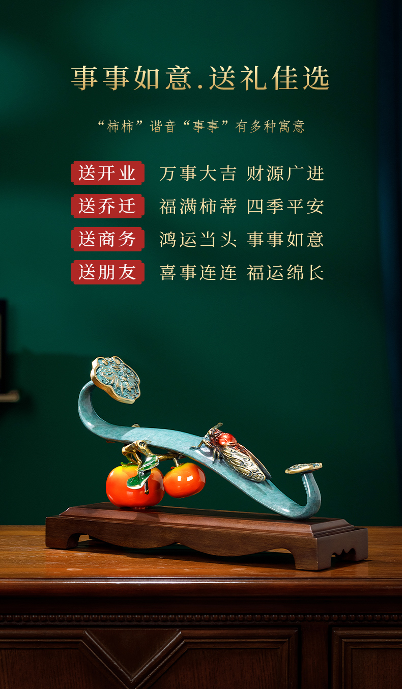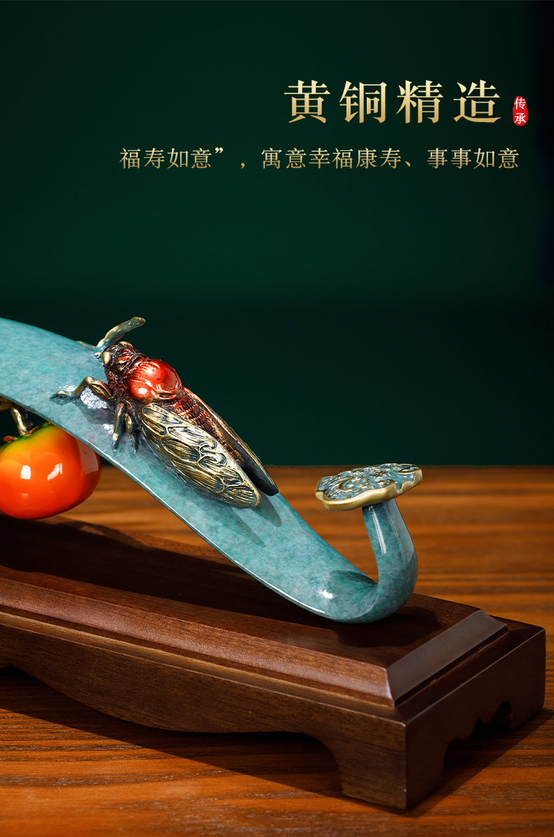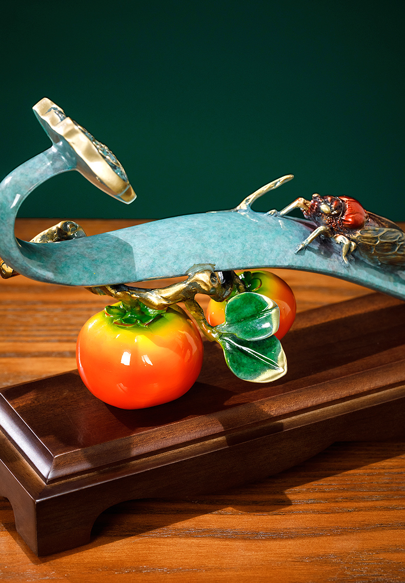 E-QK-BJ1362 金柿蝉联 彩铜+胡桃木底座 320*100*190