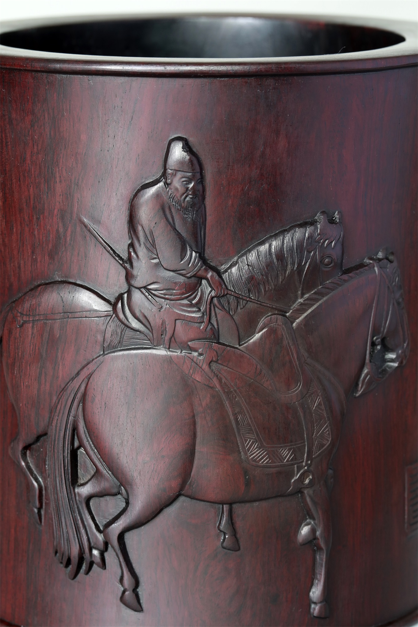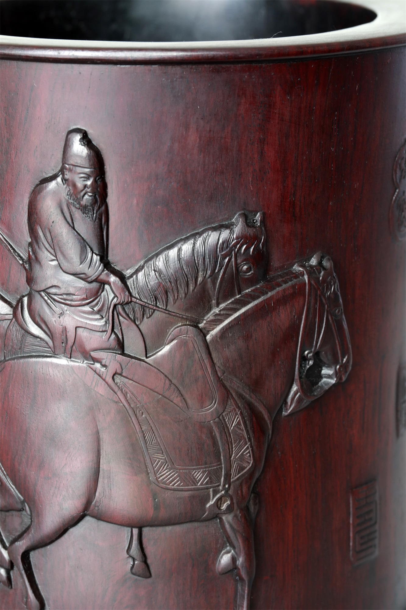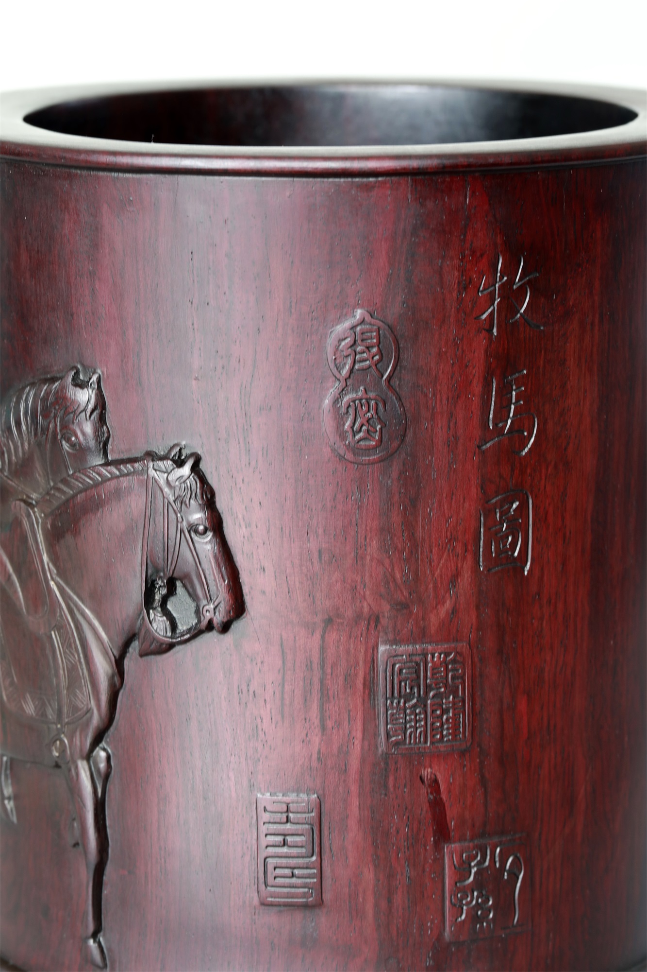 作品以唐代画家韩斡《牧马图》作雕刻主题。唐代以来,“鞍马”画独立成一画科,其中影响最深广,被称之“独步古今”的,就是唐代画家韩斡。作品画面中雕刻的前后两匹马。原画中前面的是黑马,浑身漆黑,唯鼻子及脚踝微有白毛。背置朱底花纹锦鞍,颈下垂一红缨球。后面的白马只露出部分身体,背上坐一奚官,头戴巾,虬髯络腮,右手执缰,腰插马鞭,两眼远望,炯炯有神,似正在放牧中。作品雕刻精湛,勾线精致,尤其是奚官的衣衫摺纹,简括而流畅,整幅画十分简练,给人一种非常优雅的享受。