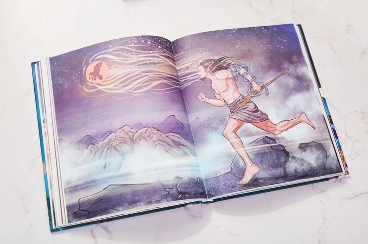且看目录页,每位天神、异人、神兽,都会用一个引发好奇心的关键短句,去概括其特点。手臂当渔网、反转着脚的人、无头战神、带来好运的神……反差感、悲壮感,每一个都像是游戏中的新英雄,激起孩子好奇,让他先选定感兴趣的往下读。进入故事页后,会发现它的板块设计,模仿游戏页面,直戳孩子的心呀!讲述每个天神前,都会有一个诸神等级排位,就像他们平时玩的排位等级一样,既让孩子有个总体印象,又瞬间带给他们亲切感,让他们愿意往下学。正文并非直接以文言文入手的,而是根据原文短短一句,编写成脑洞大开的小故事。读完故事,再读原文,更加简单明了,还能潜移默化地培养孩子学习文言文的方式——通过扩展语句、打开想象空间、构造讲故事能力来学习。九尾狐的狡诈、蛊惑神态,在童话语言的描述中栩栩生动;小鸟为什么且如何解救年轻人,简简单单就道清楚,符合孩子的思考认知。 《山海经》还是一本包含了历史、地理、医学、风俗、科学等众多内容的大百科,涵盖了提升孩子大语文水平的磅礴知识。历史 | 王朝的建立,氏族间的斗争、华夏文明的源头……都能窥见一二。地理 | 详细记载了上古中国的地貌、自然、山川、矿物等特点。*全是金属矿物和玉石的鹿吴山,太华山高五千仞,宽十里,呈四方形……宗教 | 能看到巫师、巫术的奇妙舞蹈,也能看到先民们的崇拜图腾……孩子在阅读有趣的故事时,还能学到文化生活、历史知识、社会常识等,激发他的联想能力。这套书的插画用色梦幻浪漫,构造虚幻之境总能一把将人拉入其中;线线勾勒出来的细腻,让神兽、天神皆栩栩如生。娥皇和女英通过服饰颜色和舞蹈动作,表现一活泼一静谧的不同特点;夸父长期逐日,腿部肌肉发达、线条非常明显;英招以弓箭守护槐江山,眼神炯炯、手臂粗犷……红眼睛、毛发直竖的非凶猛的野牛莫属,耳鼠则用长长的耳朵、露出的兔牙,尽显憨态之感。整套书的插画生动地再现出古人眼里的动物怪兽,让孩子感受古朴、原始的山川百灵。还随书附赠了5张同款插画书签,可以拿来分享给小伙伴,或者做阅读标记,很实用。书的外封套,以浪漫的紫色为基调,印上九尾狐,加以其他神奇怪兽做点缀,一把就把孩子拉入玄幻世界。每一册书,皆是硬装封面,以蓝色为主色调,象征着遨游知识的海洋,加以天神、神兽的绘制,神秘梦幻。内页纸厚实,底色淡雅,能更好地呈现出彩绘的丰富层次。此外,扫描书本背面的二维码,播音员就会为孩子朗读书里的故事,让他们能边干别的事便听,时时享受《山海经》带来的奇幻。让孩子趁暑假闲暇之余,沉浸在咱们中国上古神话世界,涨涨见识、刺激想象力、培养创造力;在紧张学习之后,当中一幅幅插画,也若动画片、游戏一般,给他们视觉享受,让他们更放松。