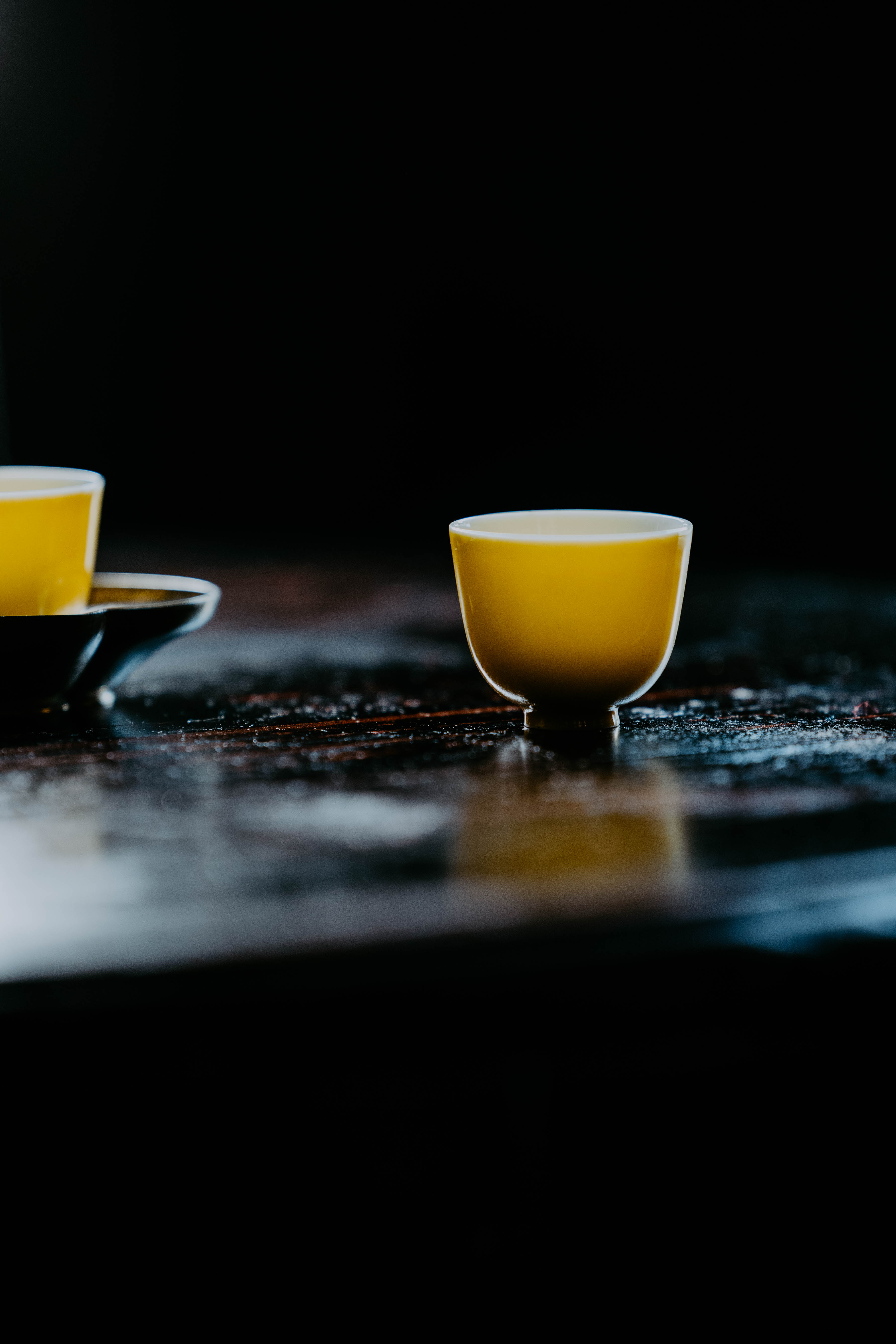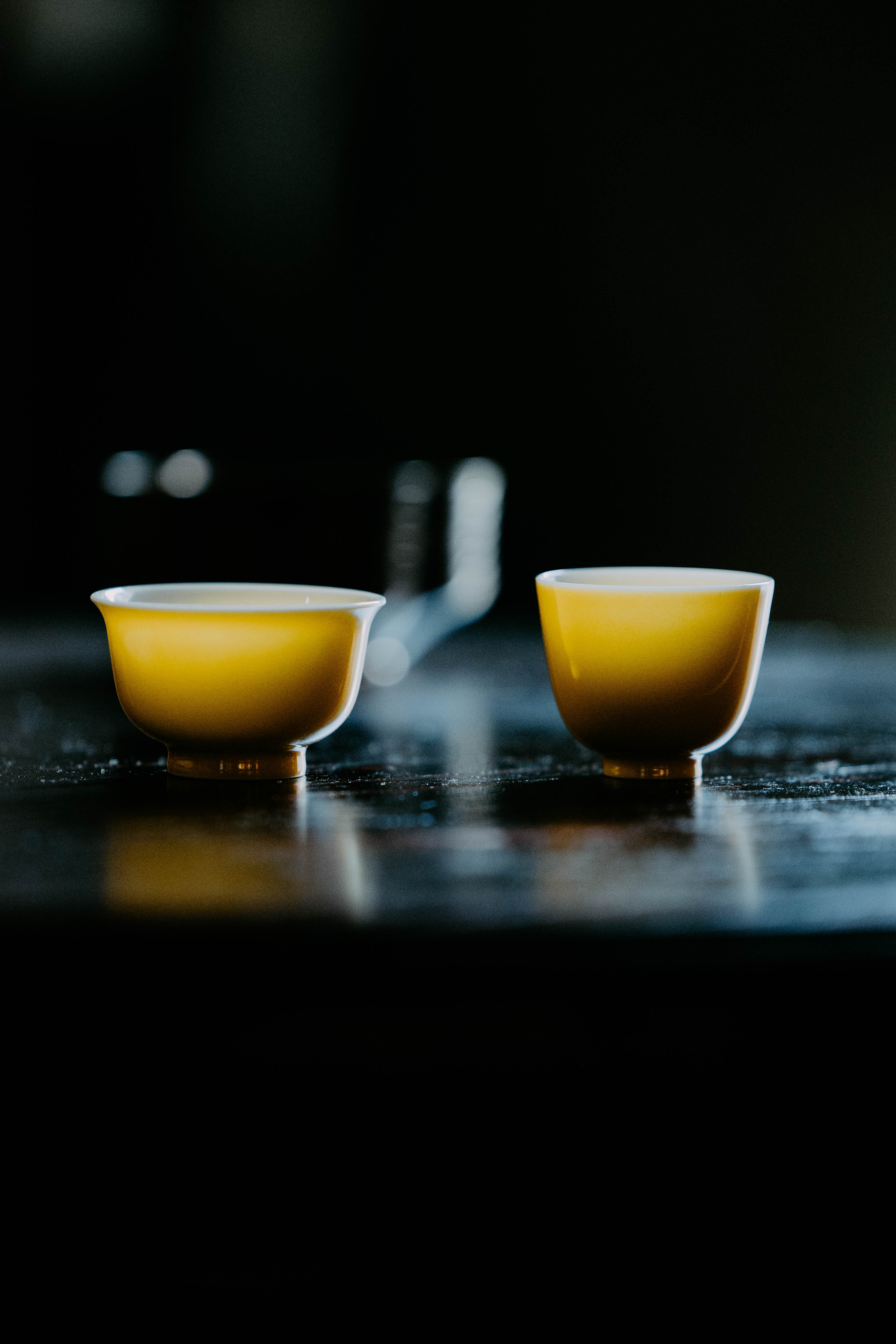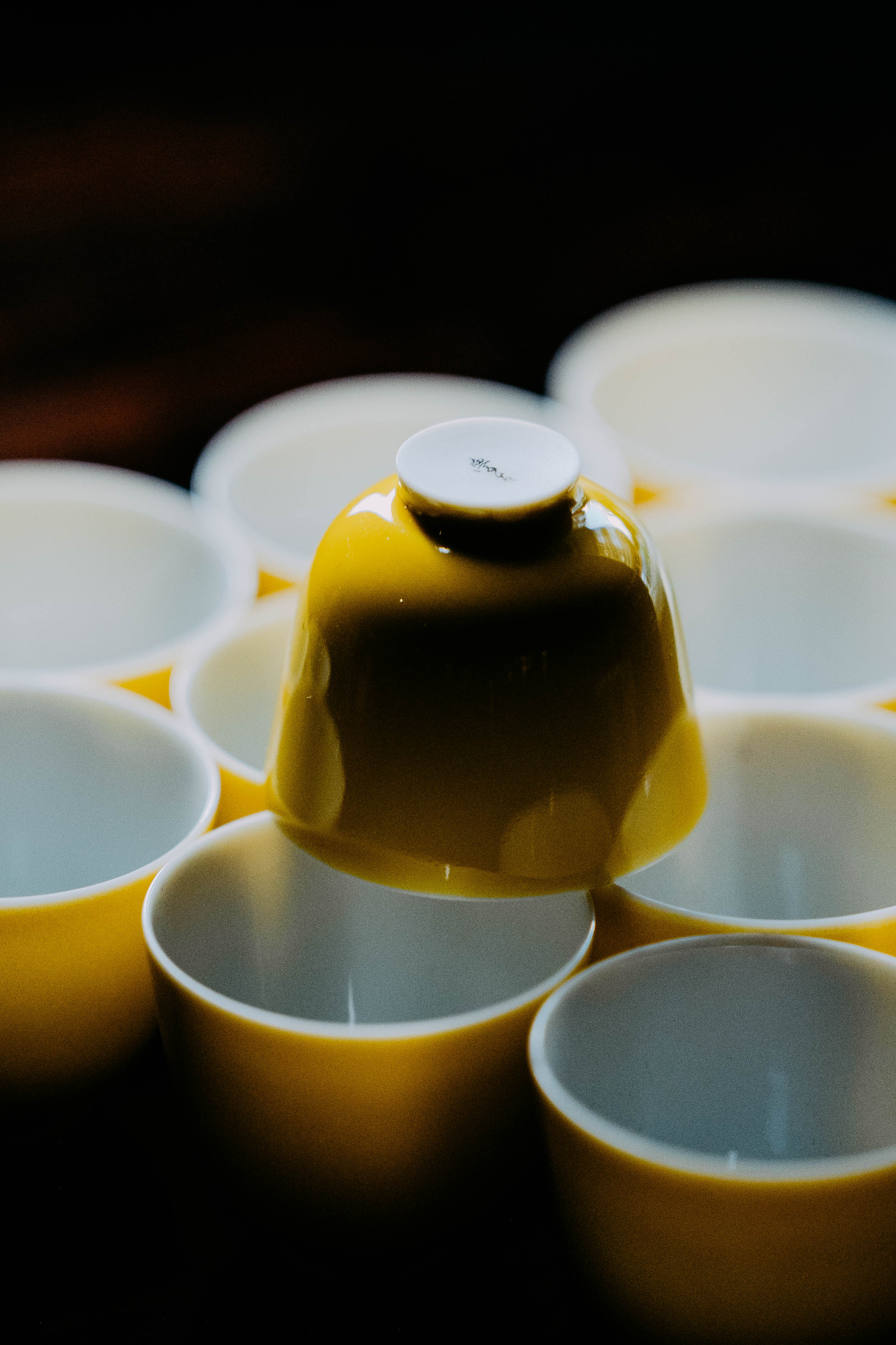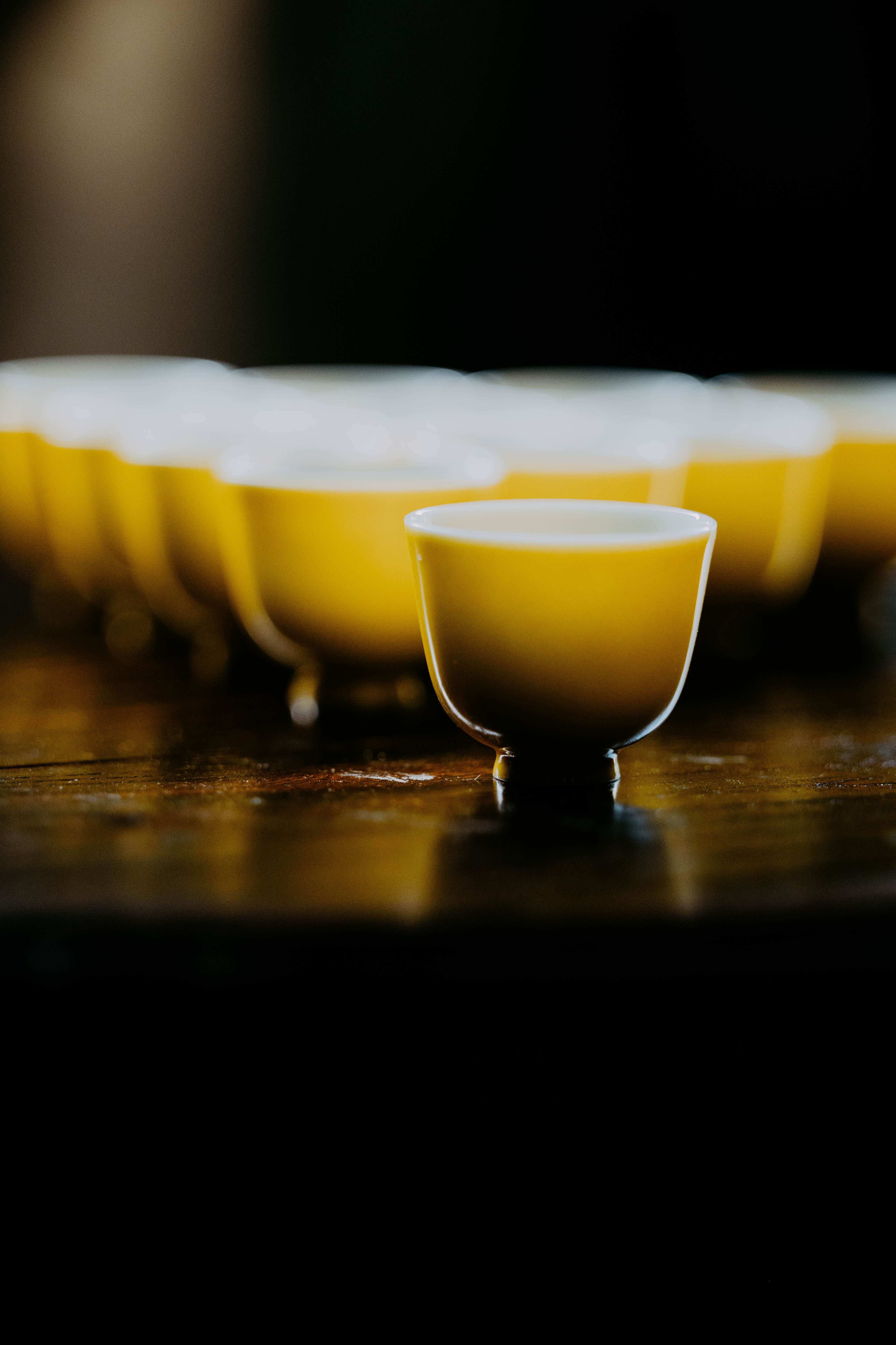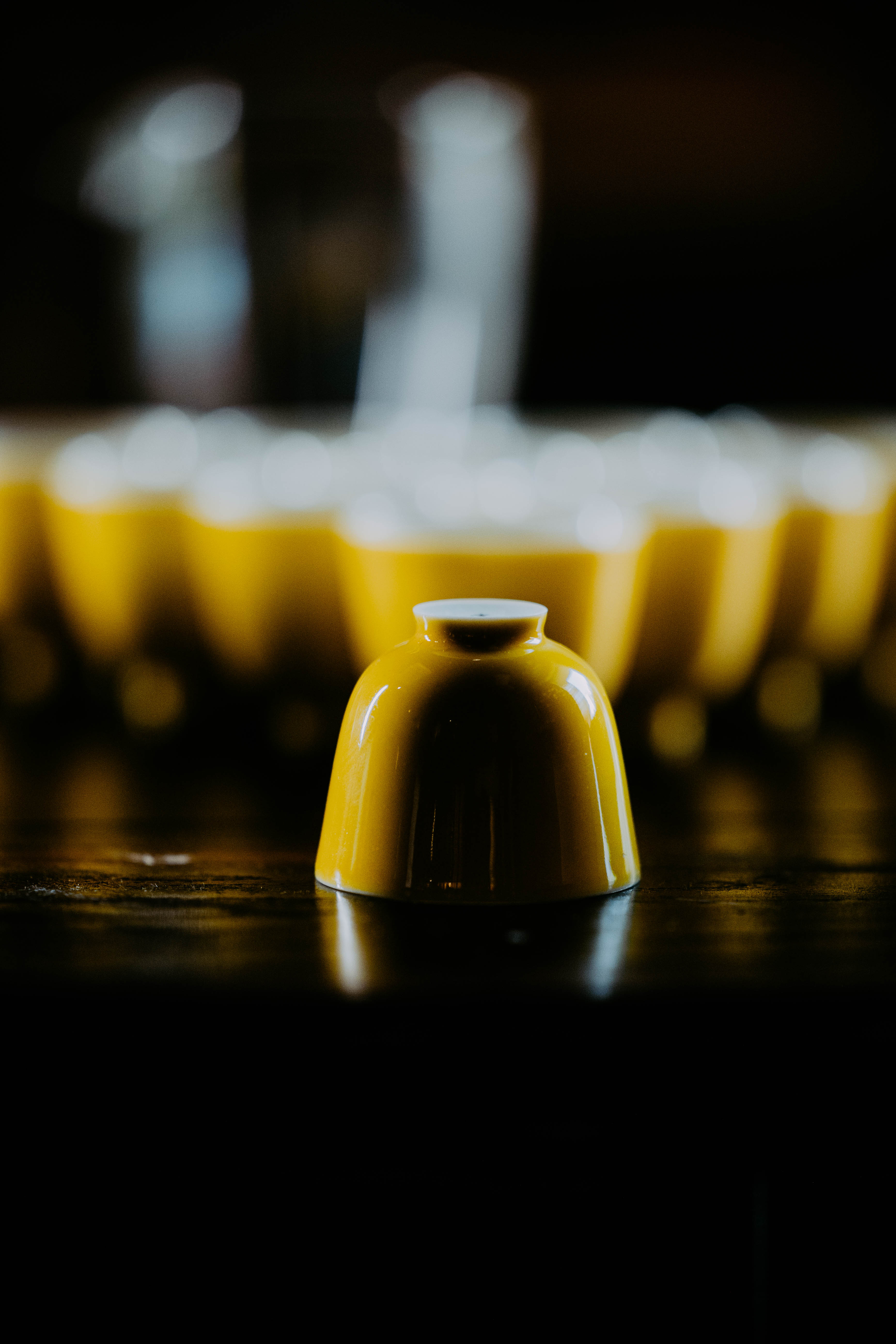小巧精美,轻薄胎体,精修成型。黄色釉面光泽质感如玉。或三或五陈列摆放,在茶席间与其他器物协调百搭,幽静雅致。是雅集活动中一款经典好看又好用的杯子。