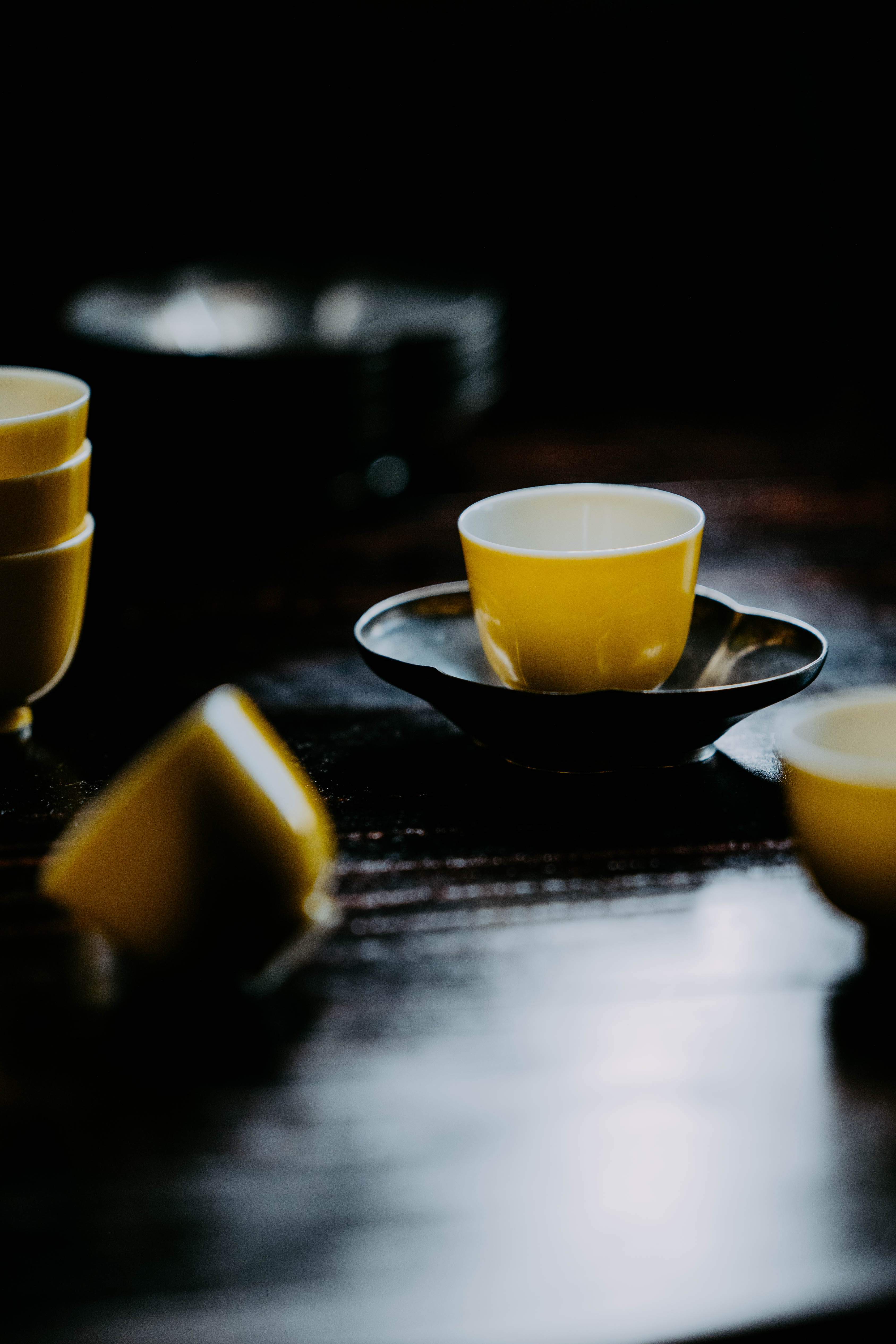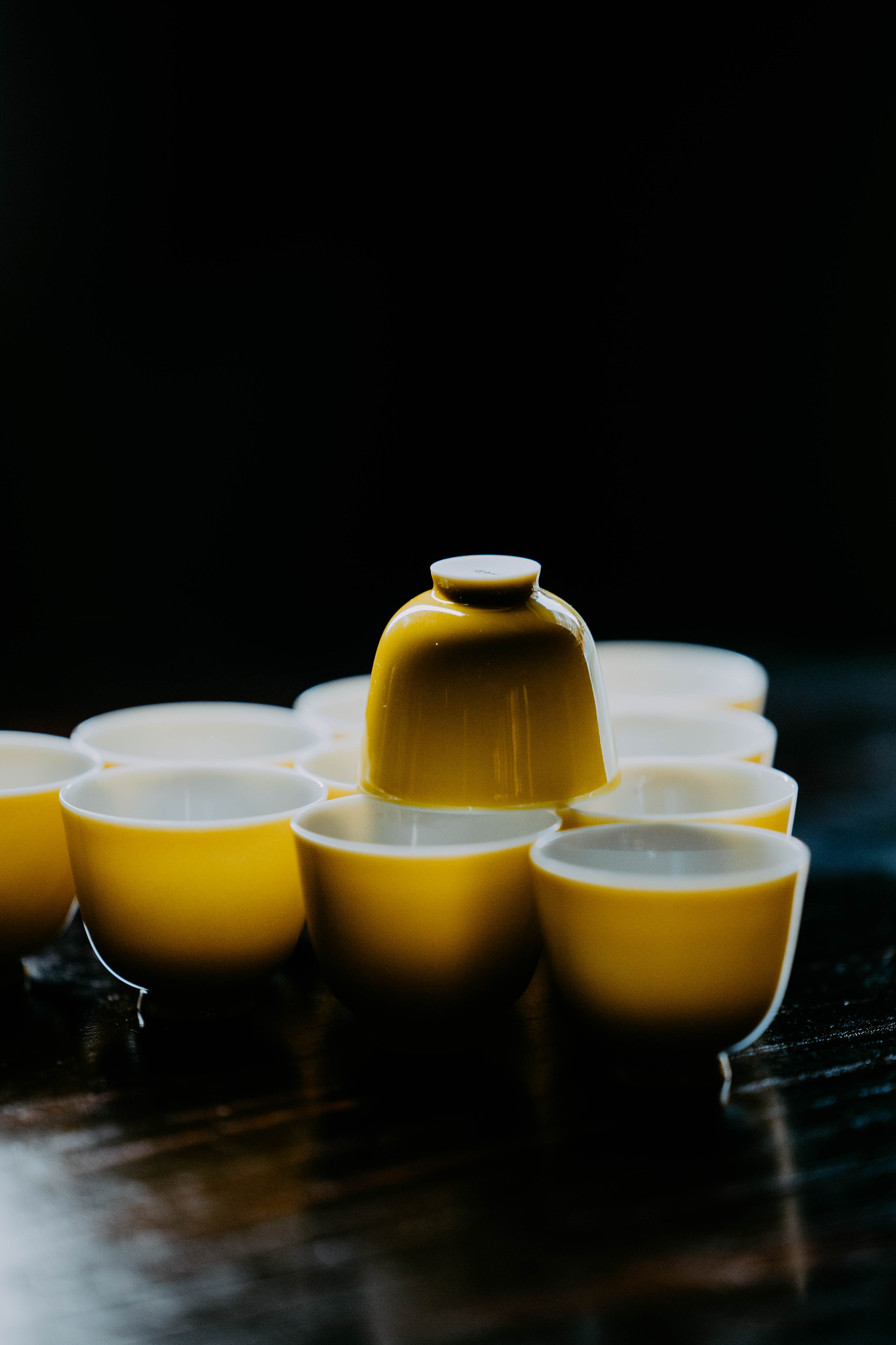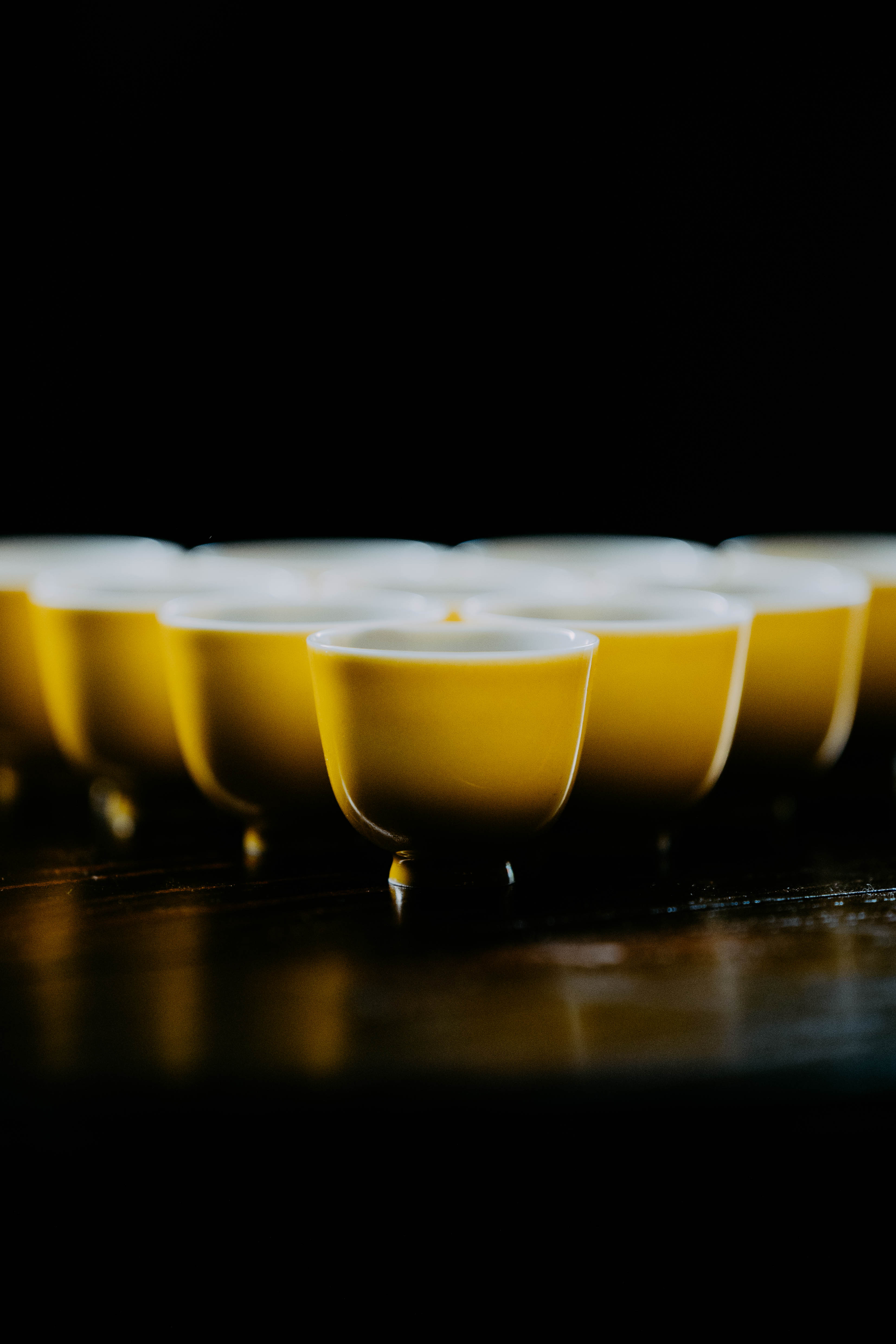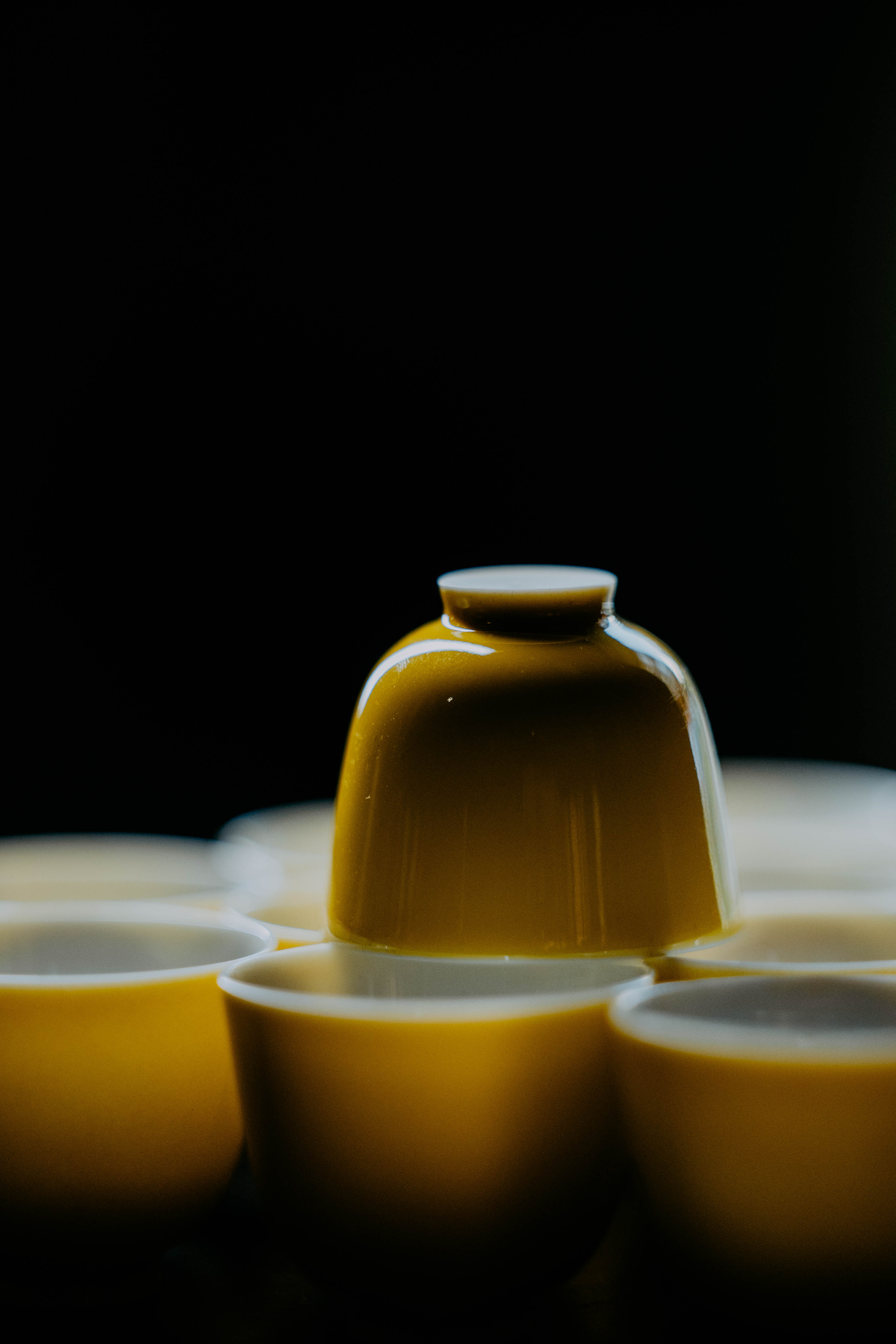 小巧精美,轻薄胎体,精修成型。黄色釉面光泽质感如玉。或三或五陈列摆放,在茶席间与其他器物协调百搭,幽静雅致。是雅集活动中一款经典好看又好用的杯子。