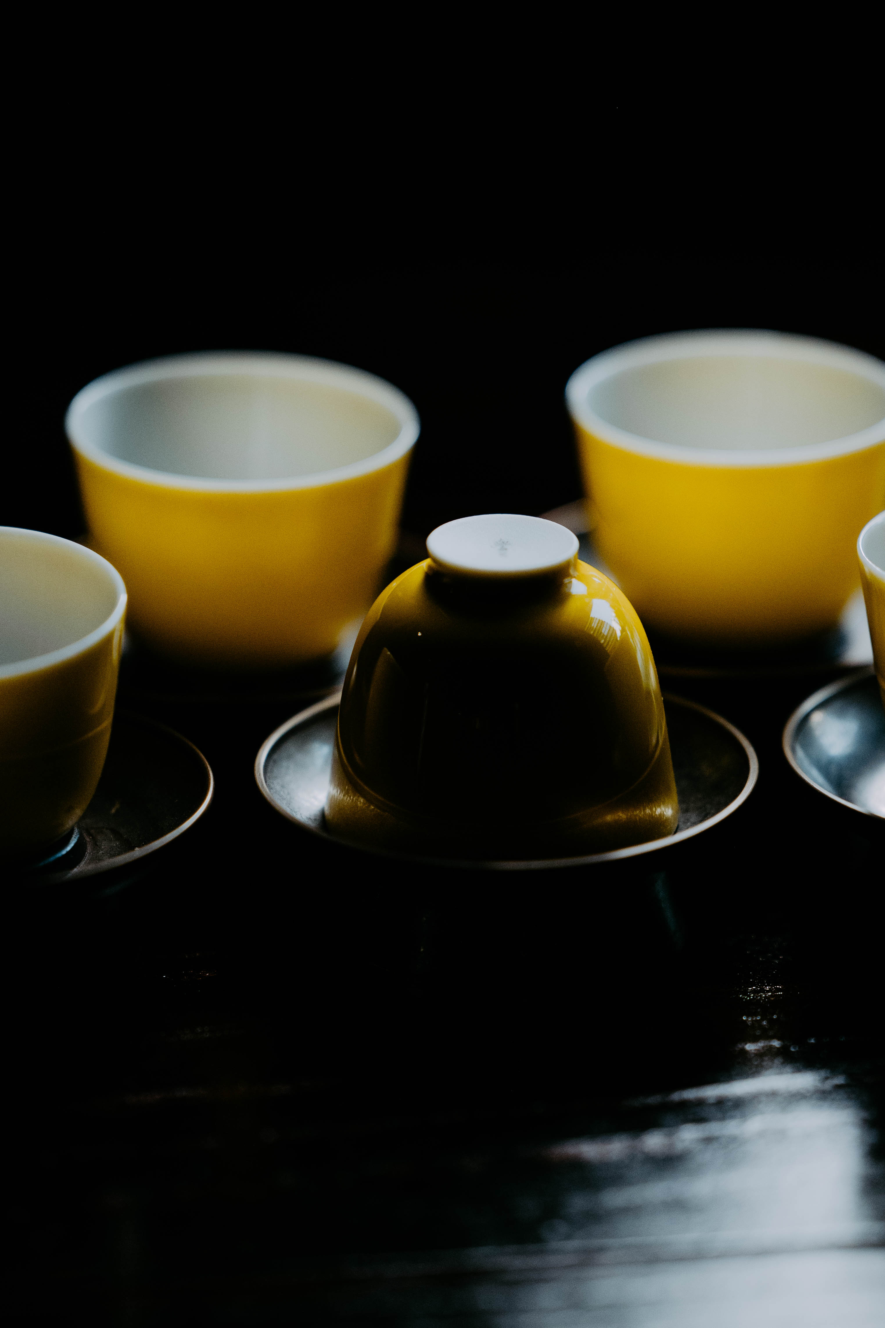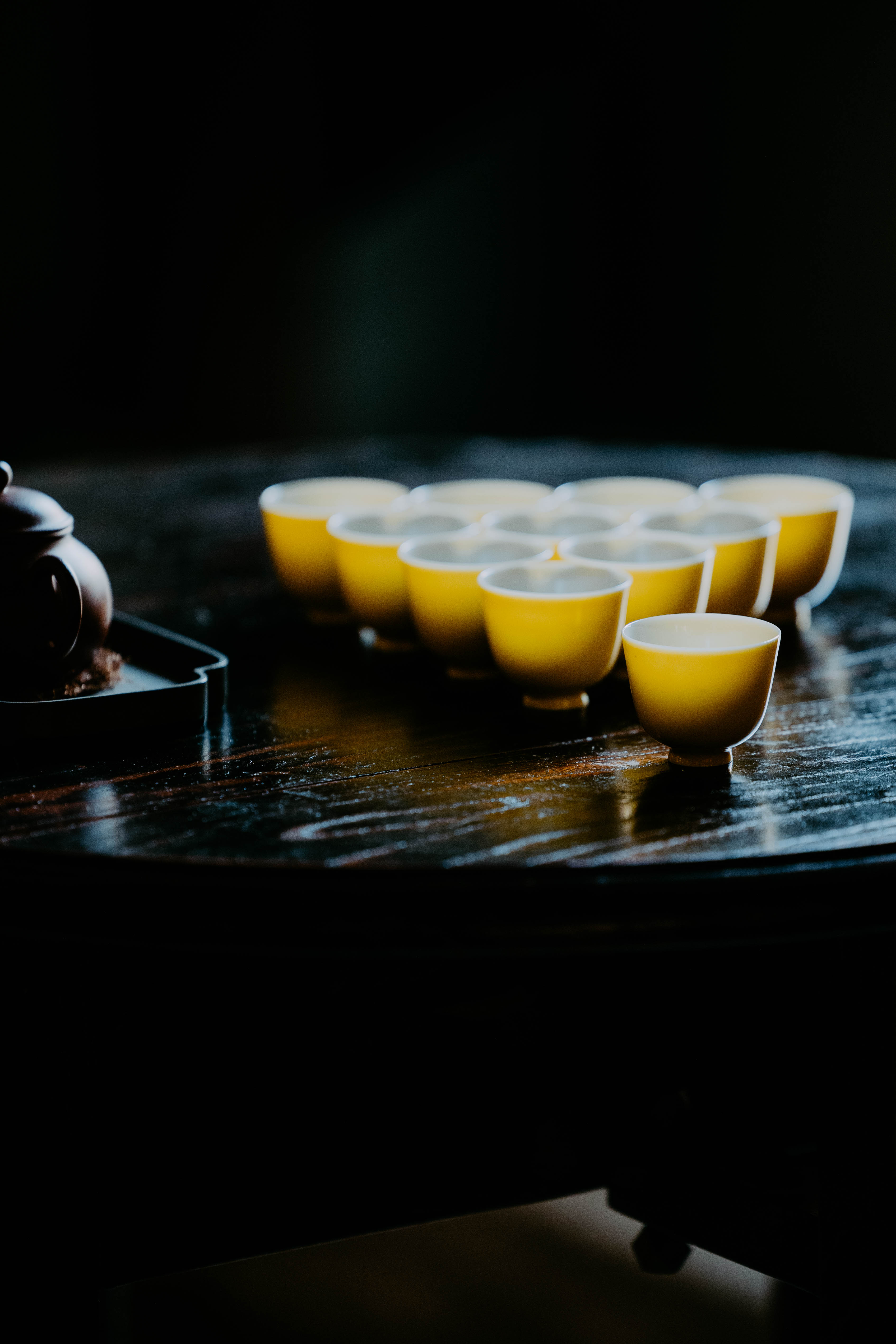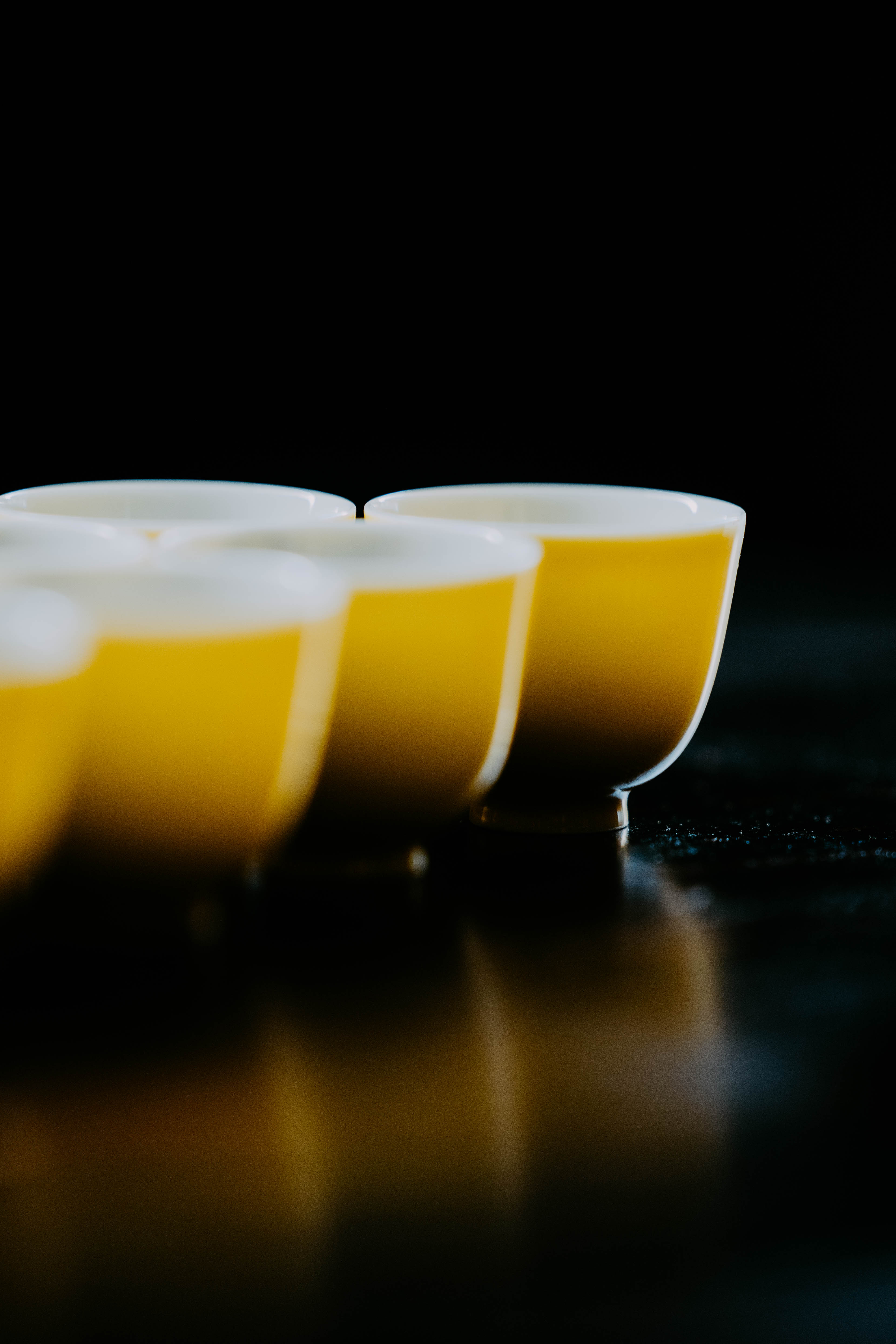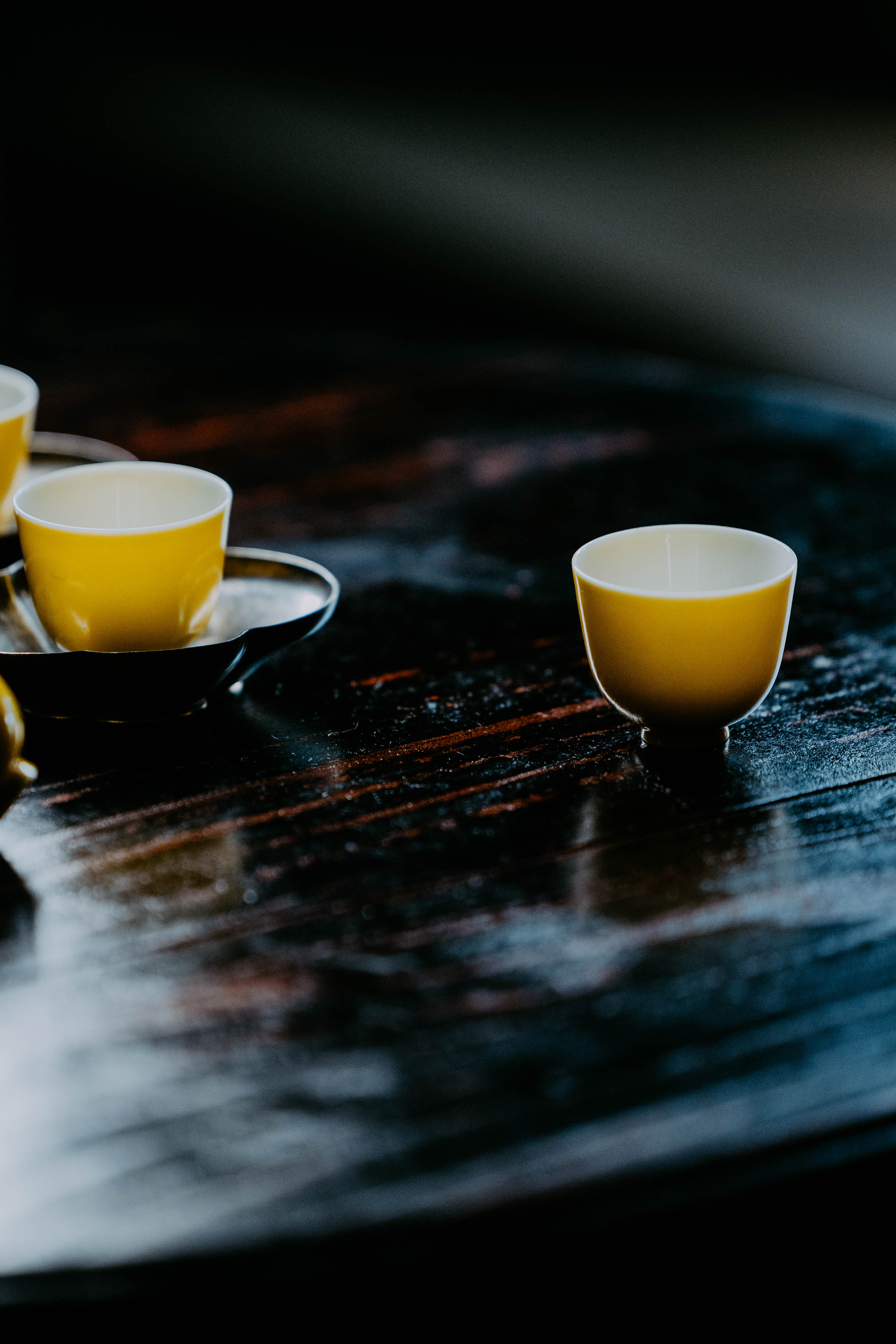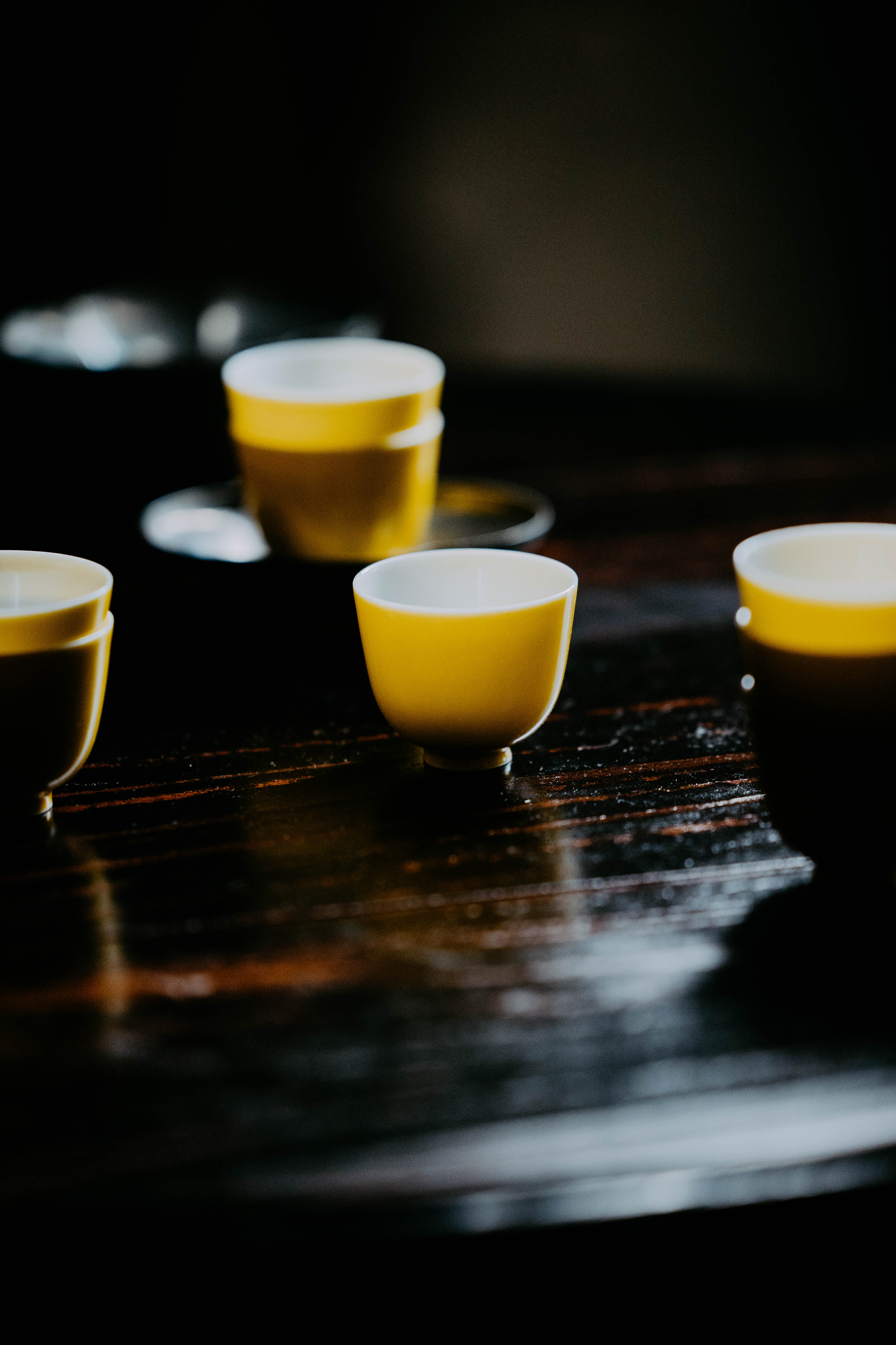 小巧精美,轻薄胎体,精修成型。黄色釉面光泽质感如玉。或三或五陈列摆放,在茶席间与其他器物协调百搭,幽静雅致。是雅集活动中一款经典好看又好用的杯子。