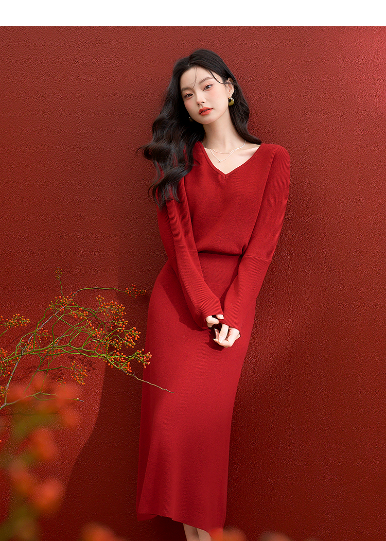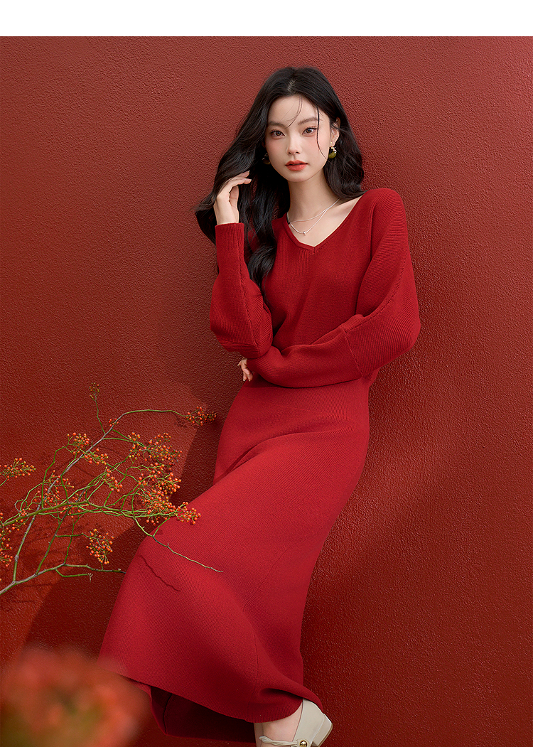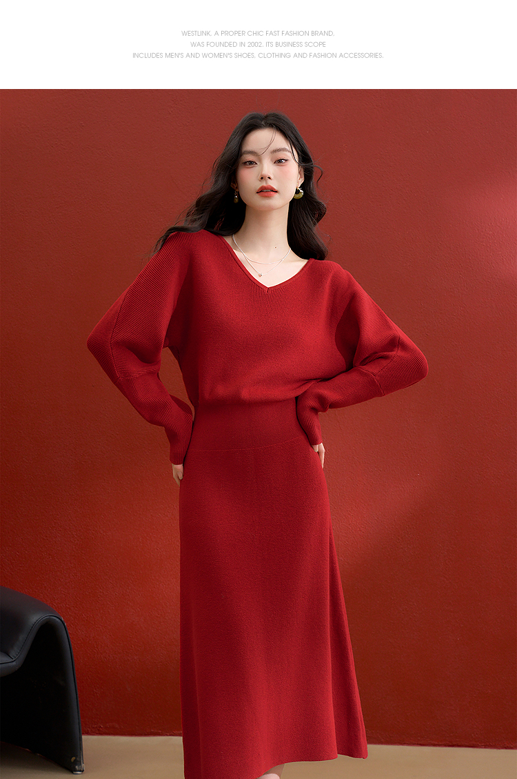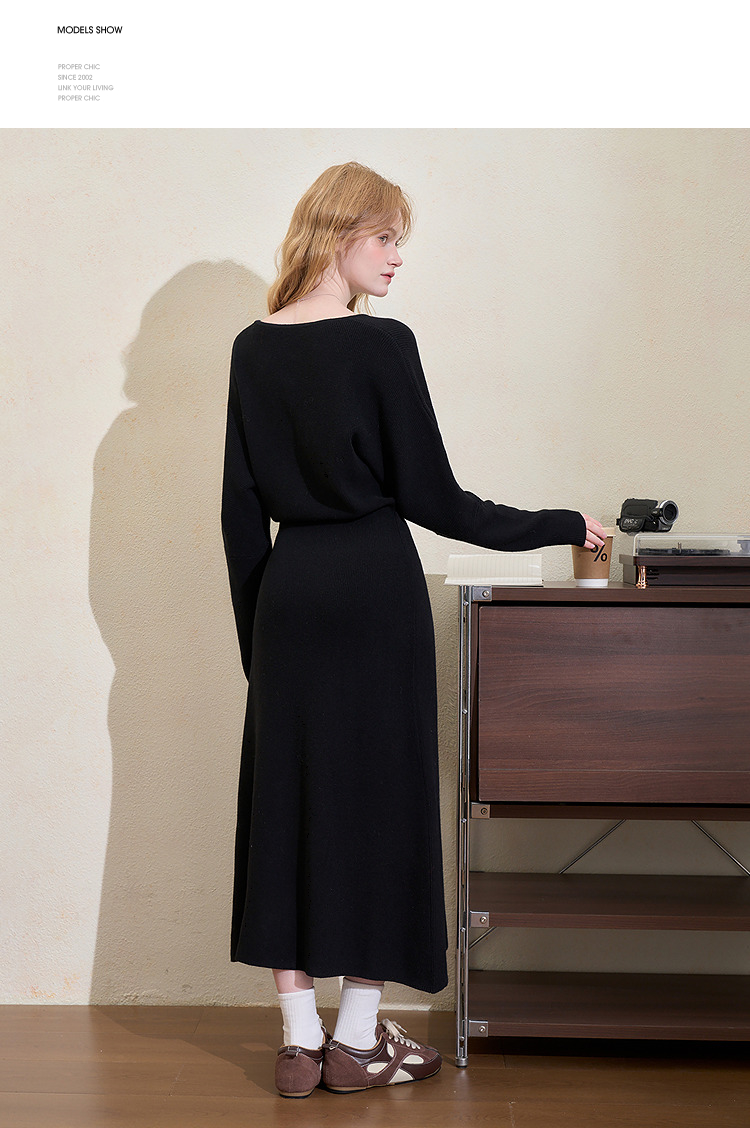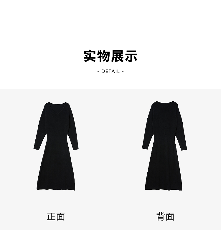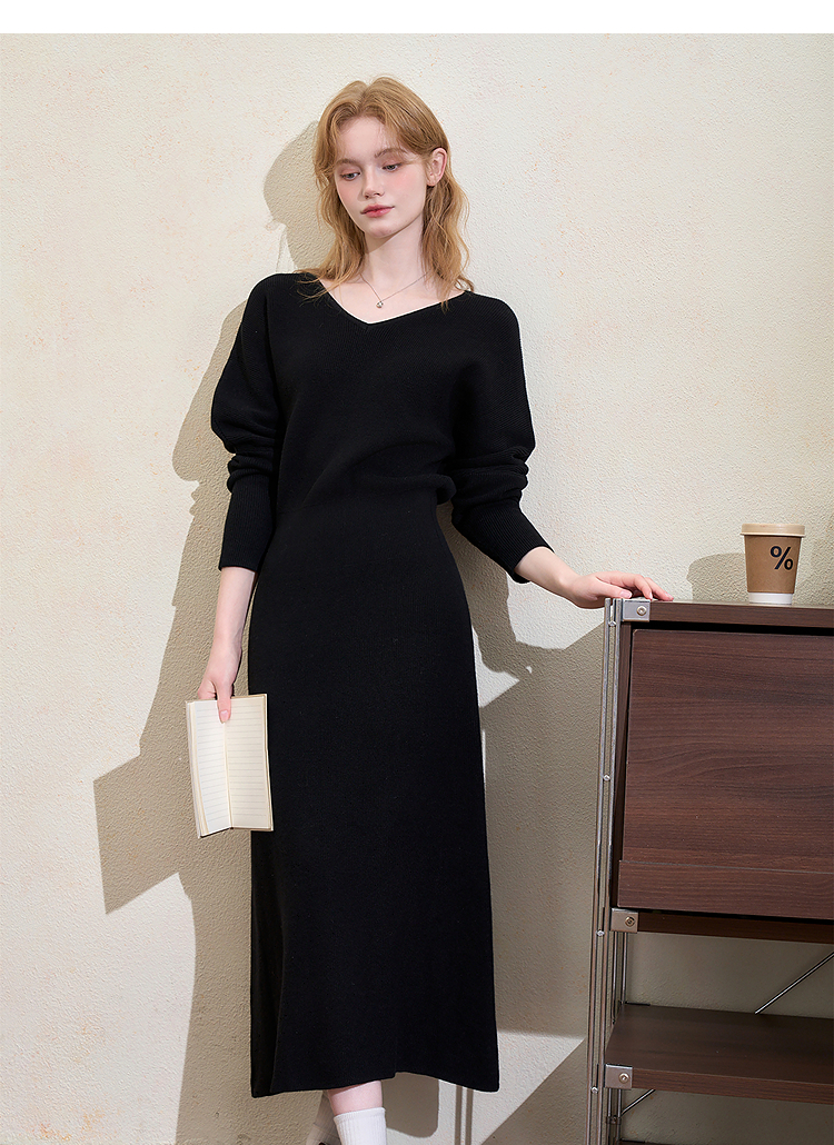 西遇气质V领长袖针织连衣裙女冬季软糯高级收腰显瘦内搭长裙V3855313