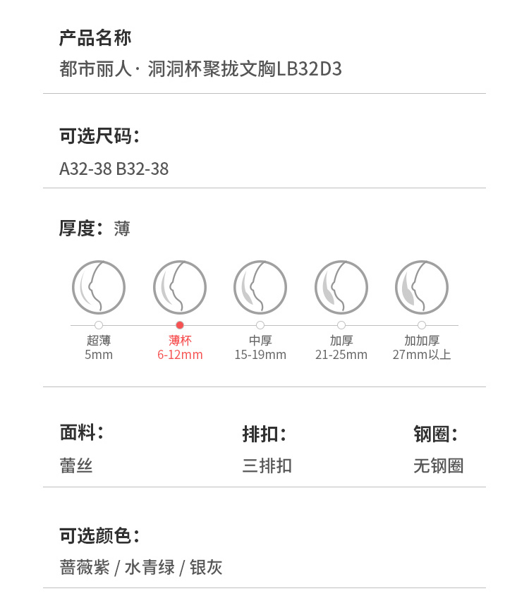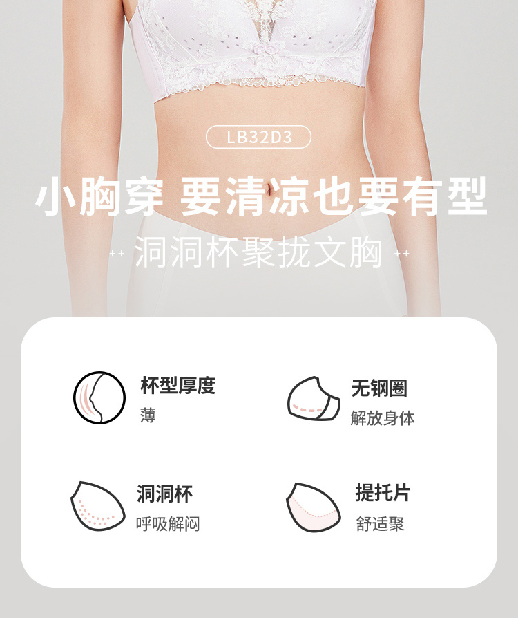 都市丽人WISECOOL内衣AB薄3/4杯蕾丝文胸三排无钢圈LB32D3