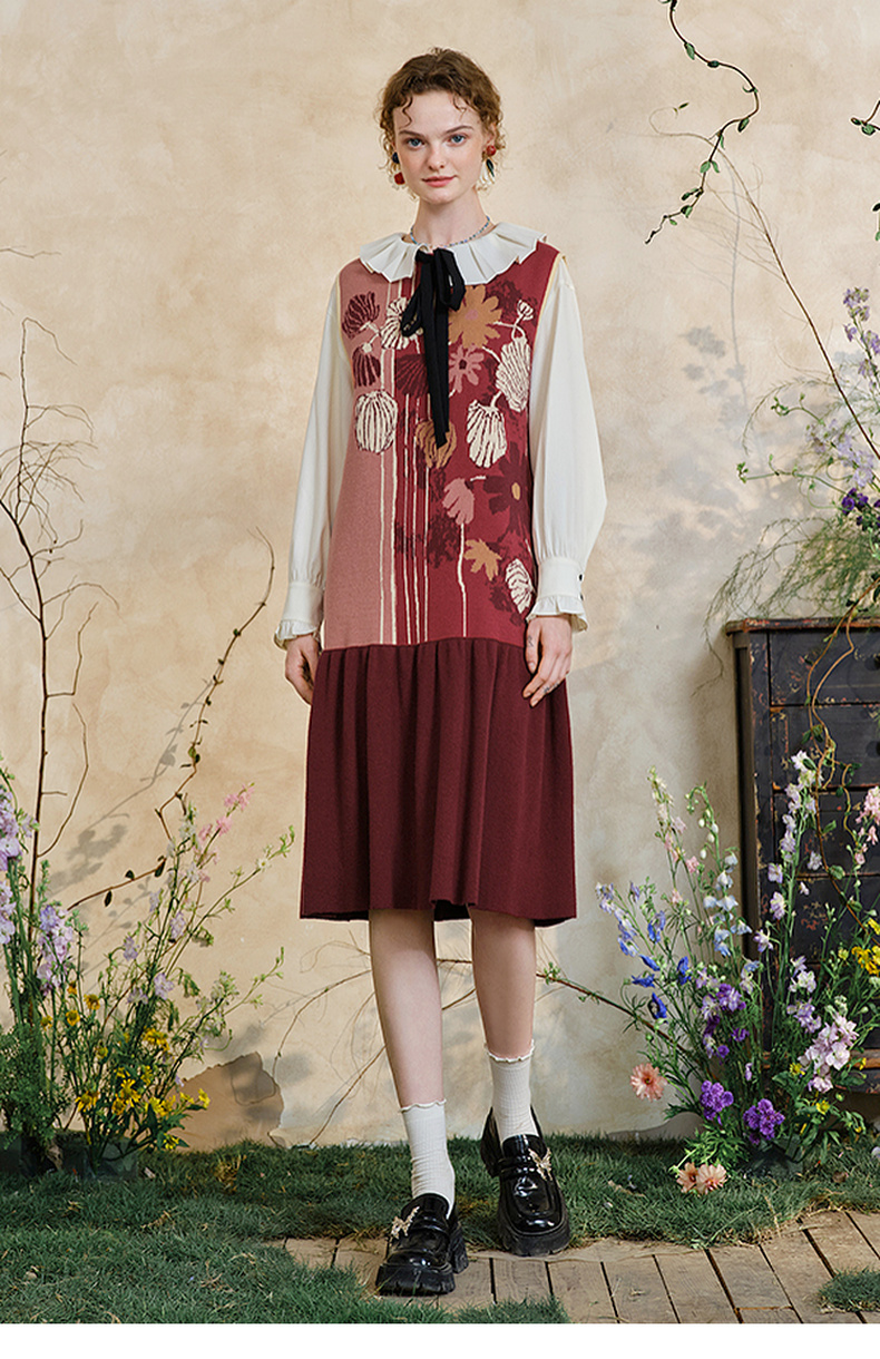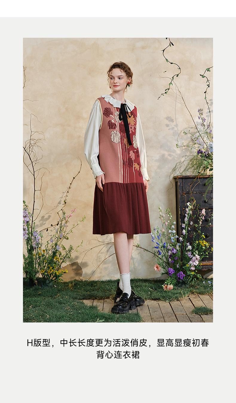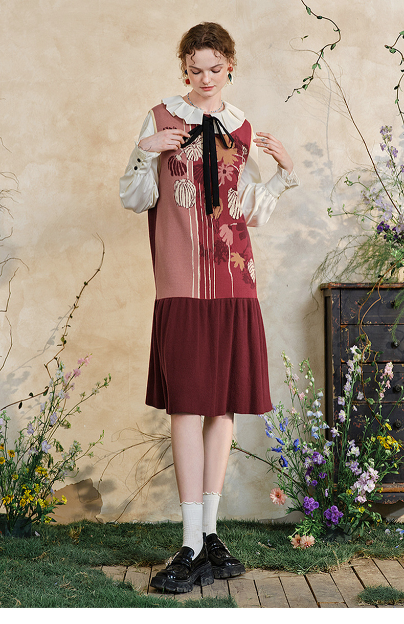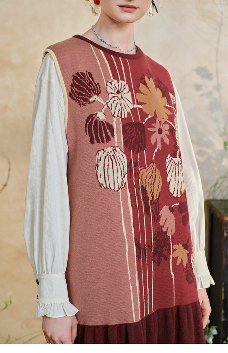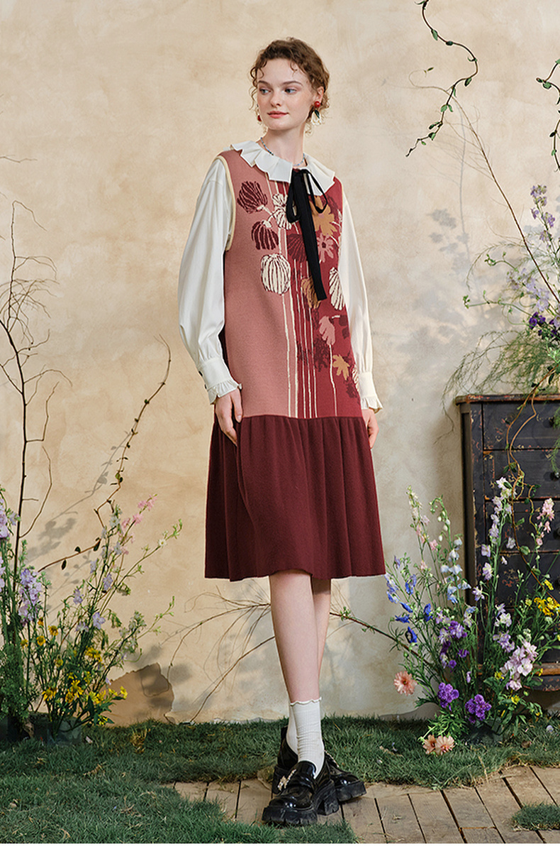 两三事 彼岸春诗 2025春季新款森女风花卉图案无袖毛衣裙连衣裙
