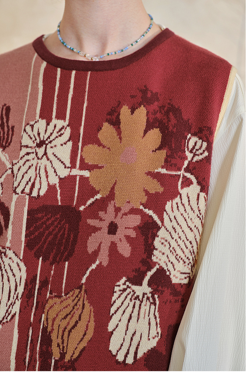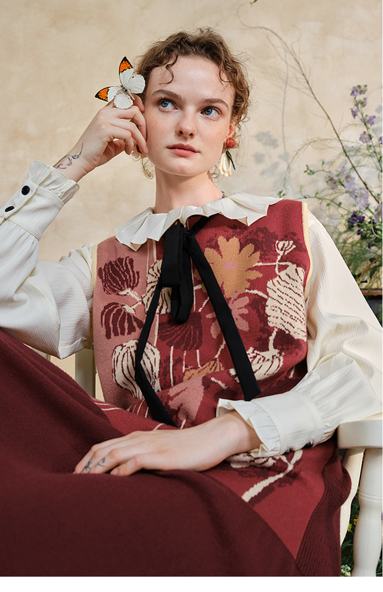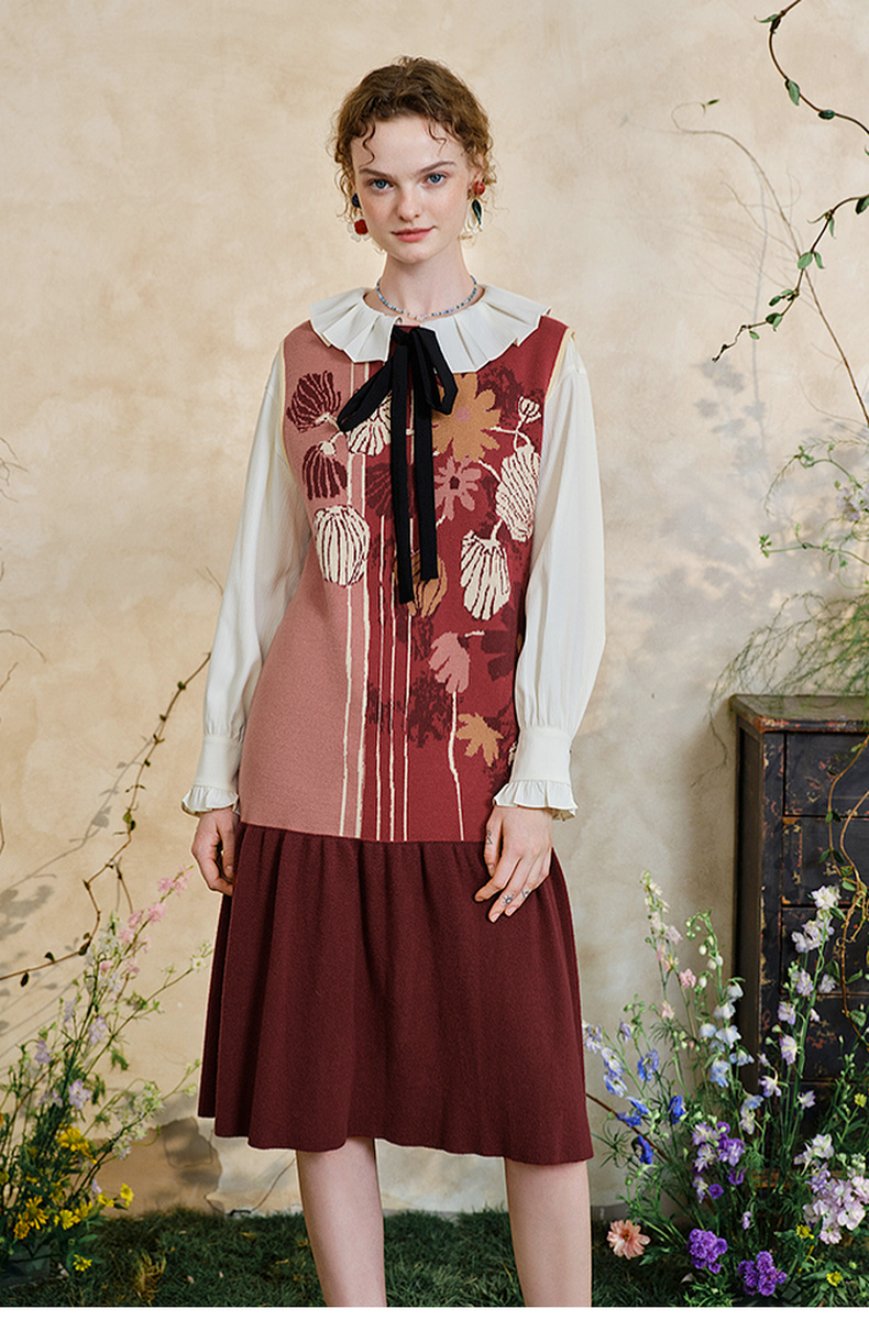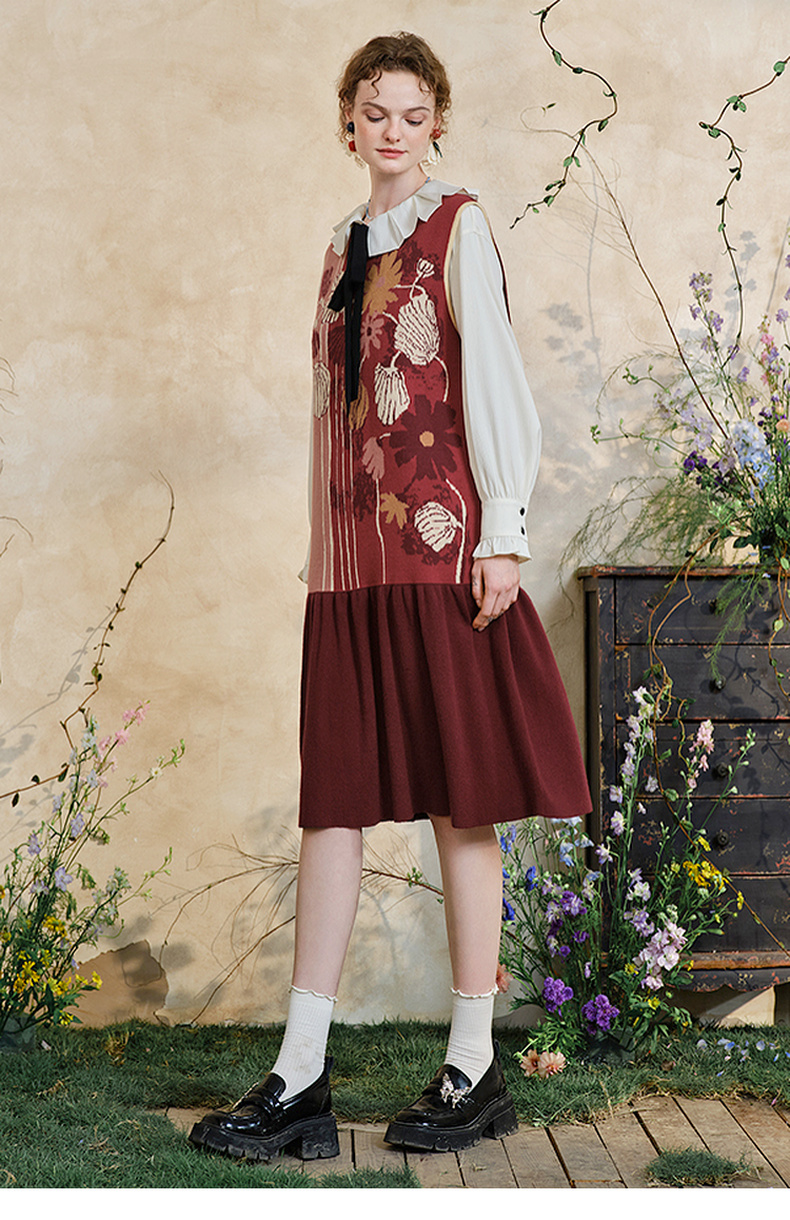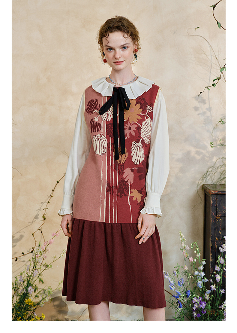 两三事 彼岸春诗 2025春季新款森女风花卉图案无袖毛衣裙连衣裙