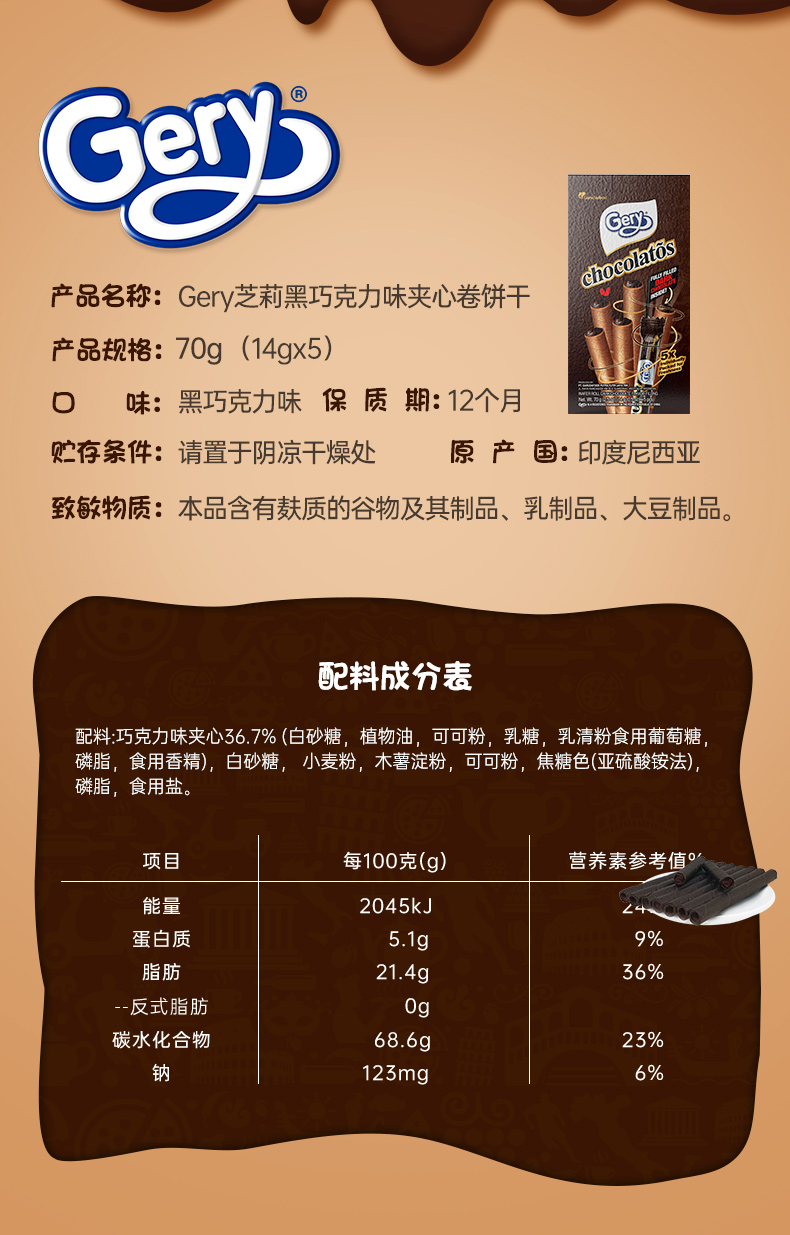 Gery芝莉黑巧克力味夹心卷饼干70g*4盒装进口【XPTX】