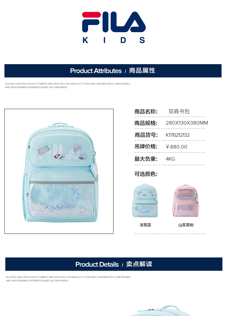 小斐乐女生小学生2022春季新款大容量书包K17B212132F